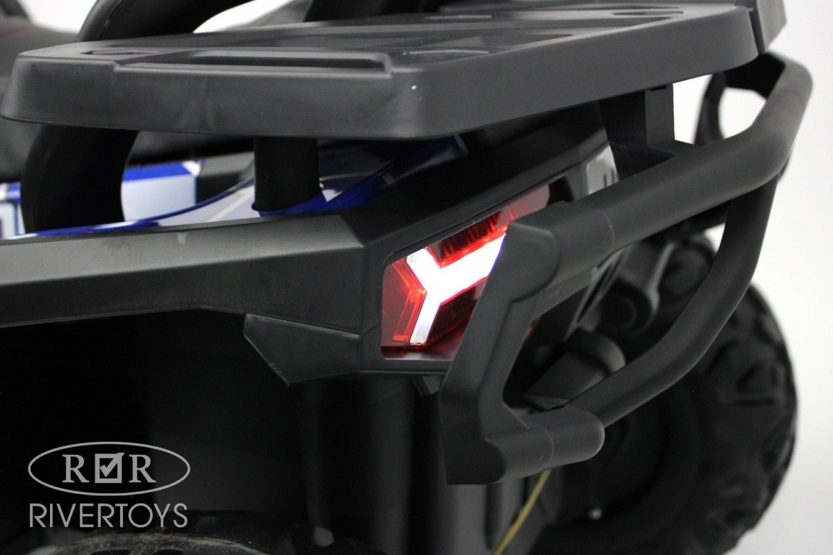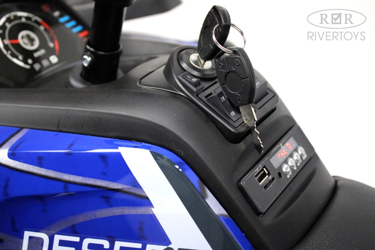 Отдельной кнопкой включается подсветка передних и задних фар. Хорошую проходимость обеспечивают большие резиновые колеса и высокий клиренс. На задних колесах установлены амортизаторы. Есть заводские мелодии. Запуск двигателя производится посредством ключа.