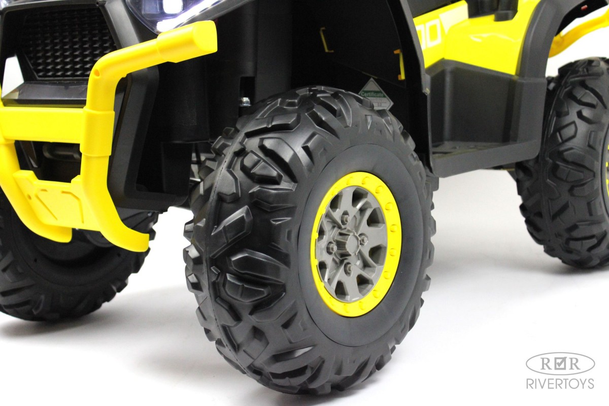 Отдельной кнопкой включается подсветка передних и задних фар. Хорошую проходимость обеспечивают большие резиновые колеса и высокий клиренс. На задних колесах установлены амортизаторы. Есть заводские мелодии. Запуск двигателя производится посредством ключа.