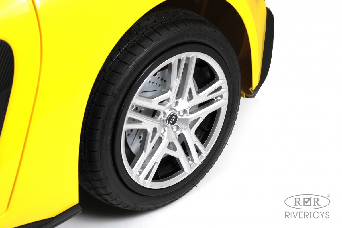 Электромобиль оборудован каучуковыми колесами, что обеспечивает хорошее сцепление с дорогой и долговечность. Открываются двери и капот, что добавляет удобства при использовании.