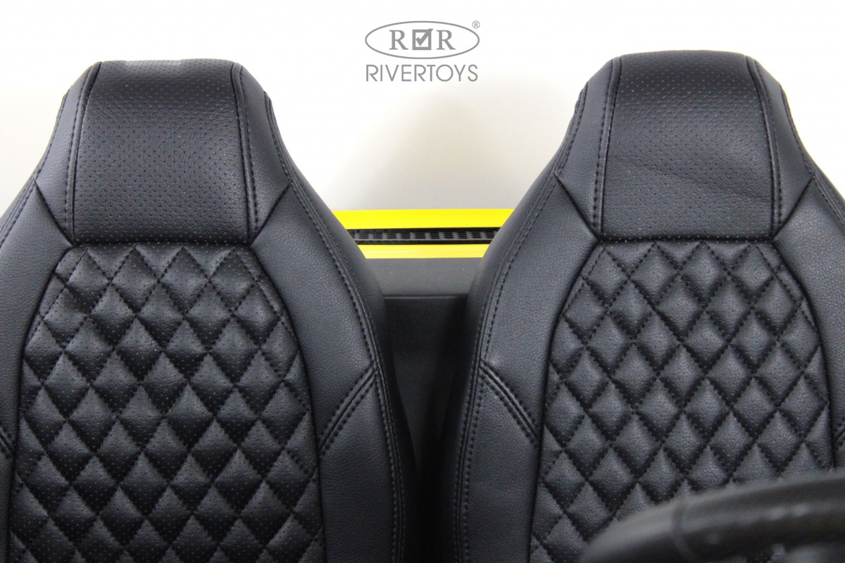 Электромобиль оснащен двумя сиденьями, выполненными из эко-кожи. Они могут двигаться вперед и назад, что позволяет ребенку самостоятельно выбирать удобное положение. Также предусмотрены ремни безопасности, которые фиксируются сбоку.
