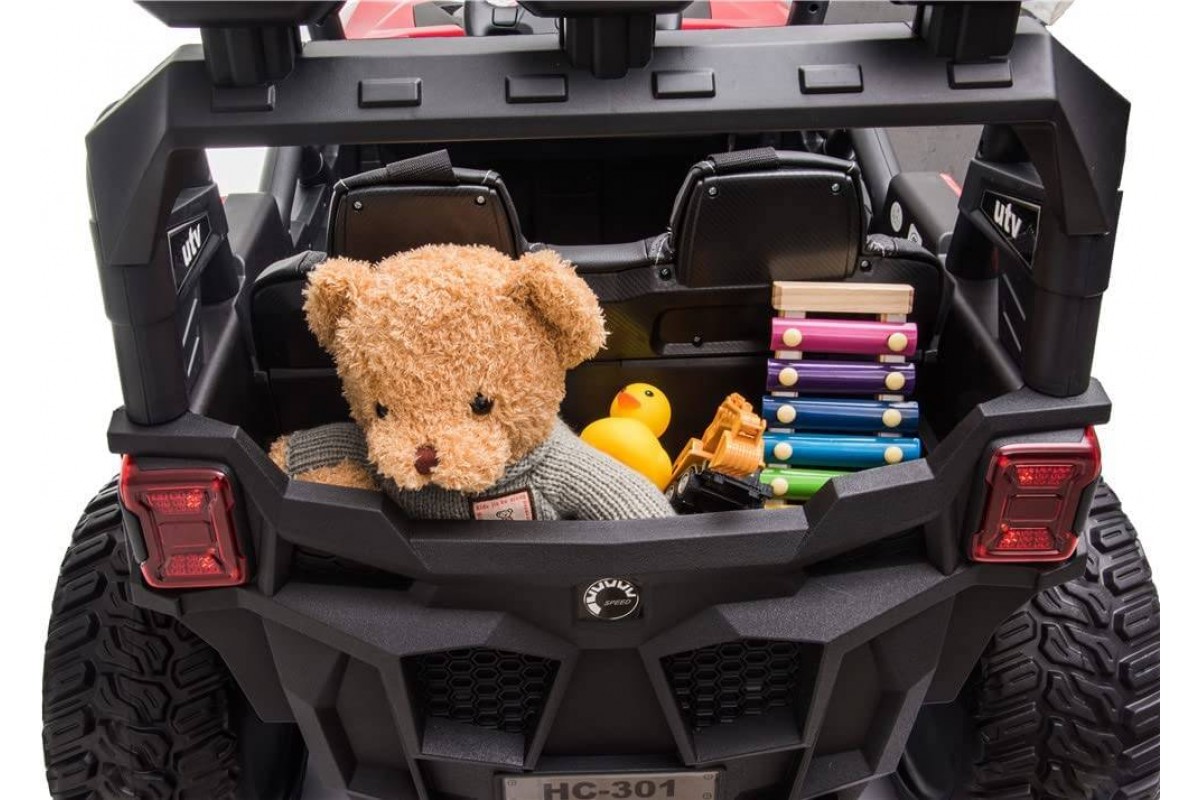 Модель оснащена так же каучуковыми колесами, креслом из эко кожи, пультом для родителей. Из декоративных и развлекательных элементов модель имеет подсветку фар и встроенную магнитолу для прослушивания штатных мелодий или музыки с флеш карты.