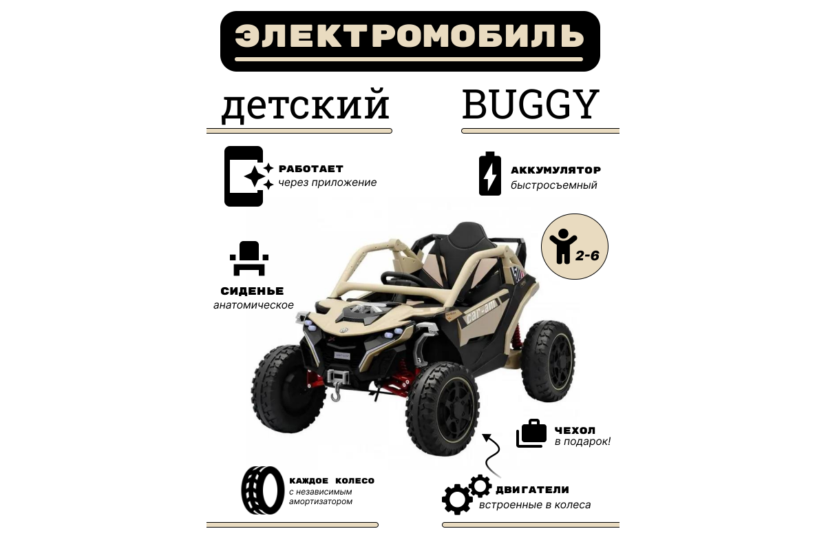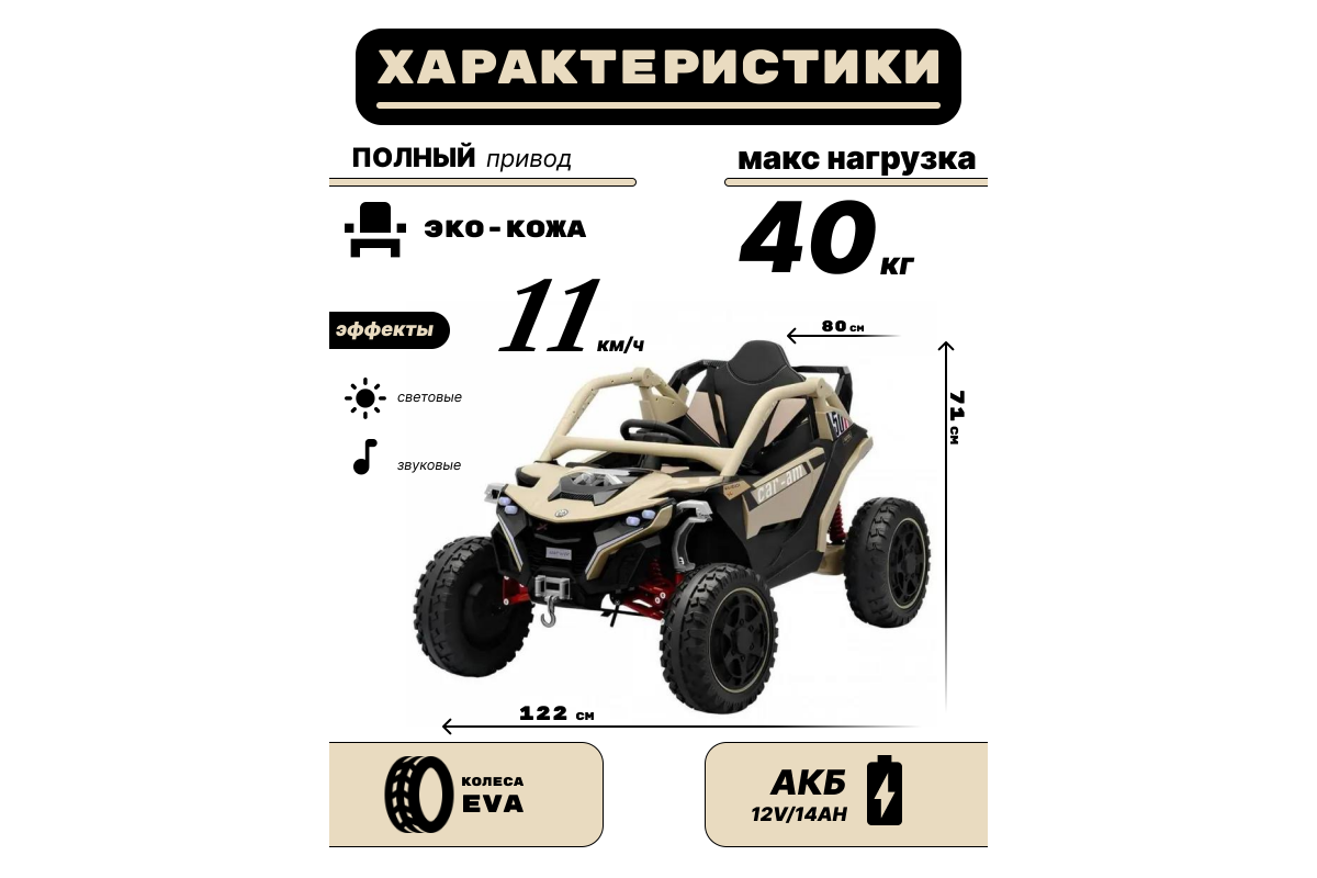 Багги имеет обширный функционал, который сделает незабываемыми, впечатления юного гонщика. Машинка умеет разгонятся до 11 км/ч., за счёт двигателей, встроенных прямо в колеса. Скорость регулируется как с пульта д.у., так и с торпеды авто, специальным переключателем. Имеется педаль газа и педаль тормоза. Остановить машинку можно с пульта, или же отпустив педаль газа, при этом педаль тормоза можно не использовать, она больше нужна для развития навыков управления у малыша.