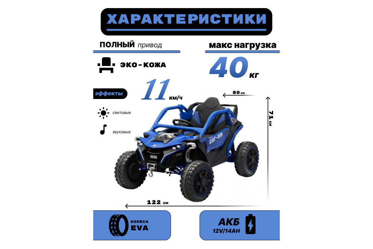 Багги имеет обширный функционал, который сделает незабываемыми, впечатления юного гонщика. Машинка умеет разгонятся до 11 км/ч., за счёт двигателей, встроенных прямо в колеса. Скорость регулируется как с пульта д.у., так и с торпеды авто, специальным переключателем. Имеется педаль газа и педаль тормоза. Остановить машинку можно с пульта, или же отпустив педаль газа, при этом педаль тормоза можно не использовать, она больше нужна для развития навыков управления у малыша.