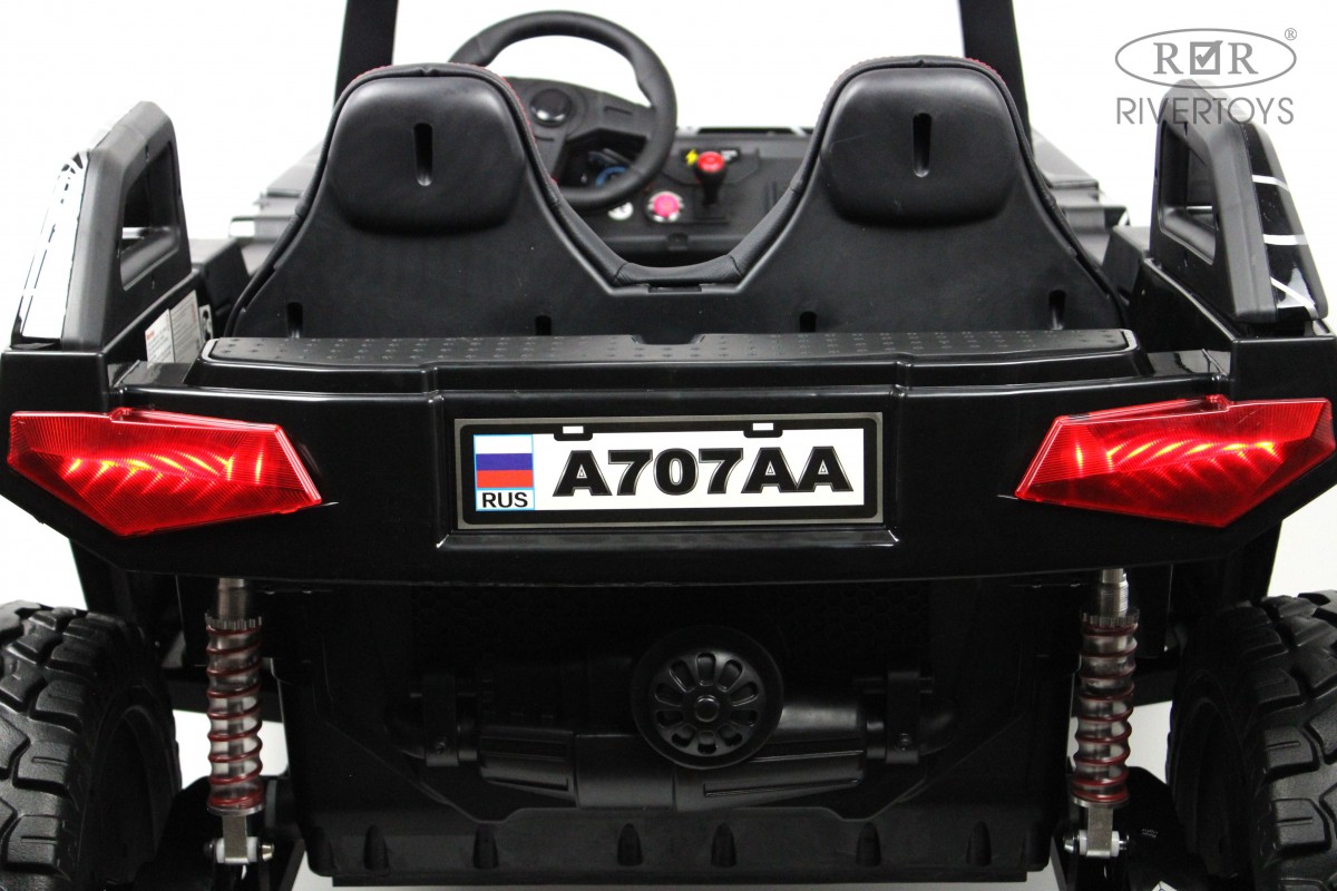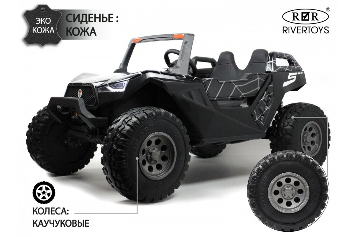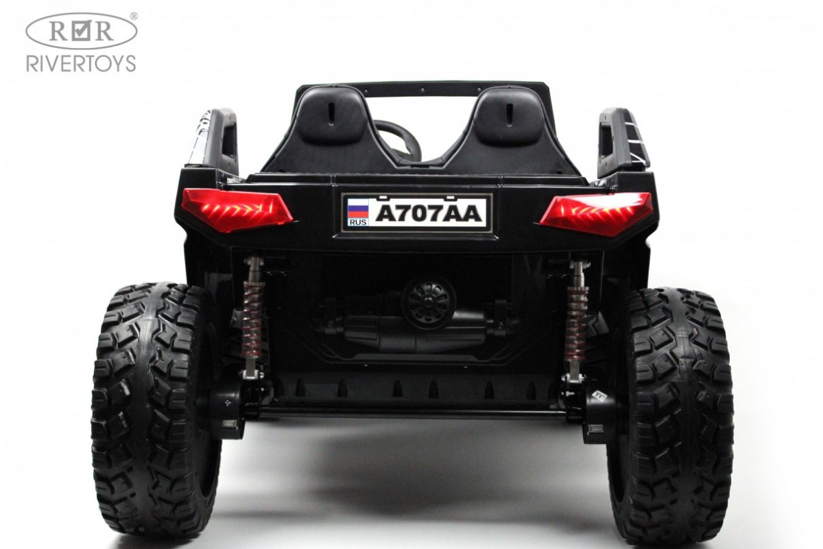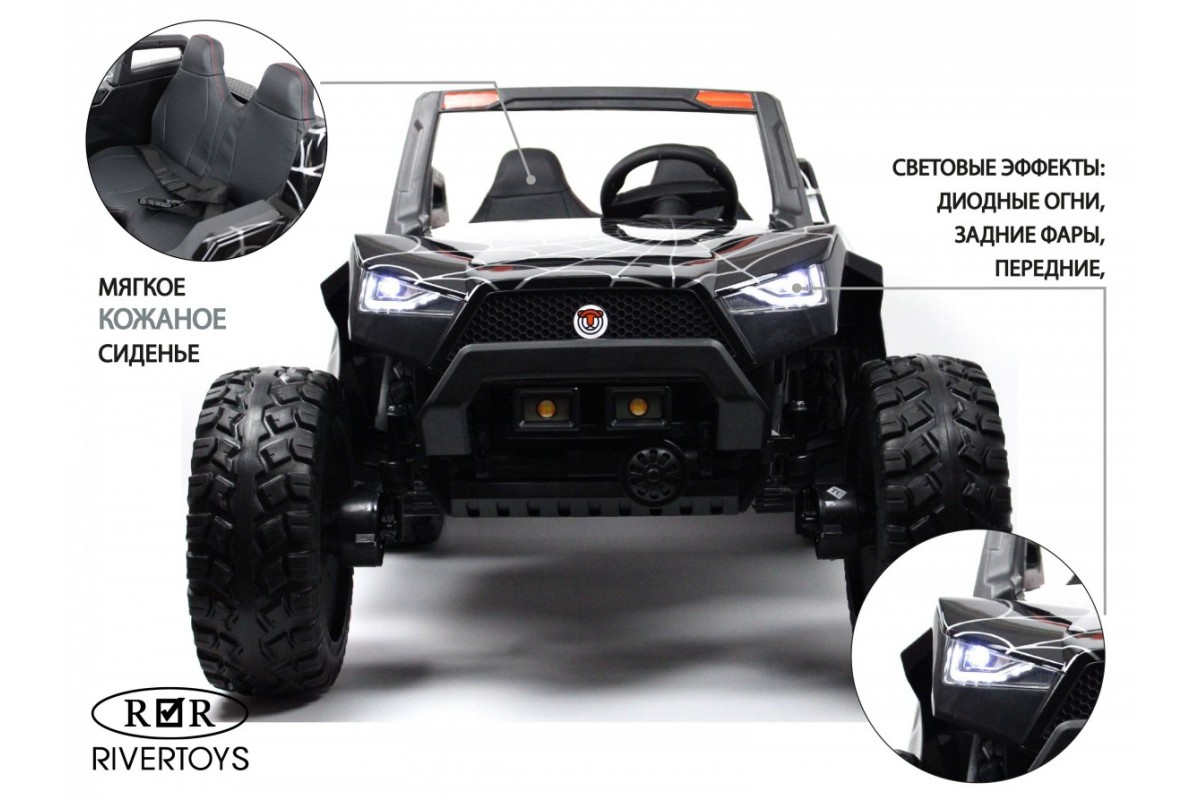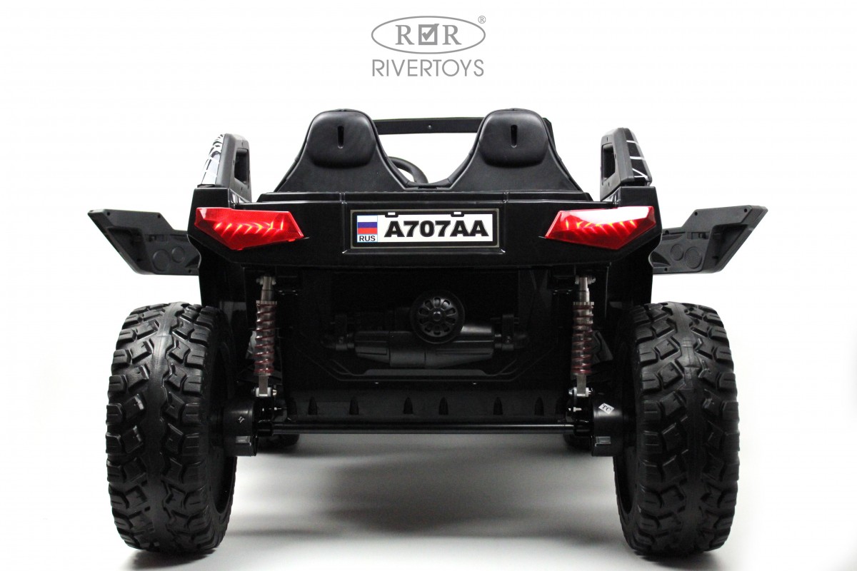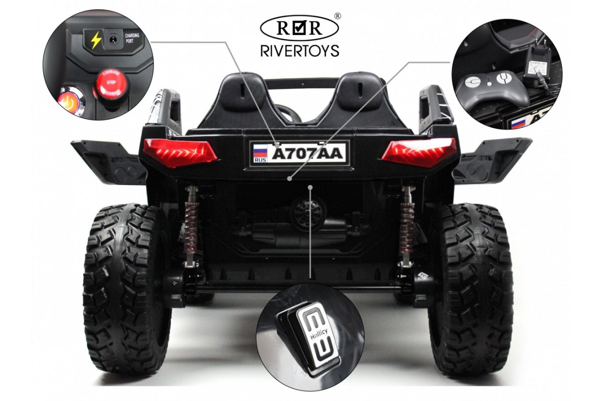 RiverToys Buggy 4WD A707AA – большой полноприводный электромобиль для 2-х детей. Этот вездеход оснащен большими резиновыми колесами и имеет высокий клиренс. Низкие дверцы могут открываться и закрываться на специальные замки. Просторный салон вмещает в себя двухместное кресло с кожаным чехлом, спинкой и 2 подголовниками.