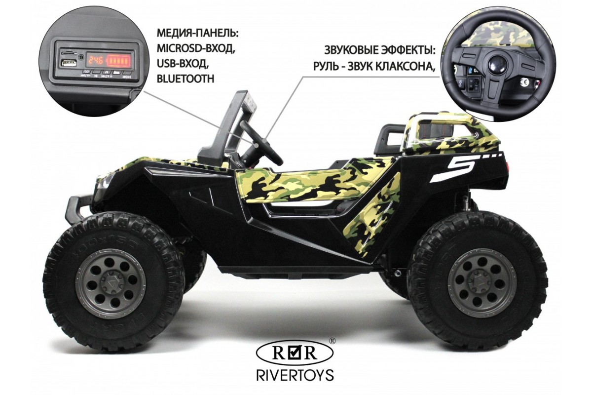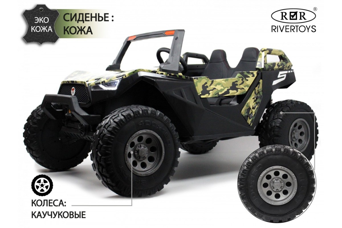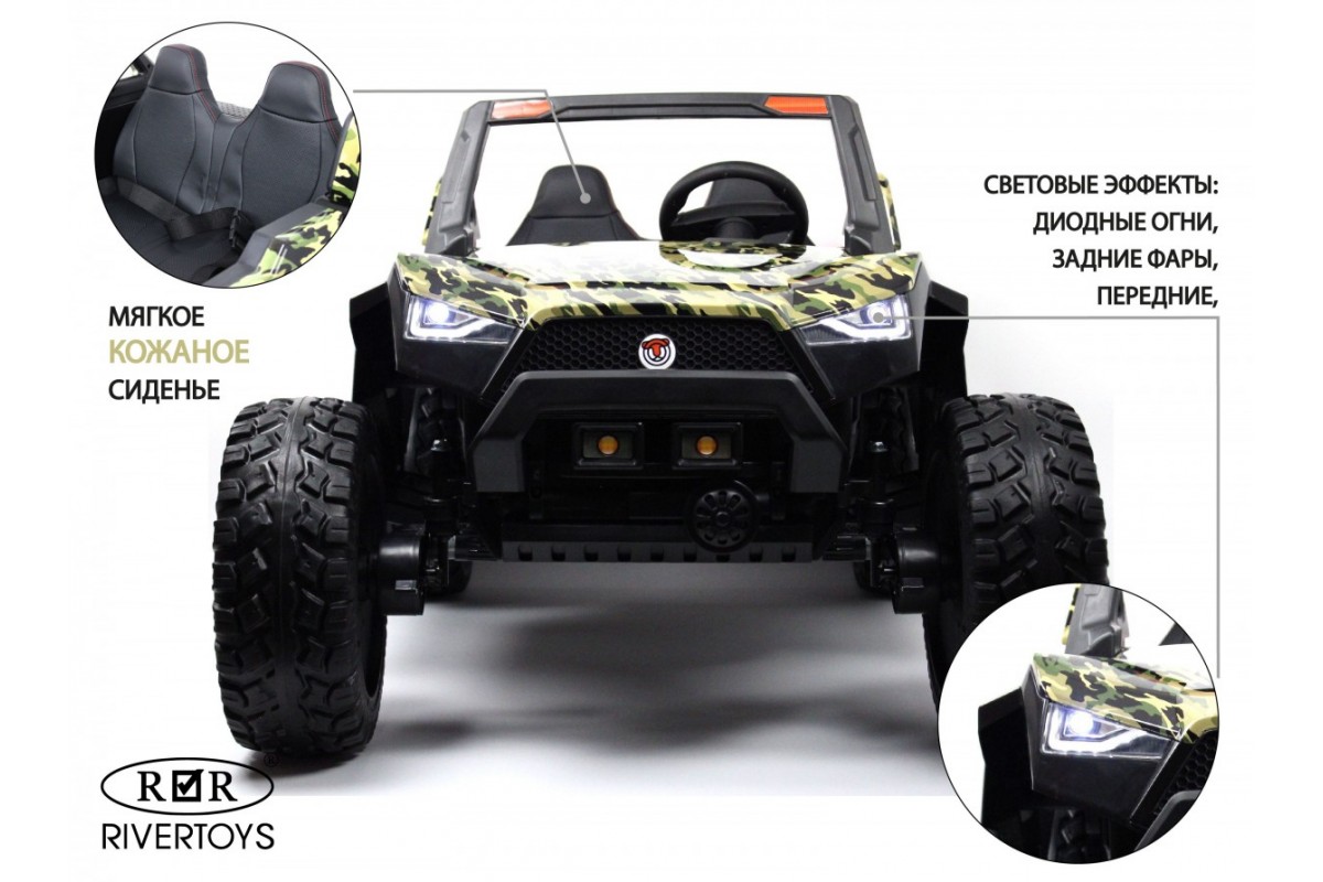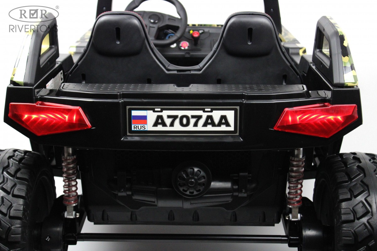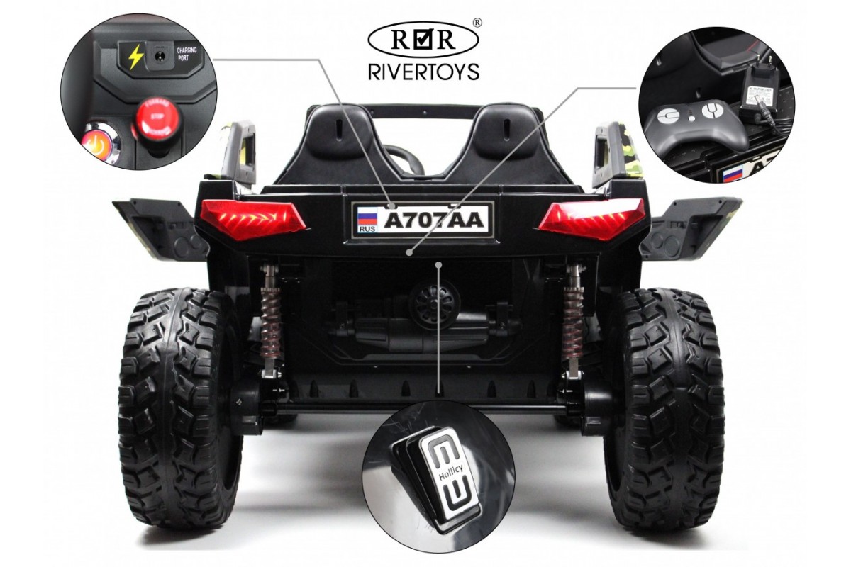RiverToys Buggy 4WD A707AA – большой полноприводный электромобиль для 2-х детей. Этот вездеход оснащен большими резиновыми колесами и имеет высокий клиренс. Низкие дверцы могут открываться и закрываться на специальные замки. Просторный салон вмещает в себя двухместное кресло с кожаным чехлом, спинкой и 2 подголовниками.