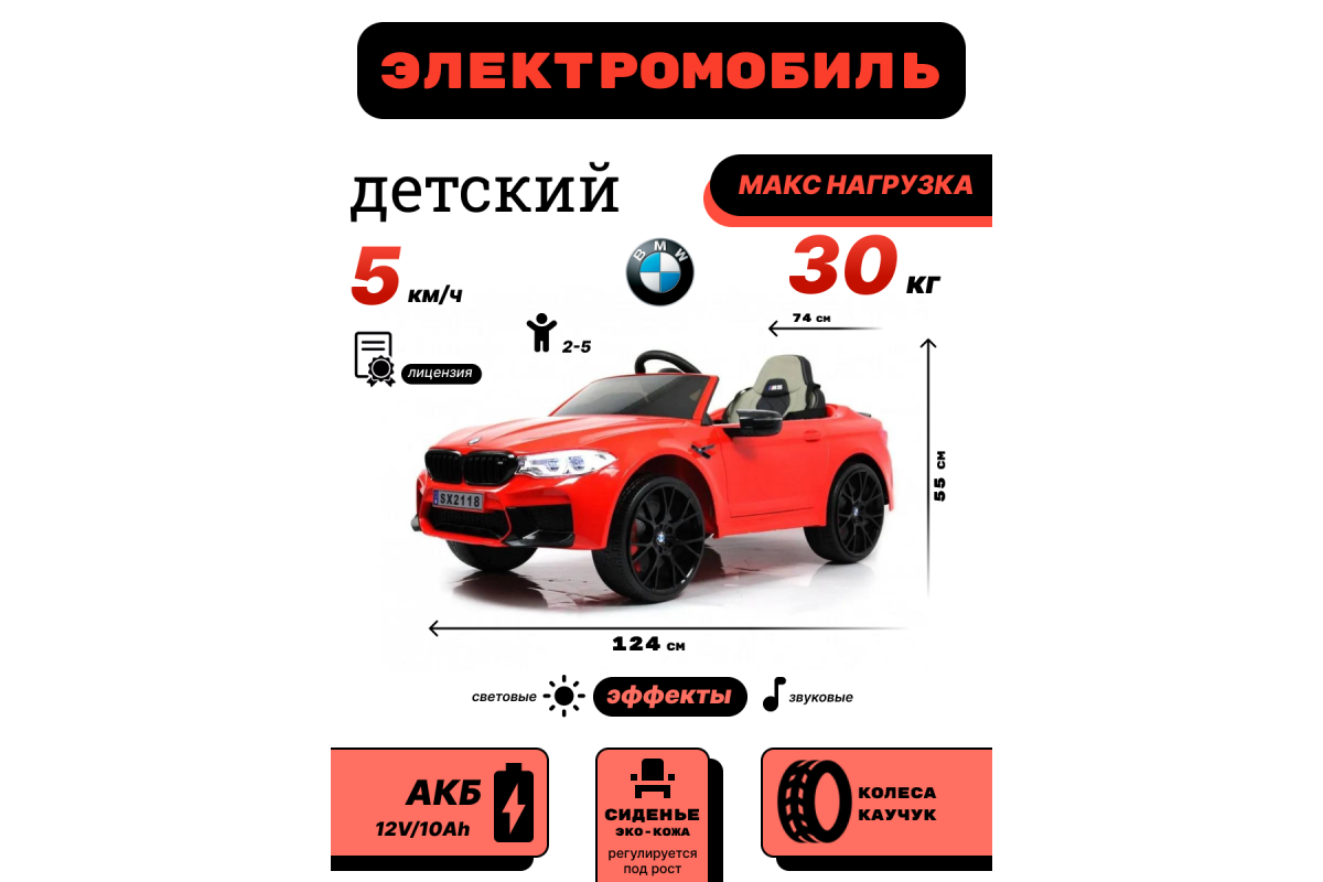 Детский лицензионный электромобиль RiverToys BMW M5 A555MP имеет дистанционное управление. Пульт настраивается по Bluetooth и работает от 2 батареек ААА. Сидение выполнено из перфорированной эко-кожи и оснащено 5-ти точечным ремнем безопасности.