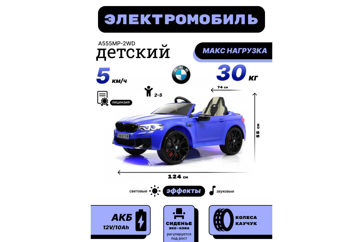 Детский лицензионный электромобиль RiverToys BMW M5 A555MP имеет дистанционное управление. Пульт настраивается по Bluetooth и работает от 2 батареек ААА. Сидение выполнено из перфорированной эко-кожи и оснащено 5-ти точечным ремнем безопасности.