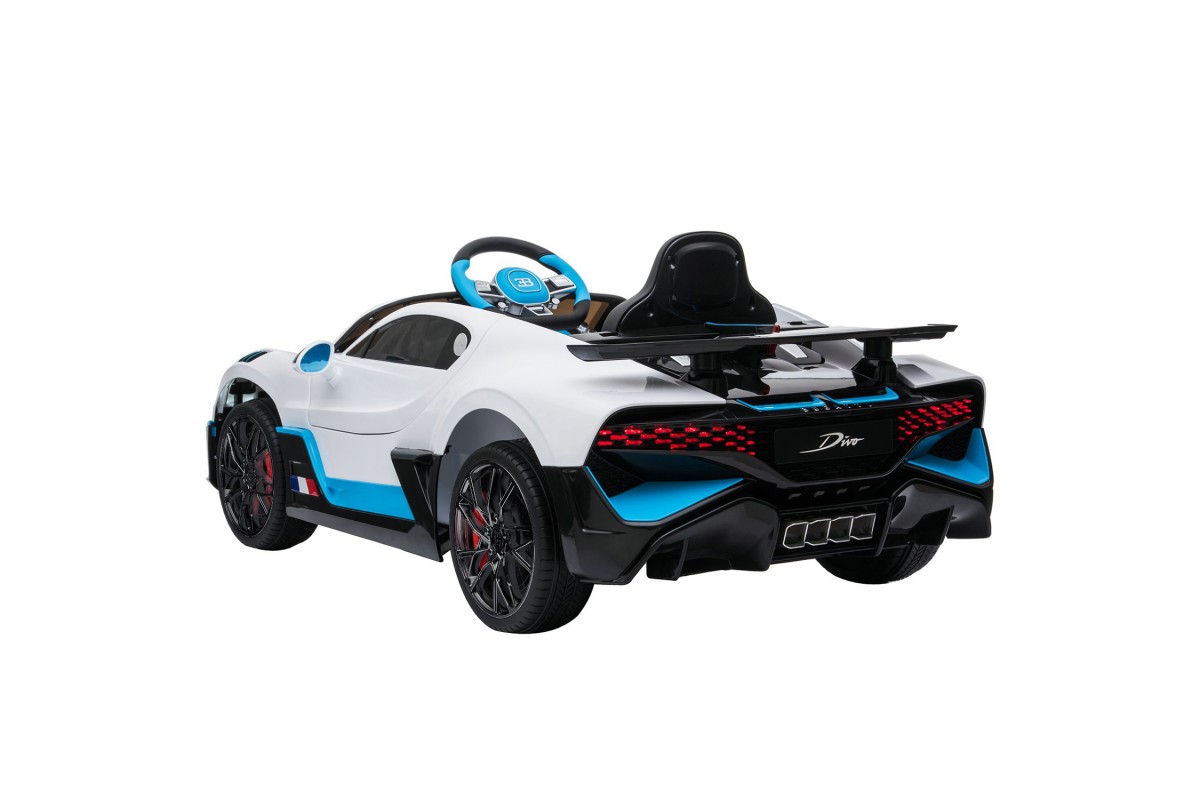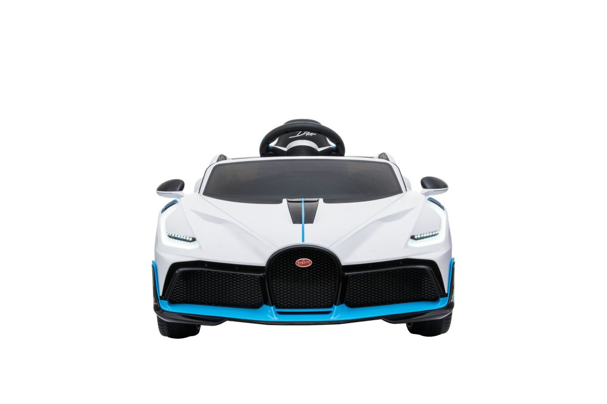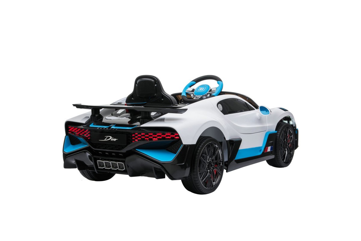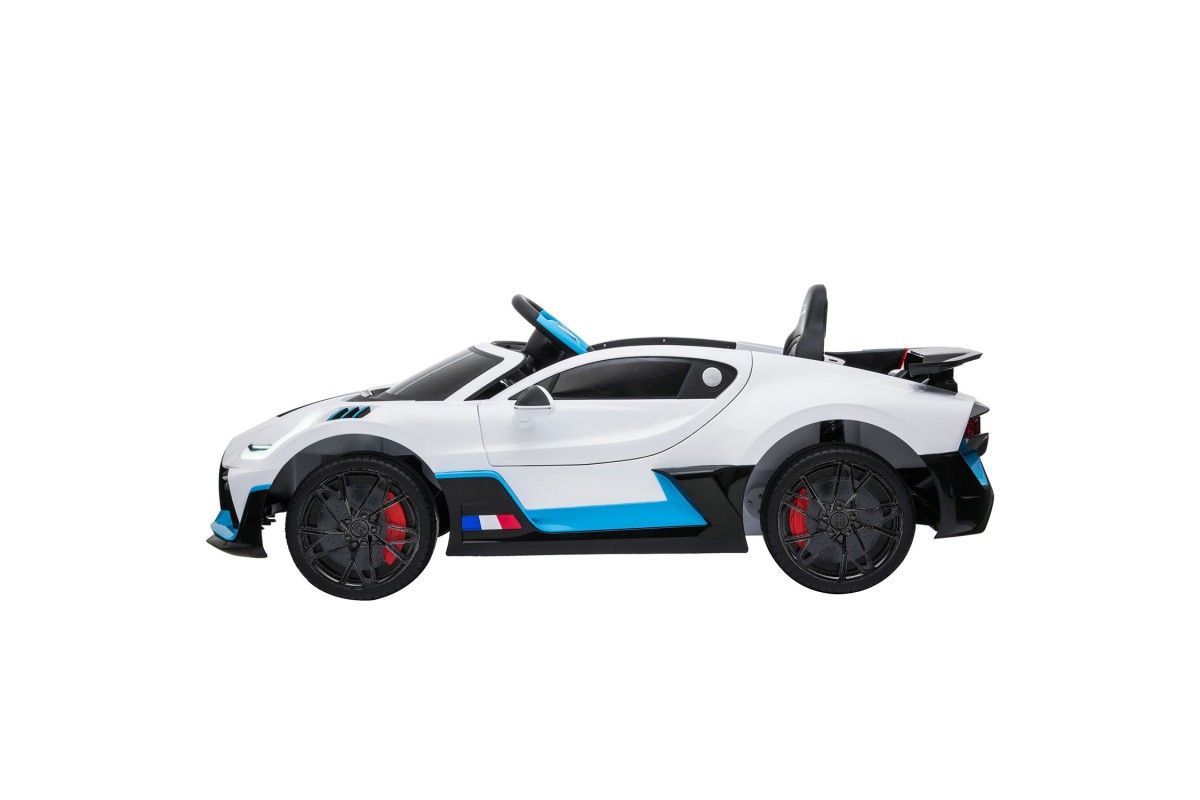 Детский электромобиль Bugatti Divo 12V - WHITE - HL338 - это детский одноместный электромобиль Bugatti Divo по лицензии известного автоконцерна выполнен по стилю легендарной спортивной версии Bugatti. Двухскоростной автомобиль с пультом радиоуправления, у него открываются боковые двери и багажник. Отличие этой модели от других – мягкие резиновые колеса, встроенная магнитола, LEВ подсветка фар и звук мотора, сиденье из перфорированной черной экокожи с логотипом и пульт управления 2.4G.