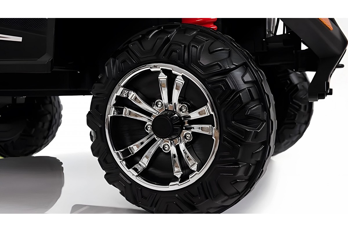 Полноприводной детской машине с аккумулятором VENTURA (12V-9000 mAh) и четырьмя моторами по 45W не страшны никакие преграды. Авто спокойно преодолевает любые спуски и подъемы, ему подвластны не только асфальтированные дороги, но и грунтовые тропинки. Амортизированные колеса с глубоким протектором из плотной каучуковой резины противостоят скольжению и пробуксовке.