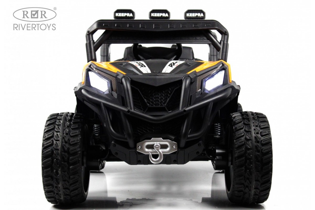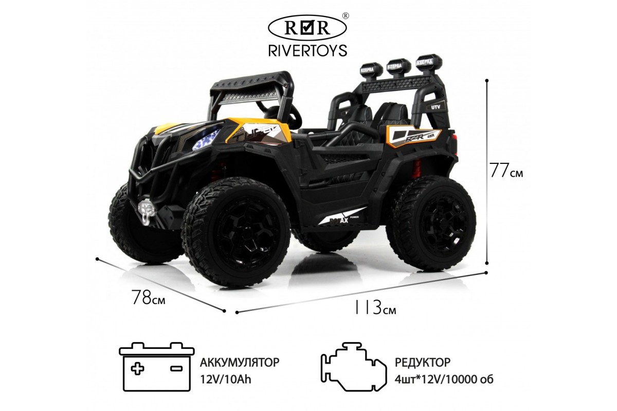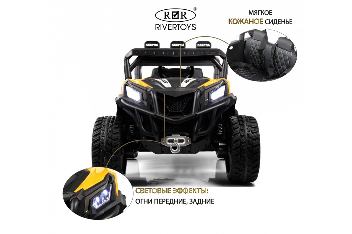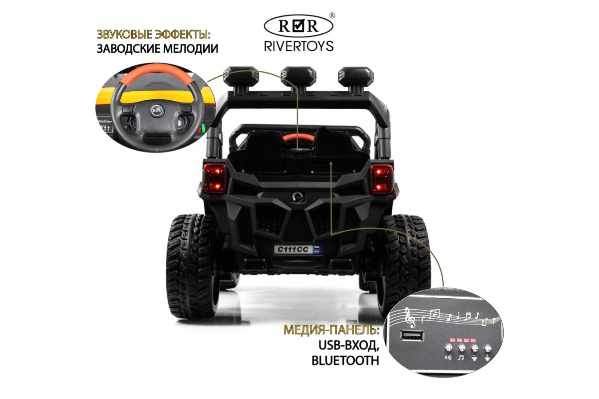 Полноприводный электромобиль-багги для детей RiverToys Buggy 4WD C111CC. Внедорожник укомплектован широкими колесами из каучука, позволяющим ездить по любым дорогам. Передние и задние фары имеют подсветку, поэтому машинку хорошо видно во время вечернего катания.