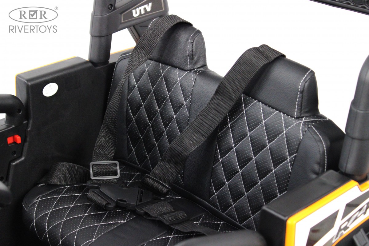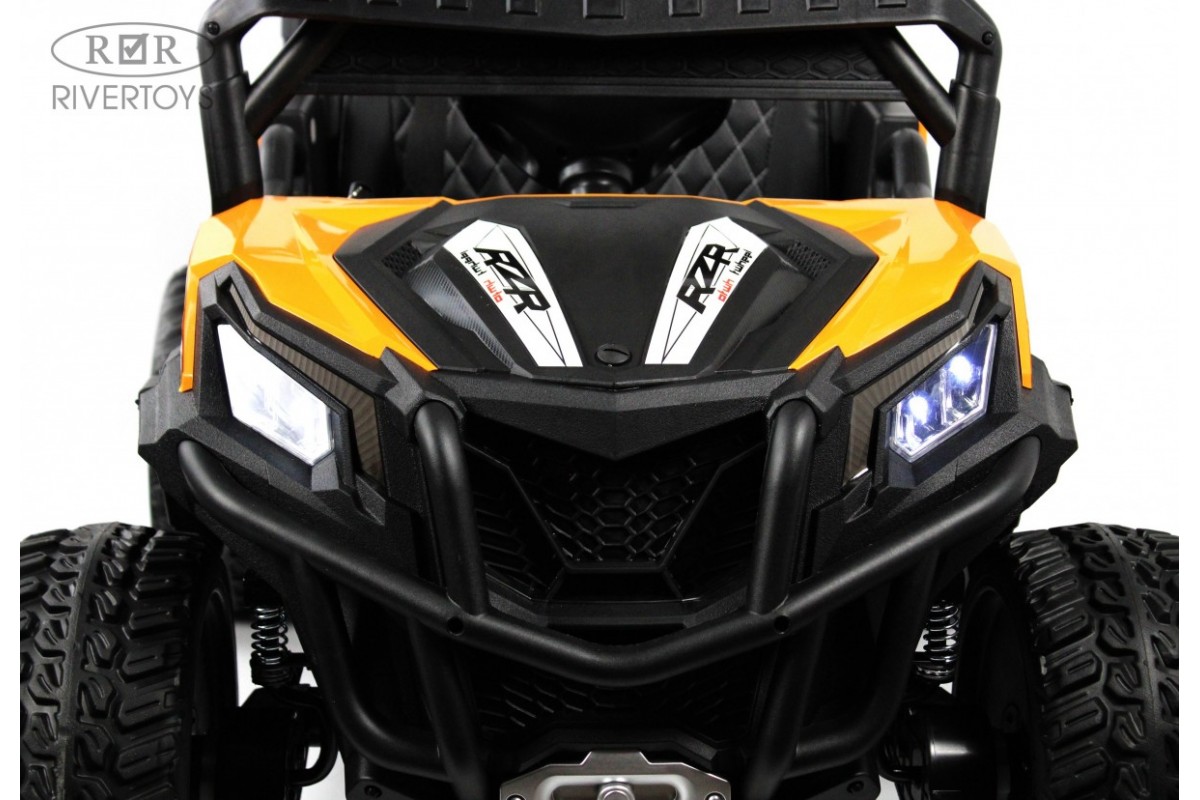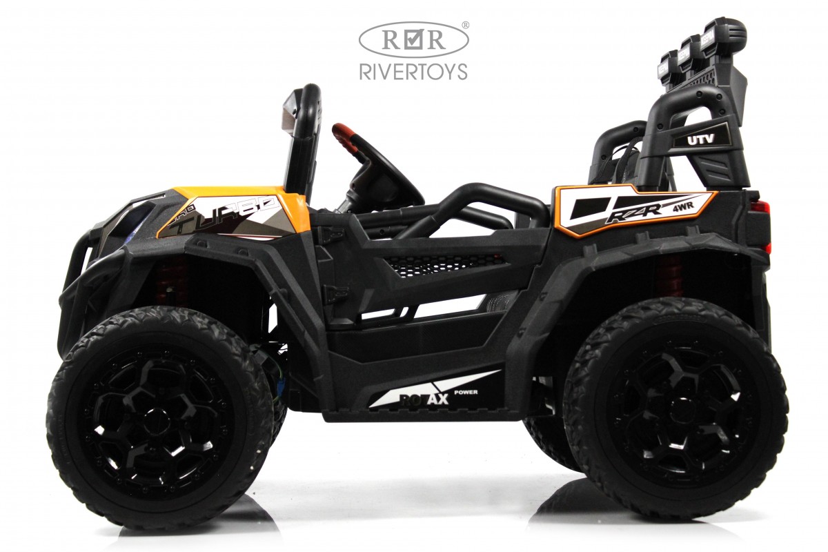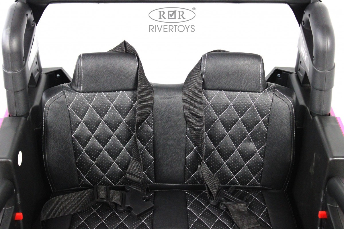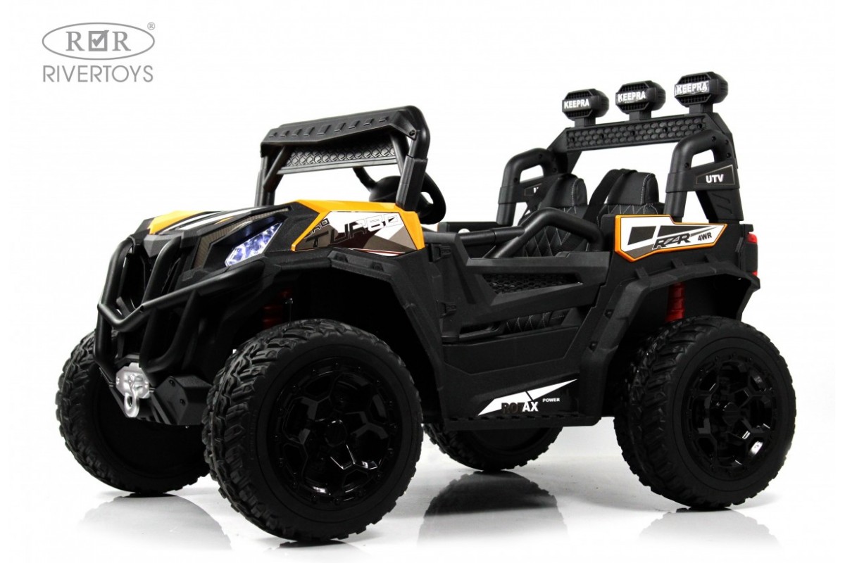 Полноприводный электромобиль-багги для детей RiverToys Buggy 4WD C111CC. Внедорожник укомплектован широкими колесами из каучука, позволяющим ездить по любым дорогам. Передние и задние фары имеют подсветку, поэтому машинку хорошо видно во время вечернего катания.
