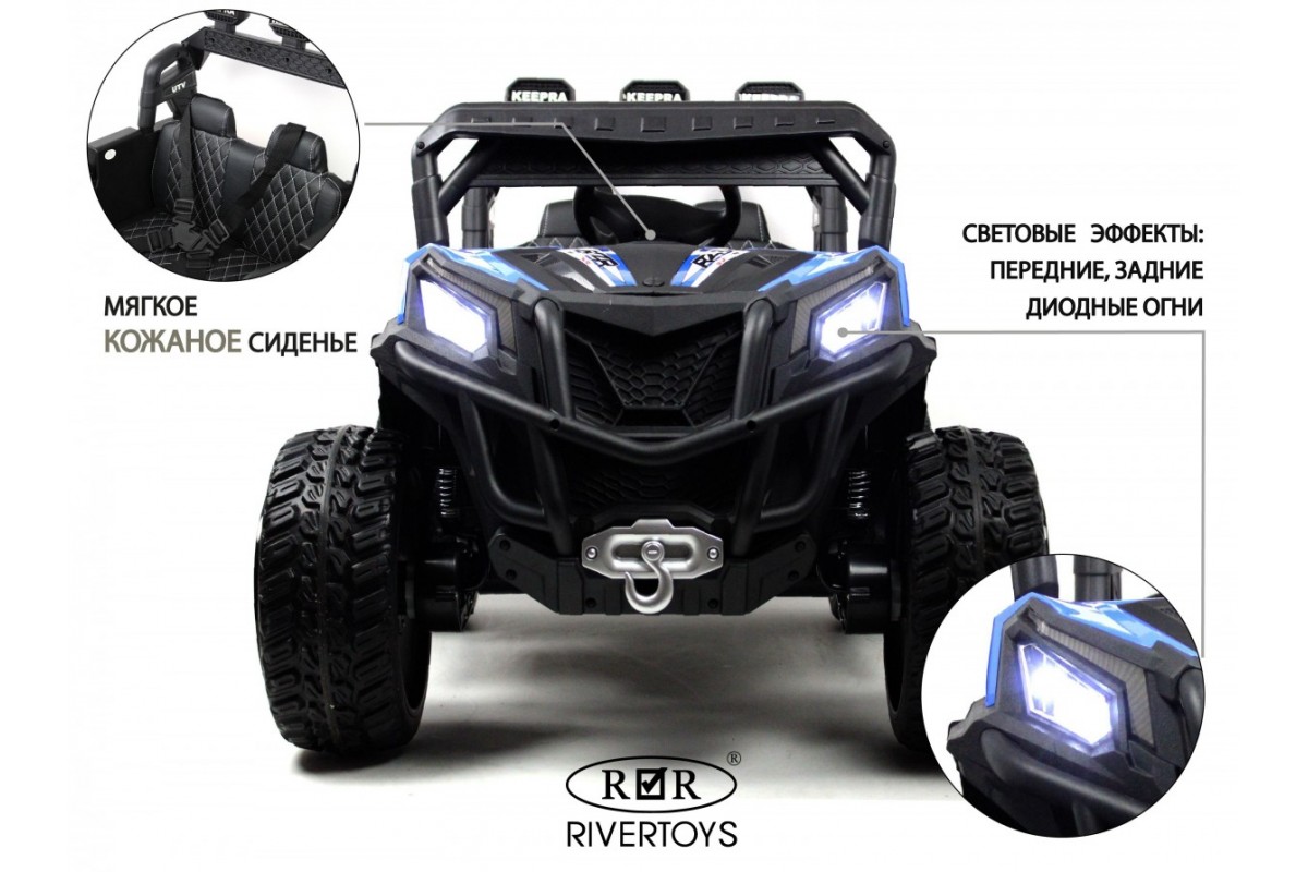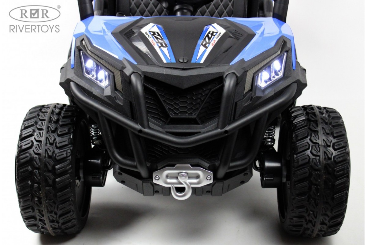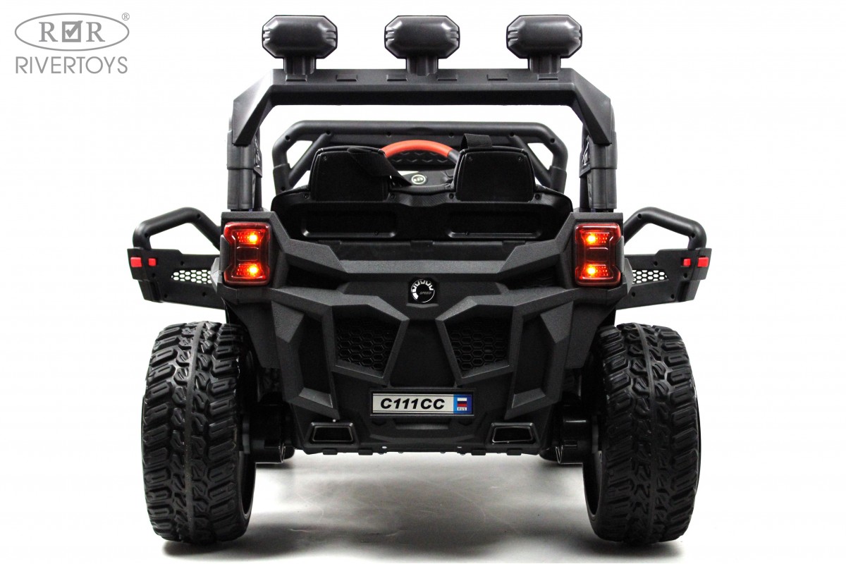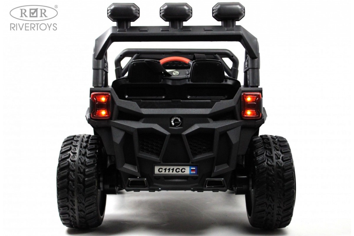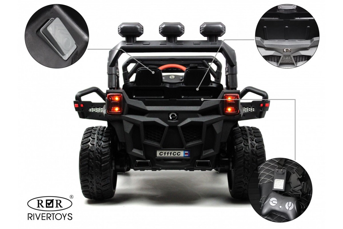 Полноприводный электромобиль-багги для детей RiverToys Buggy 4WD C111CC. Внедорожник укомплектован широкими колесами из каучука, позволяющим ездить по любым дорогам. Передние и задние фары имеют подсветку, поэтому машинку хорошо видно во время вечернего катания.