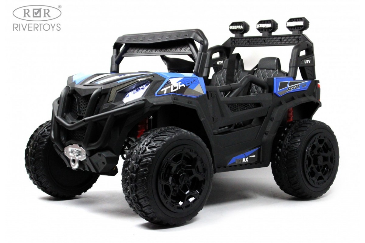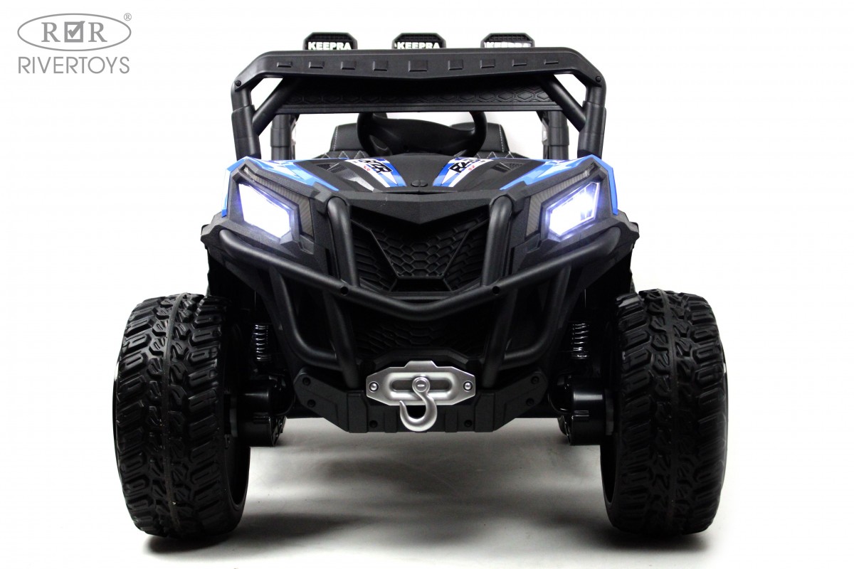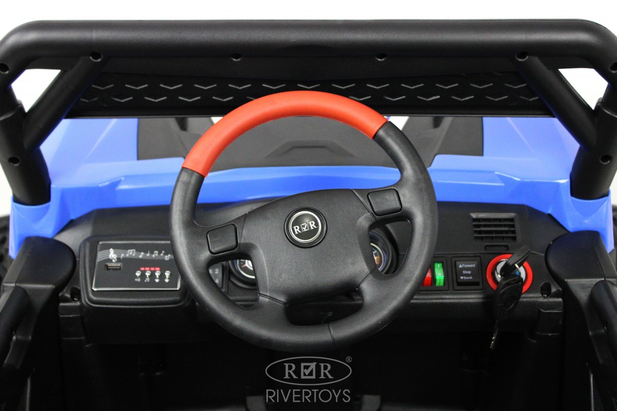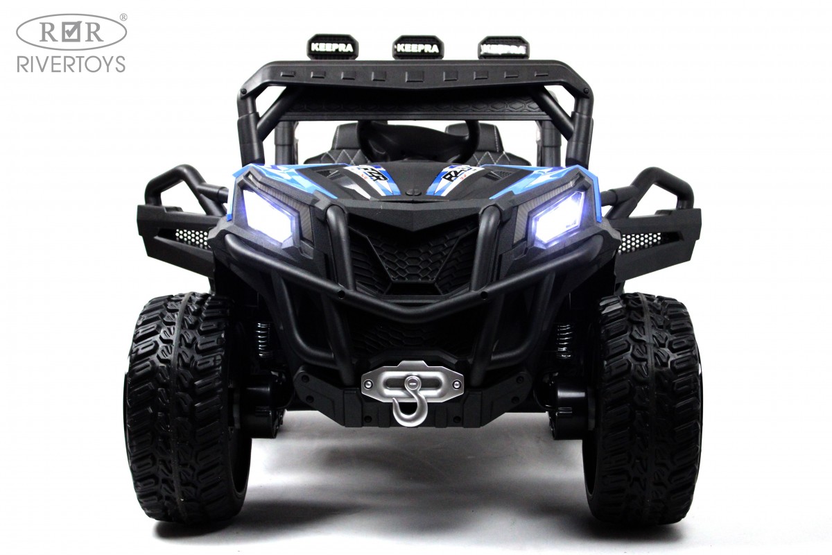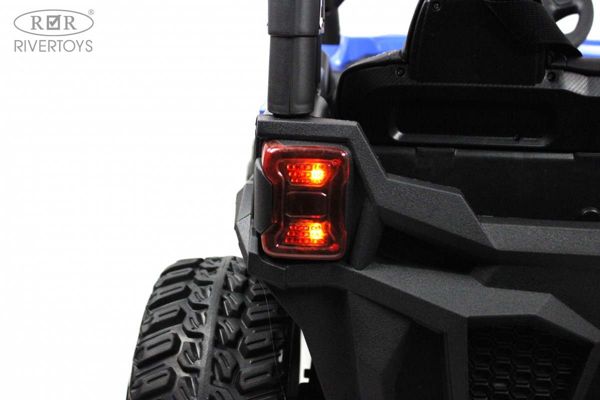 Полноприводный электромобиль-багги для детей RiverToys Buggy 4WD C111CC. Внедорожник укомплектован широкими колесами из каучука, позволяющим ездить по любым дорогам. Передние и задние фары имеют подсветку, поэтому машинку хорошо видно во время вечернего катания.