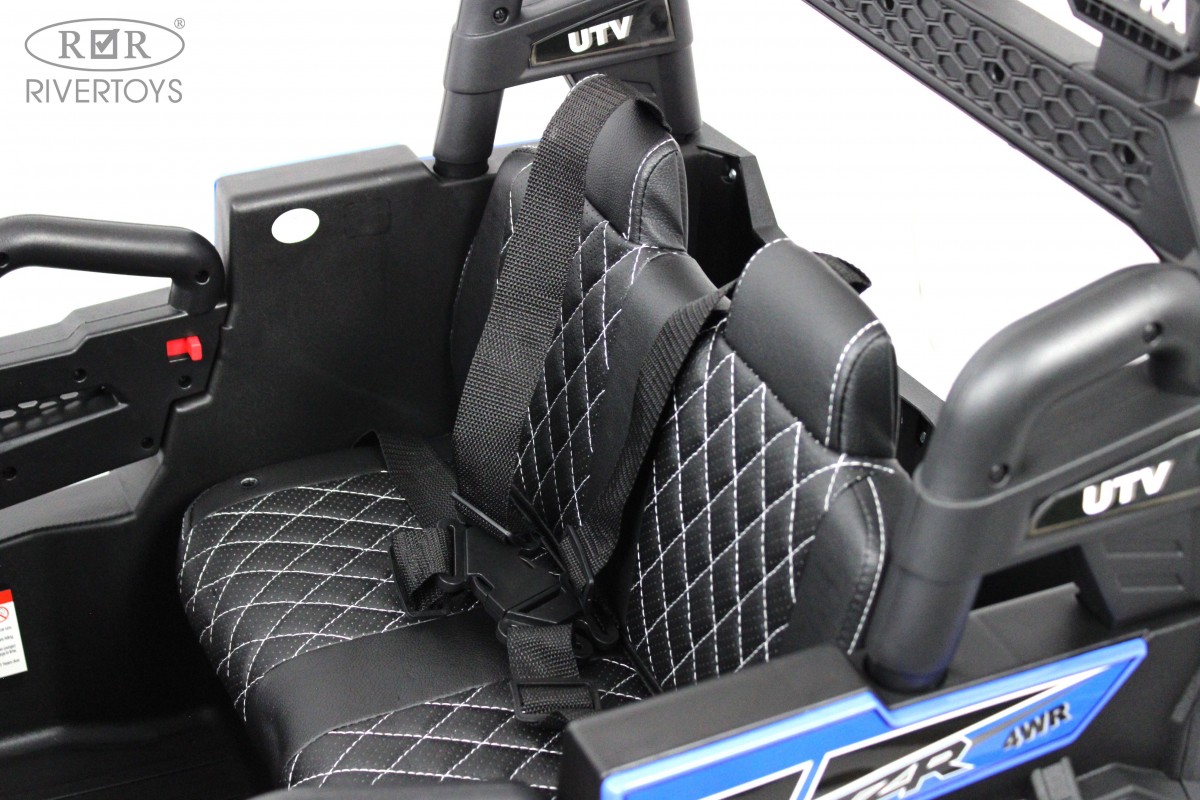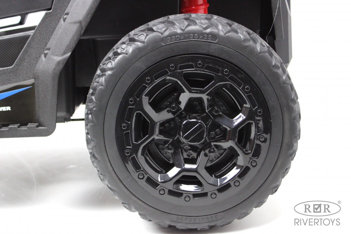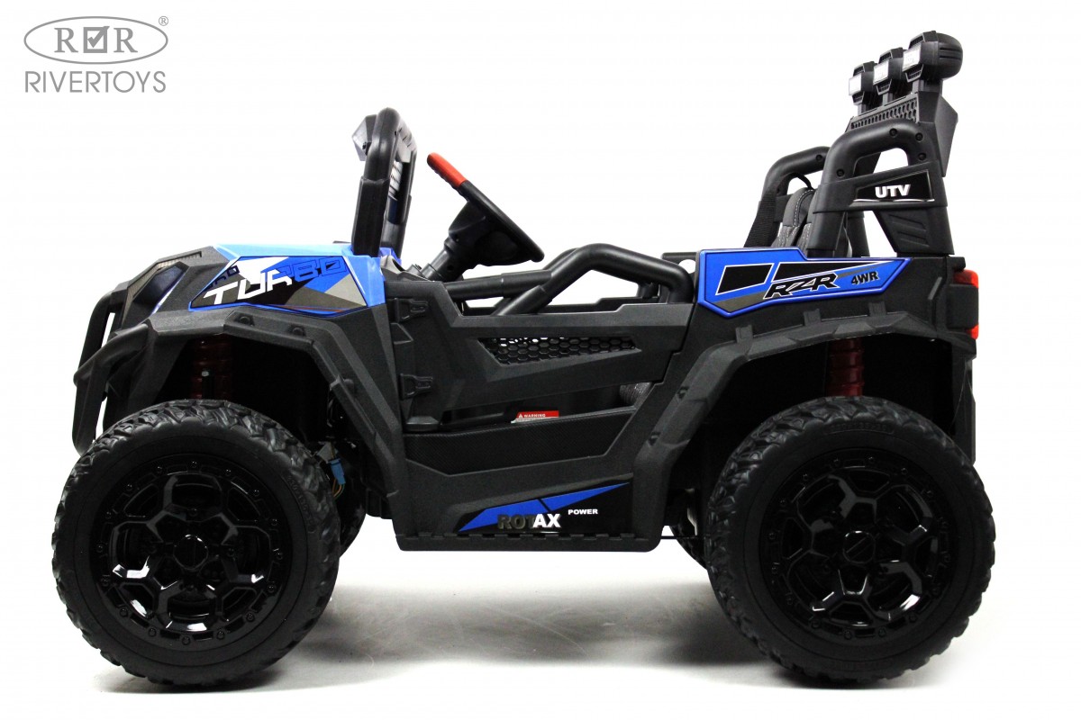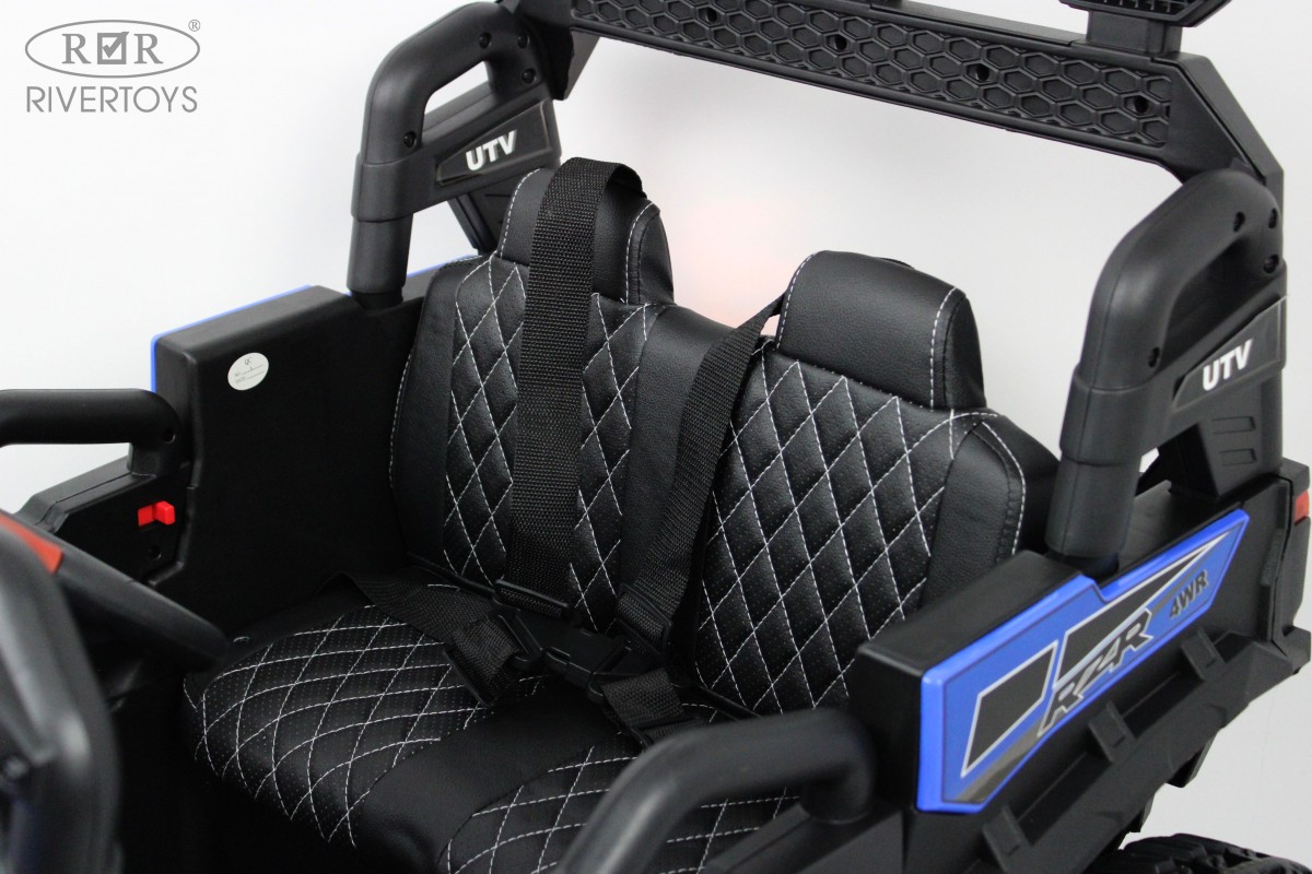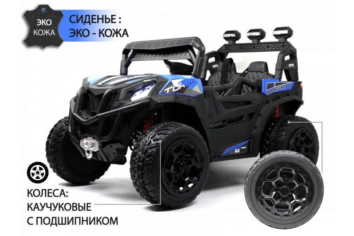 Полноприводный электромобиль-багги для детей RiverToys Buggy 4WD C111CC. Внедорожник укомплектован широкими колесами из каучука, позволяющим ездить по любым дорогам. Передние и задние фары имеют подсветку, поэтому машинку хорошо видно во время вечернего катания.