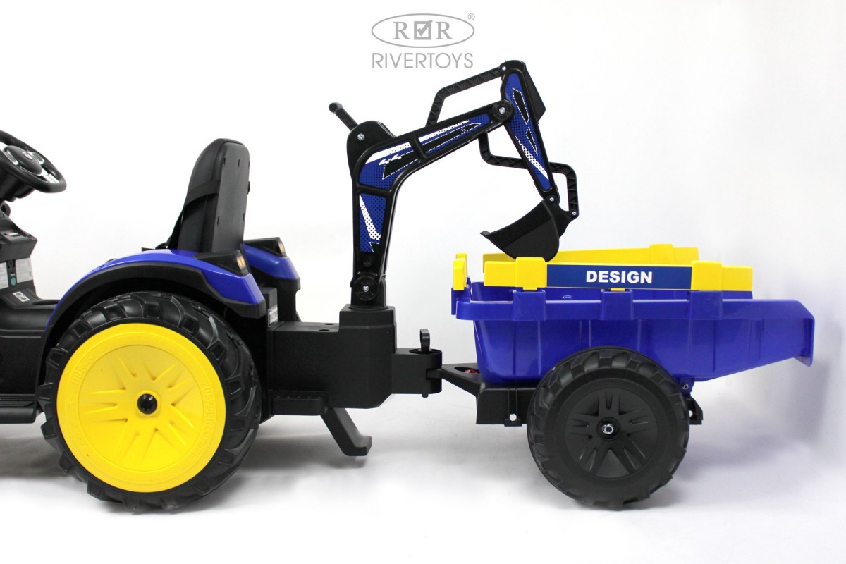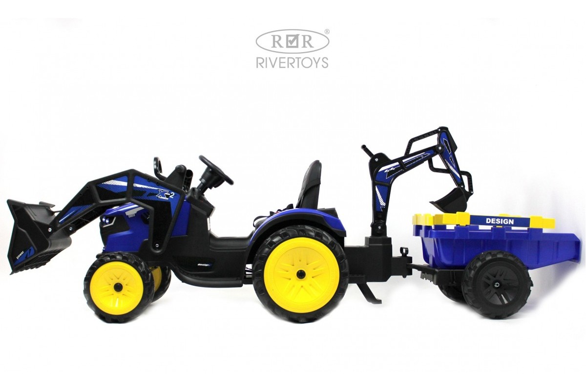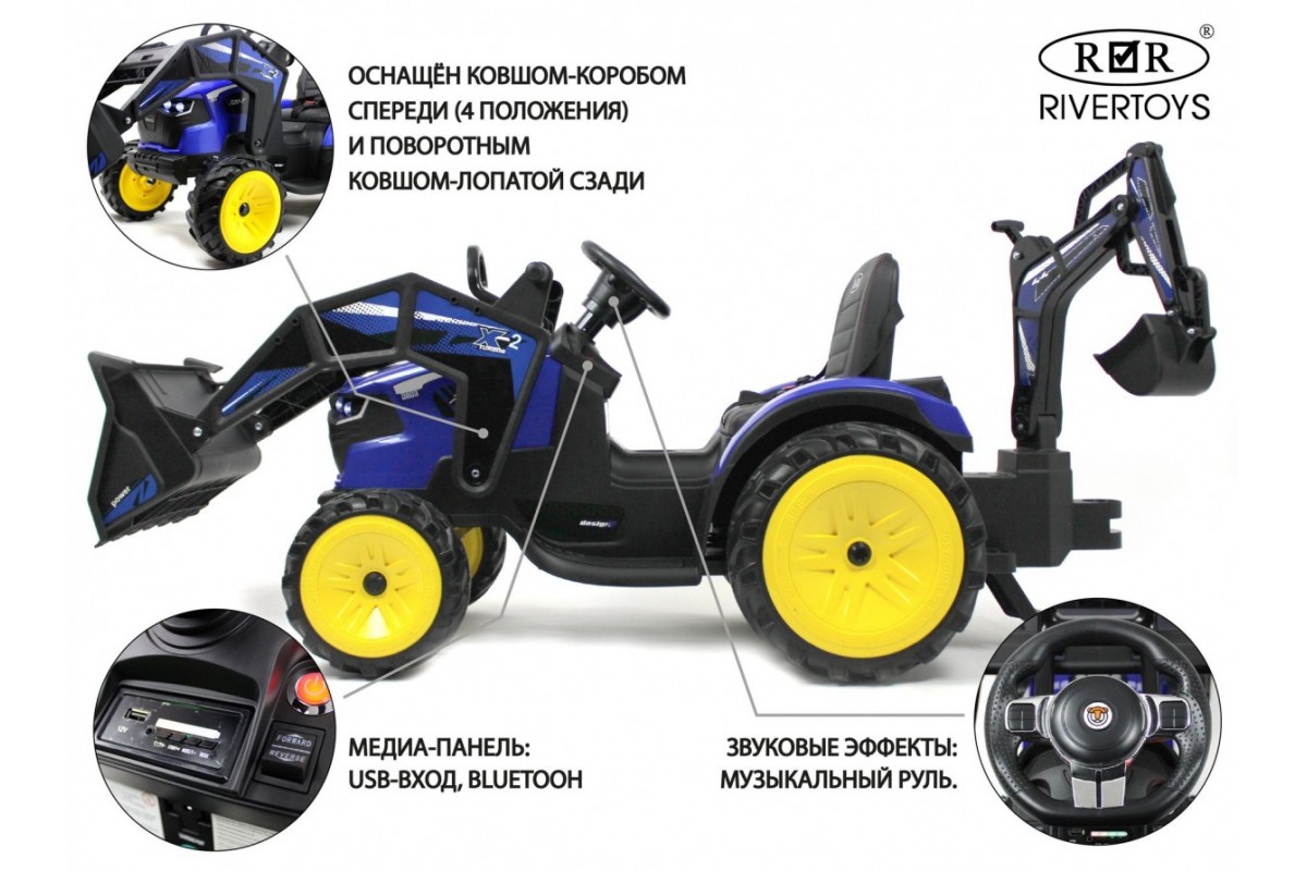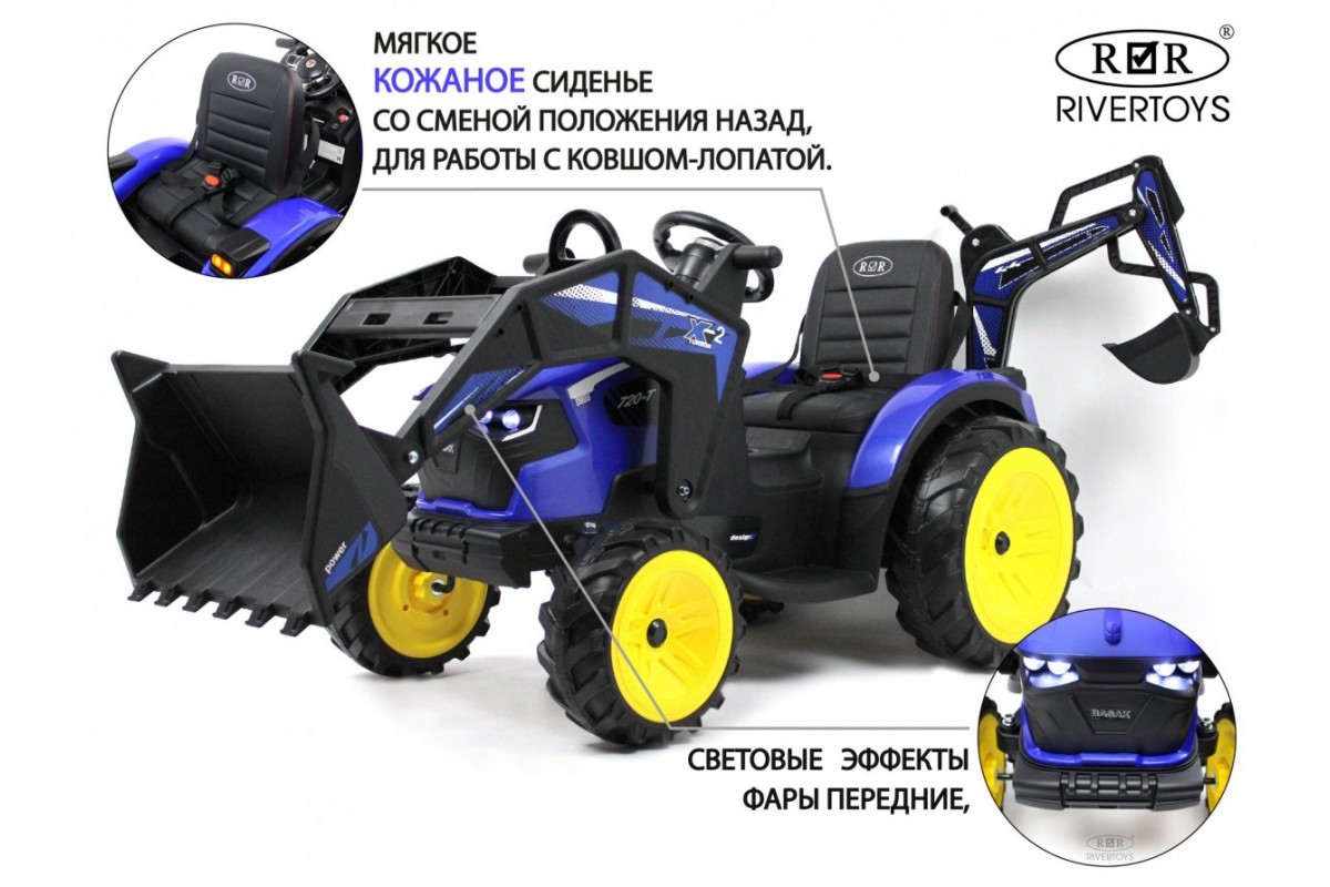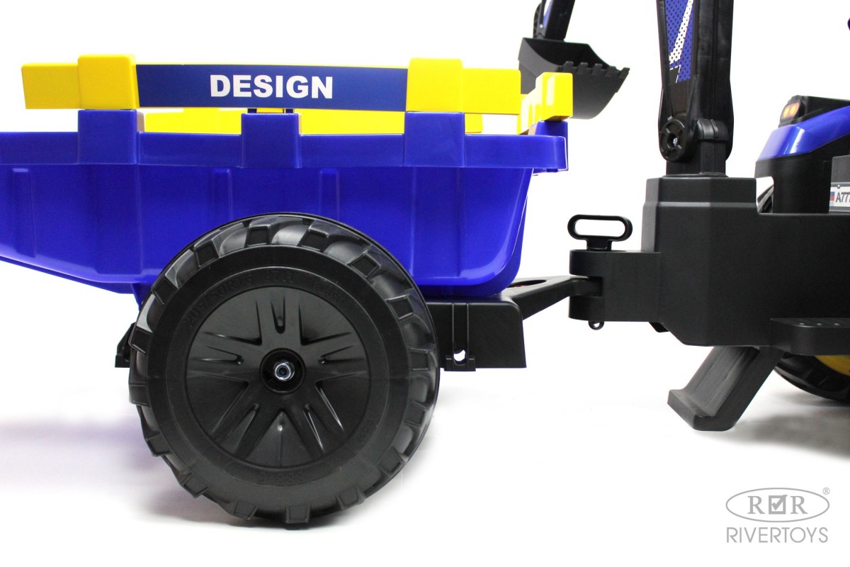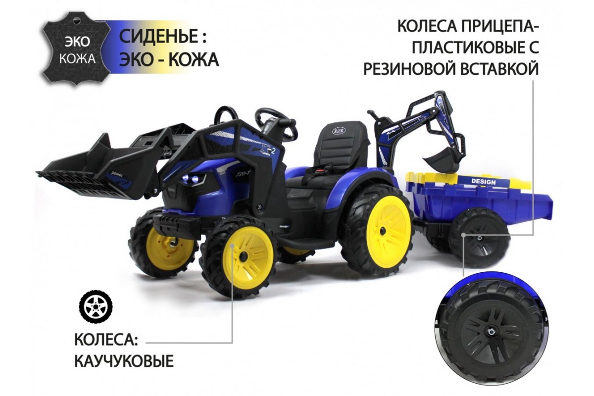 Оснащён ковшом-коробом спереди (4 положения) и поворотным ковшом-лопатой сзади (4 положения), а так же съемным поворотным прицепом.
