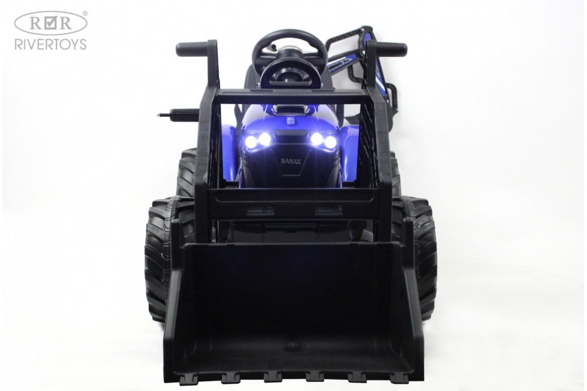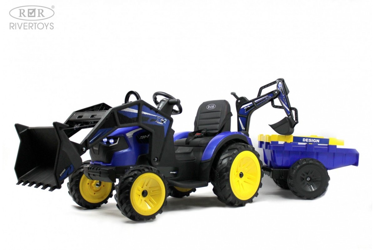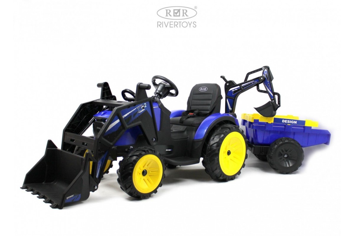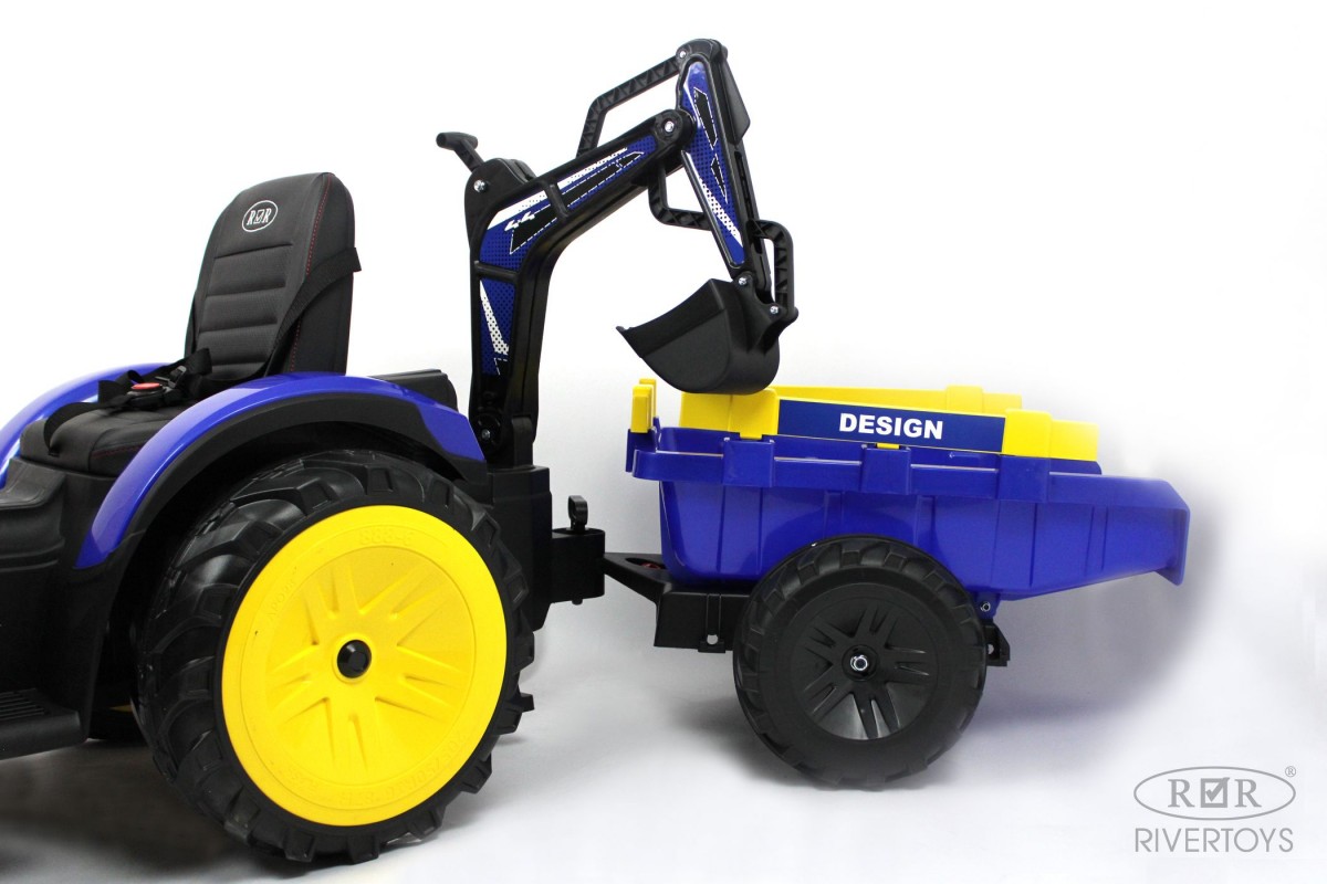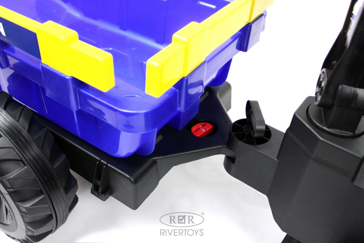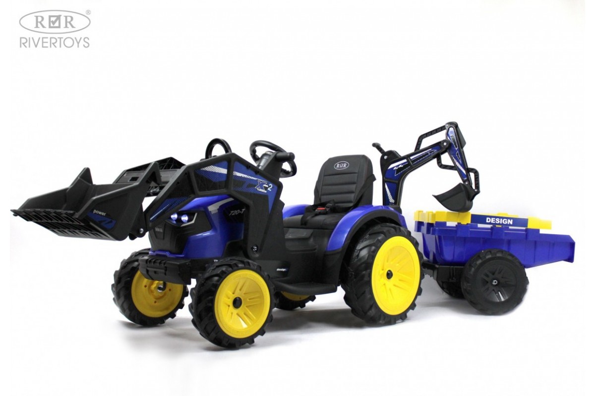 Оснащён ковшом-коробом спереди (4 положения) и поворотным ковшом-лопатой сзади (4 положения), а так же съемным поворотным прицепом.