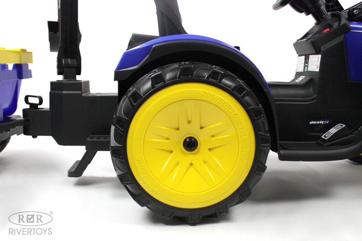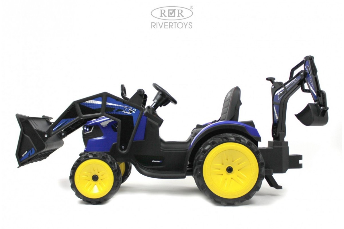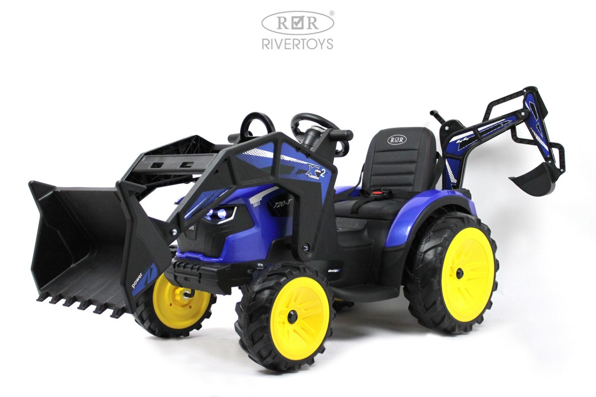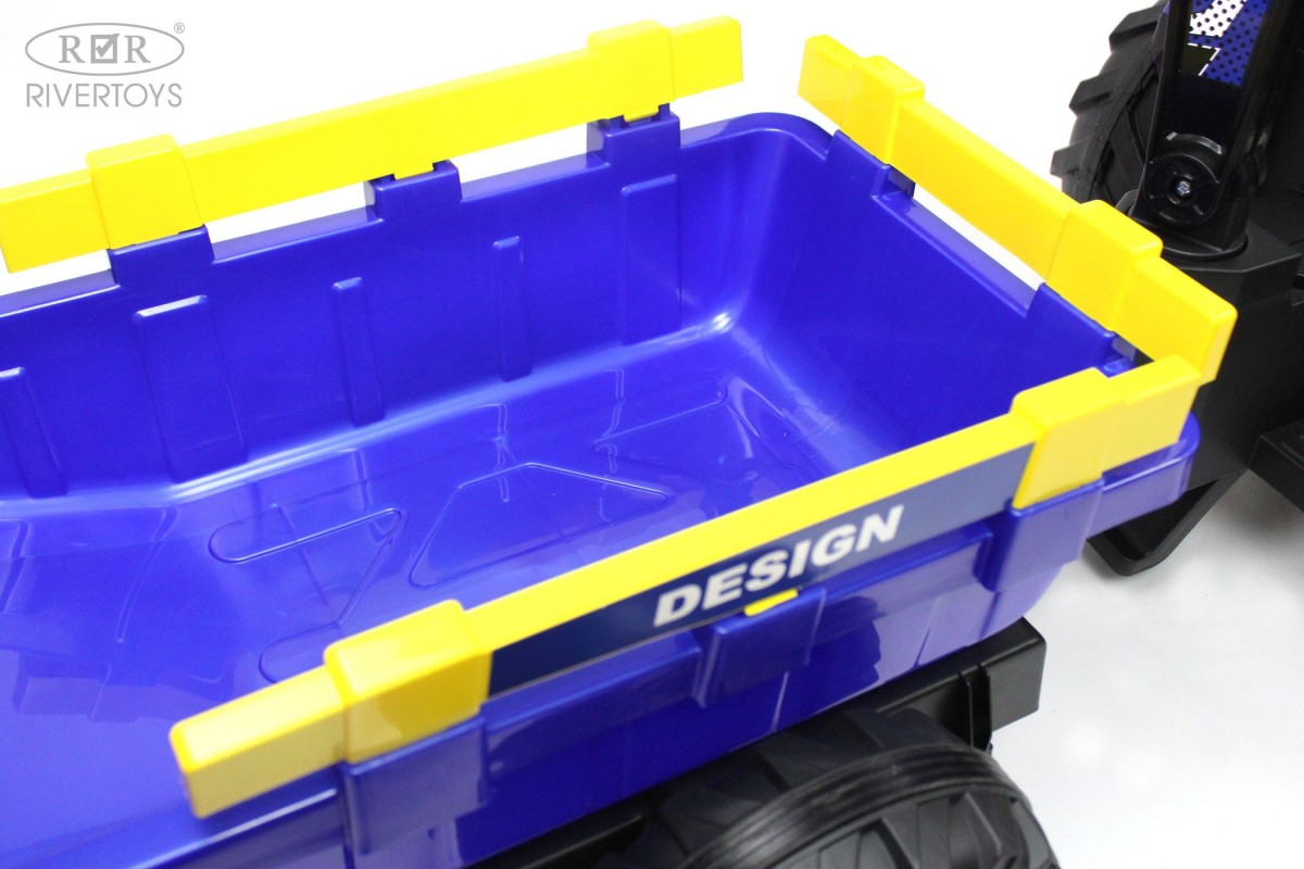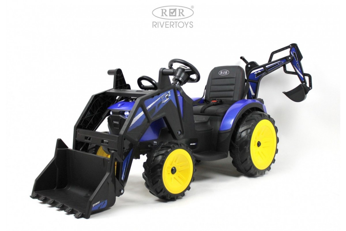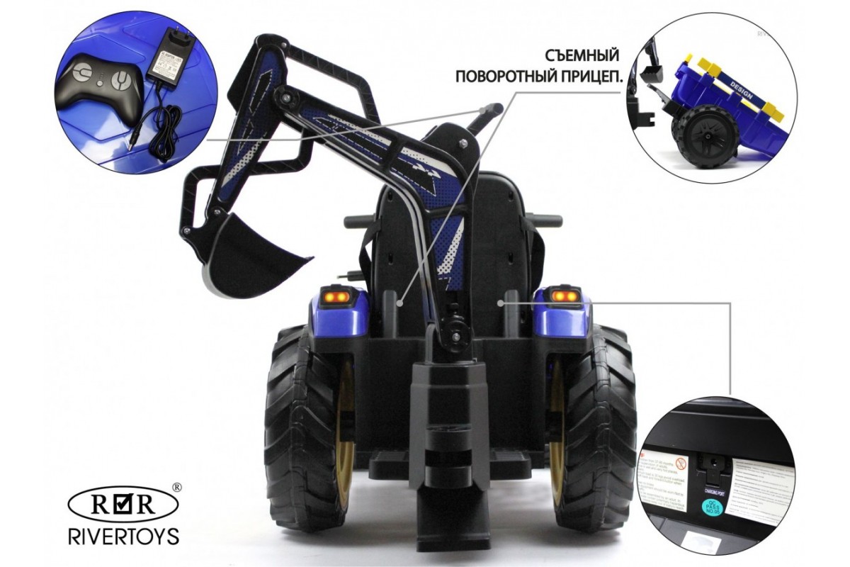 Оснащён ковшом-коробом спереди (4 положения) и поворотным ковшом-лопатой сзади (4 положения), а так же съемным поворотным прицепом.