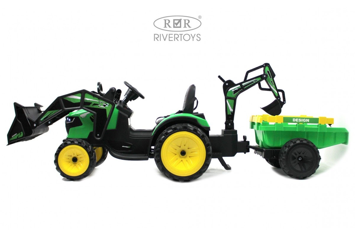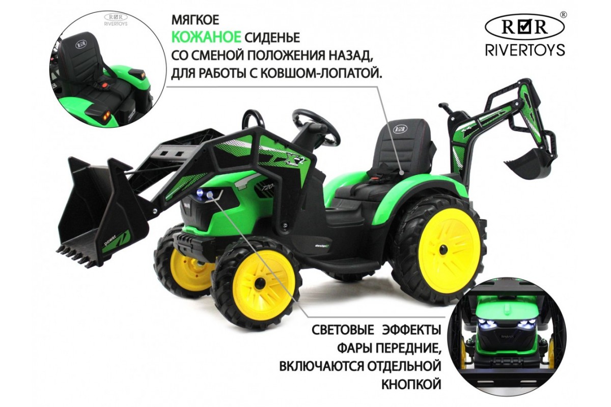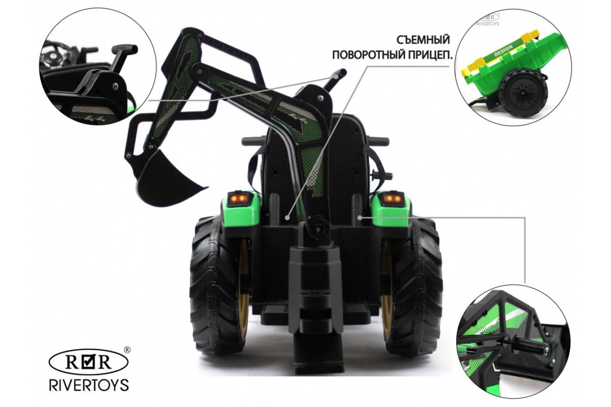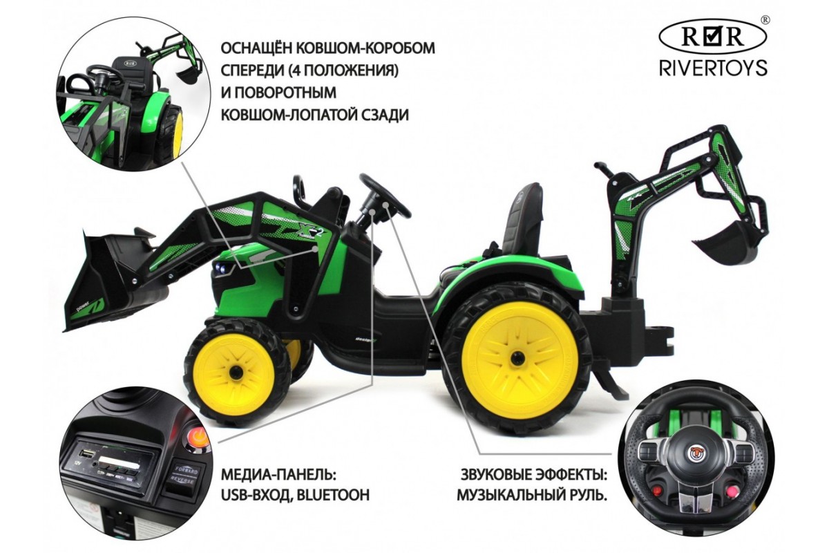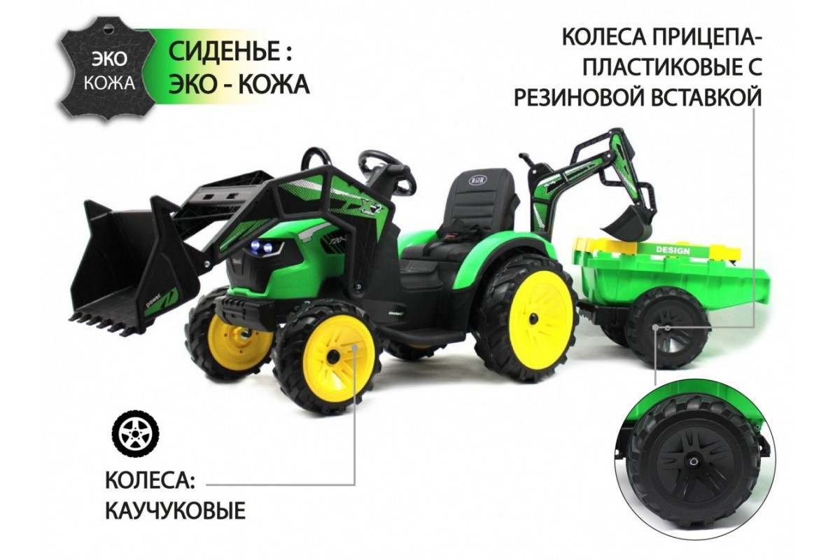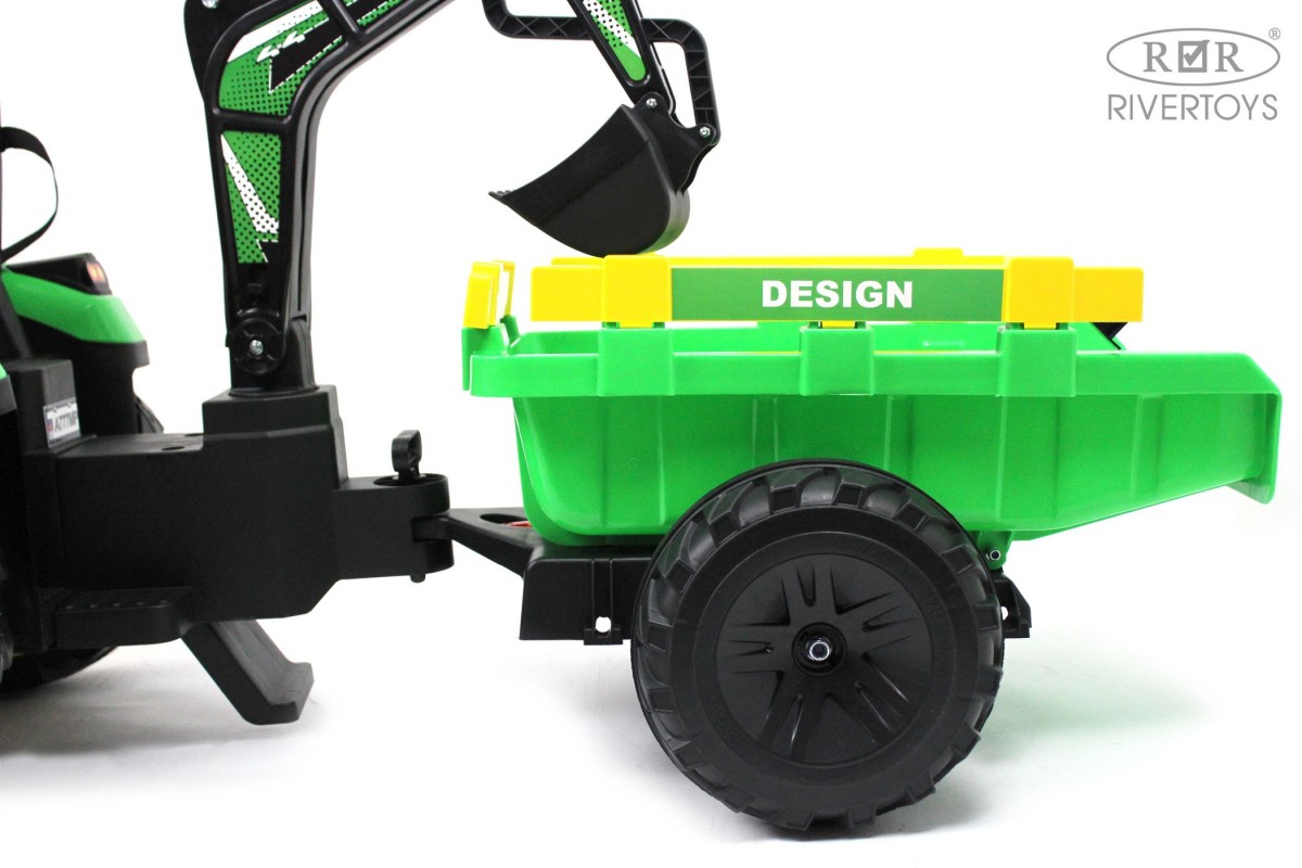 Оснащён ковшом-коробом спереди (4 положения) и поворотным ковшом-лопатой сзади (4 положения), а так же съемным поворотным прицепом.