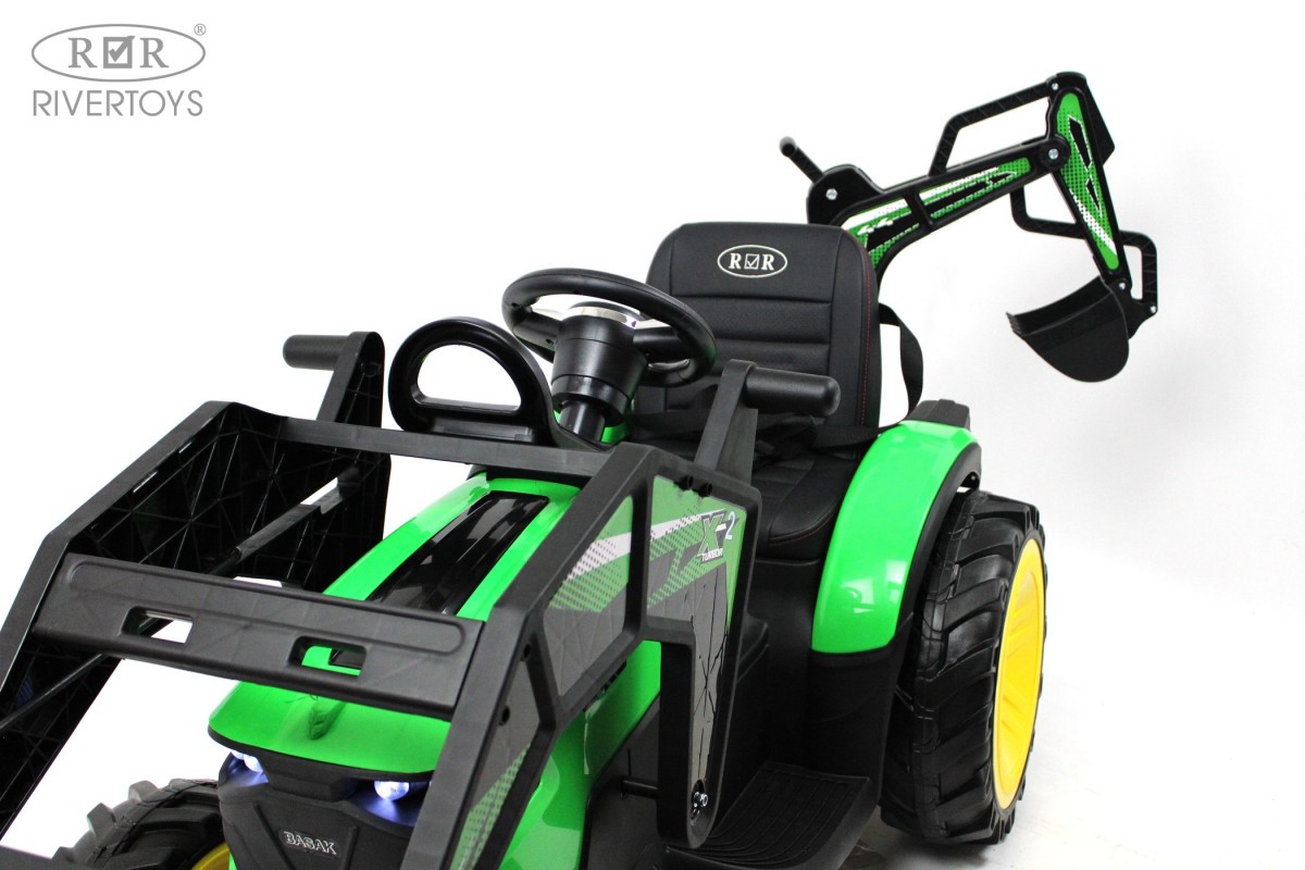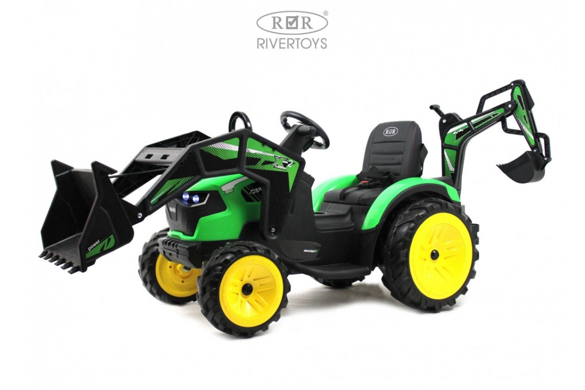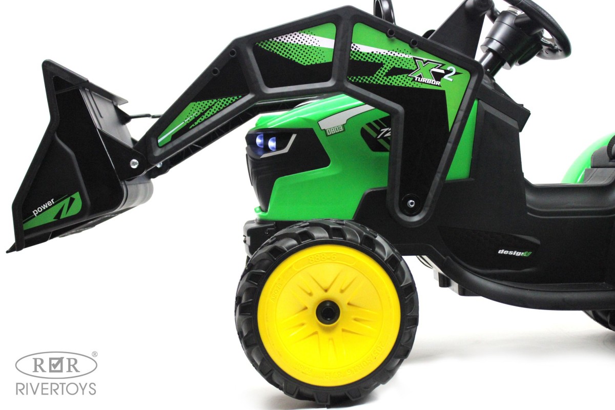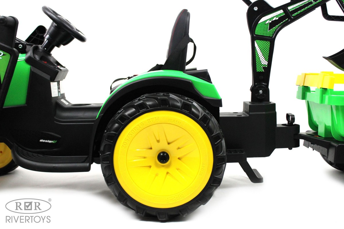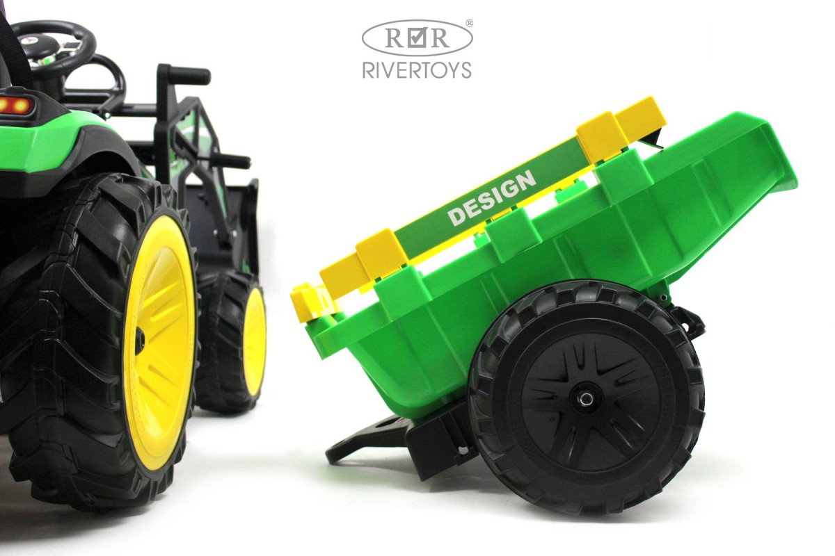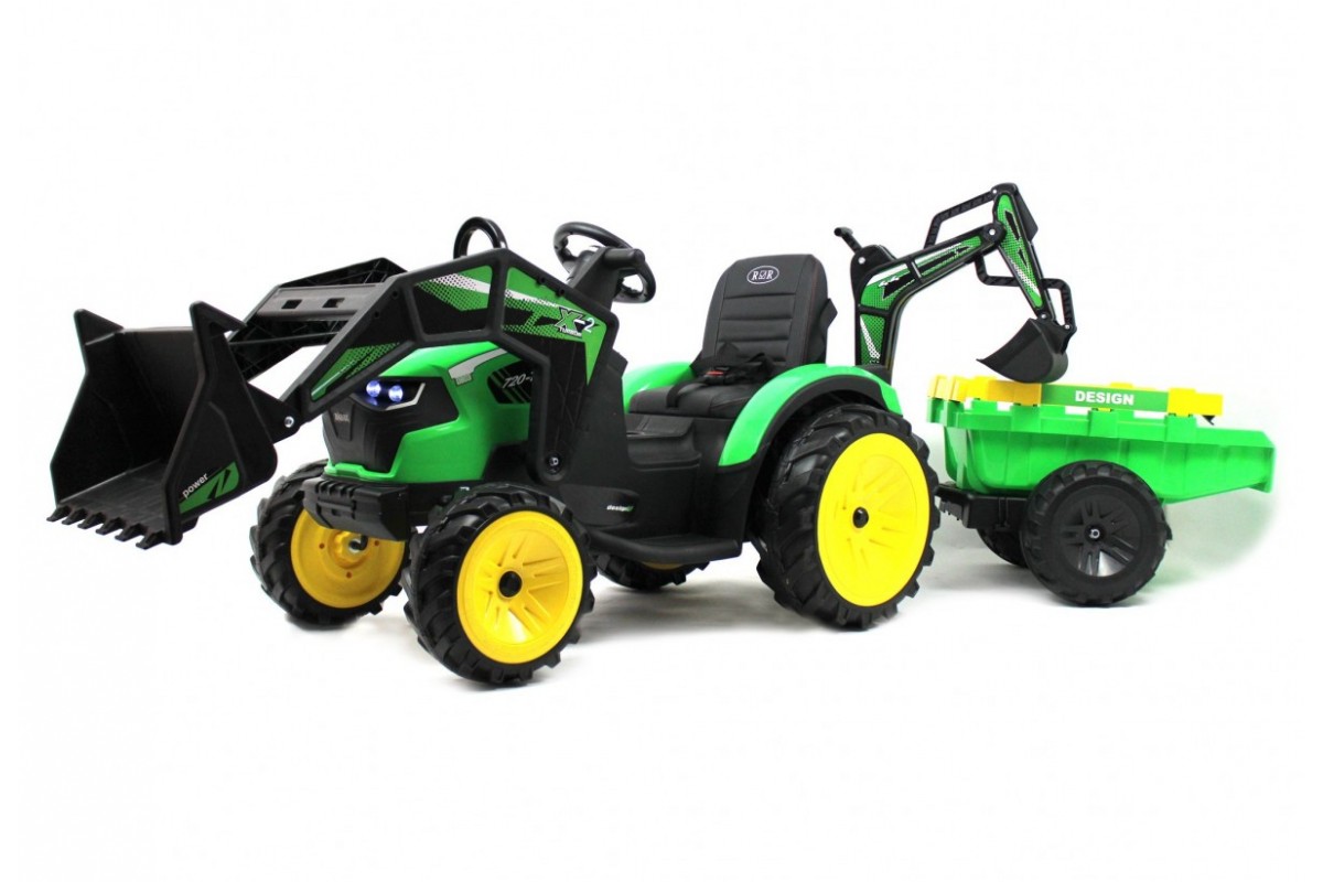 Оснащён ковшом-коробом спереди (4 положения) и поворотным ковшом-лопатой сзади (4 положения), а так же съемным поворотным прицепом.