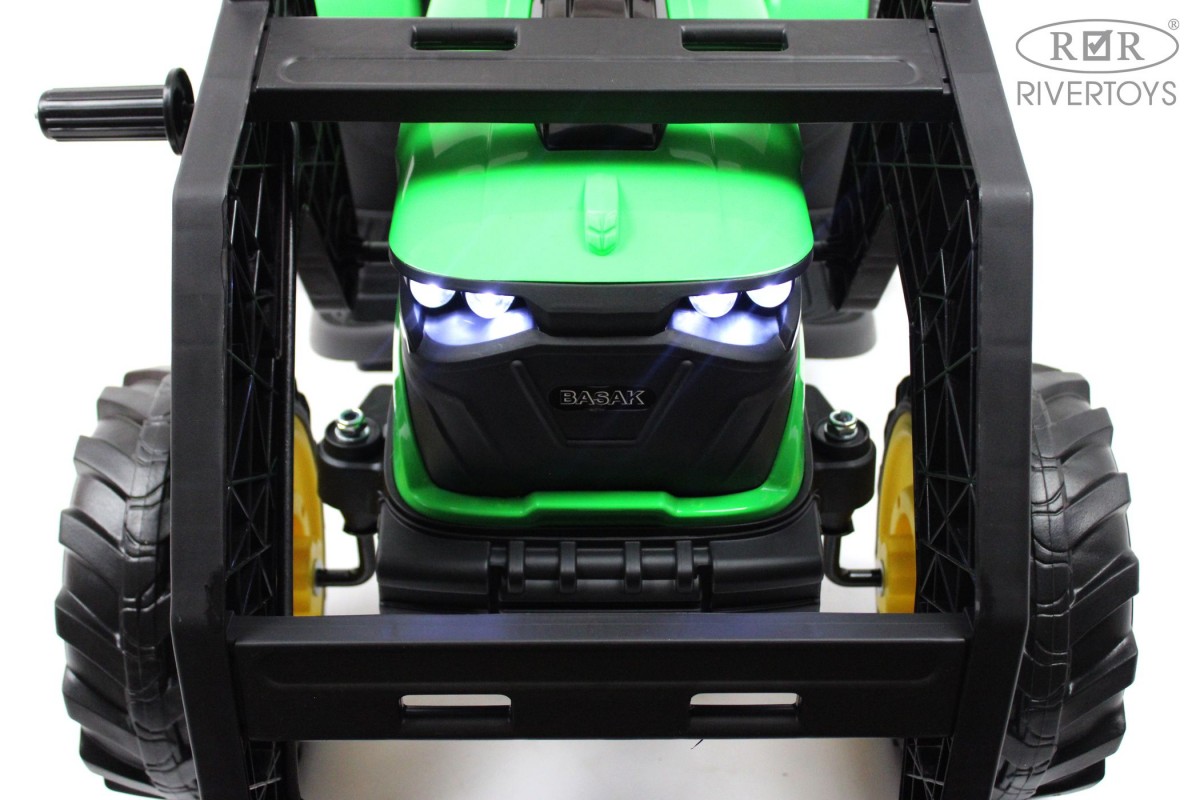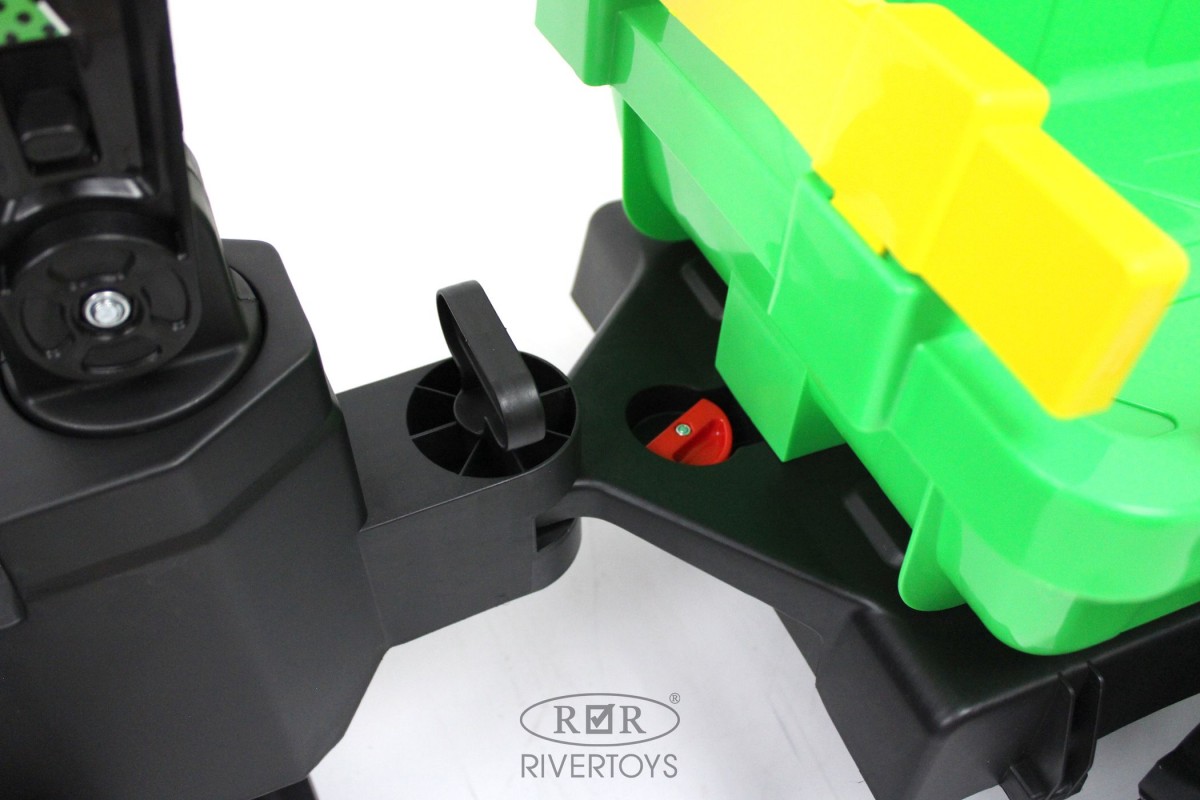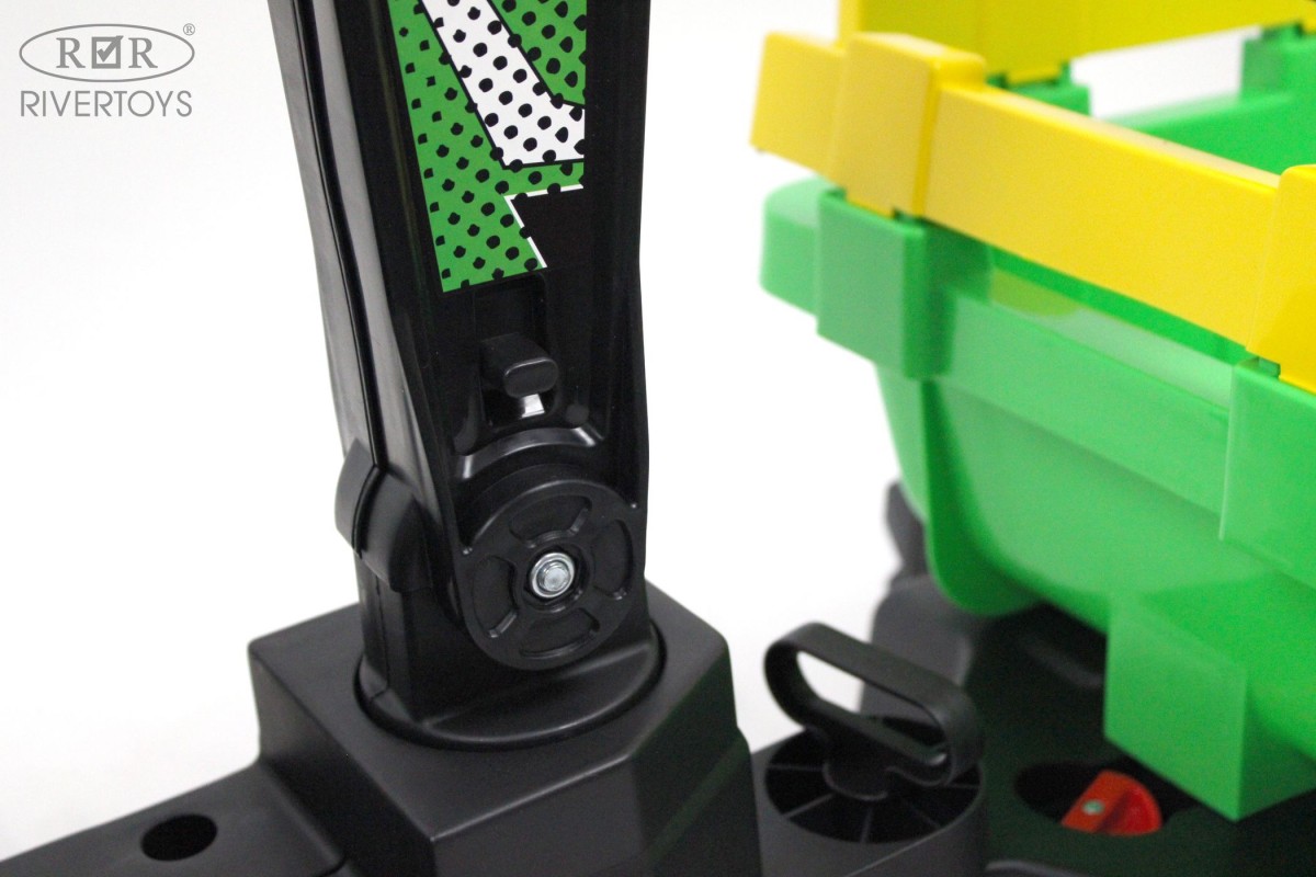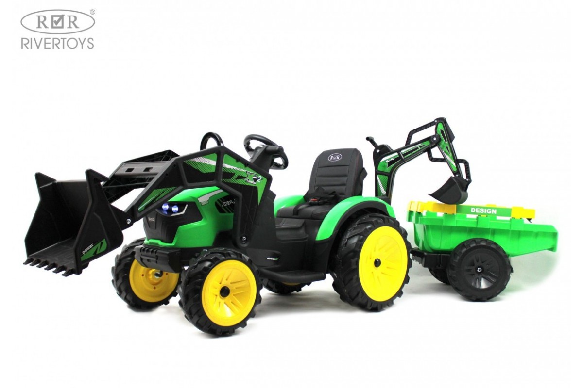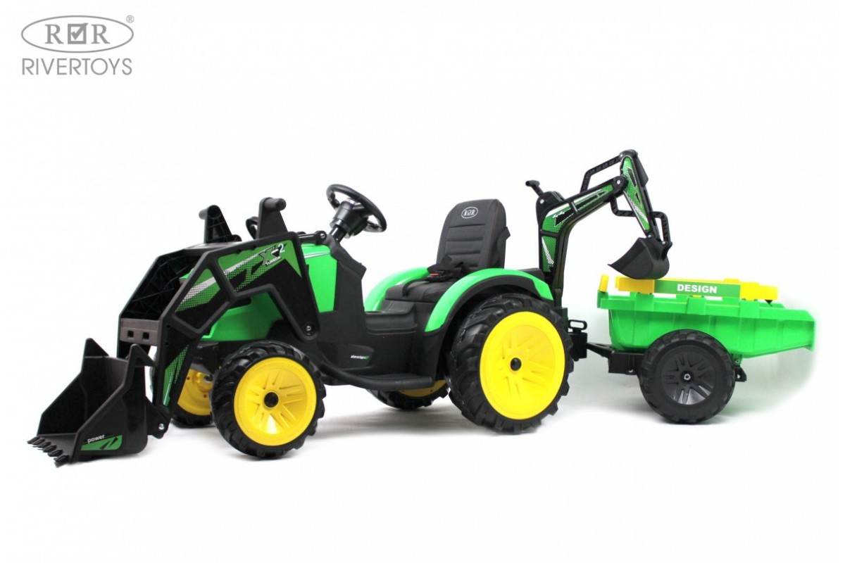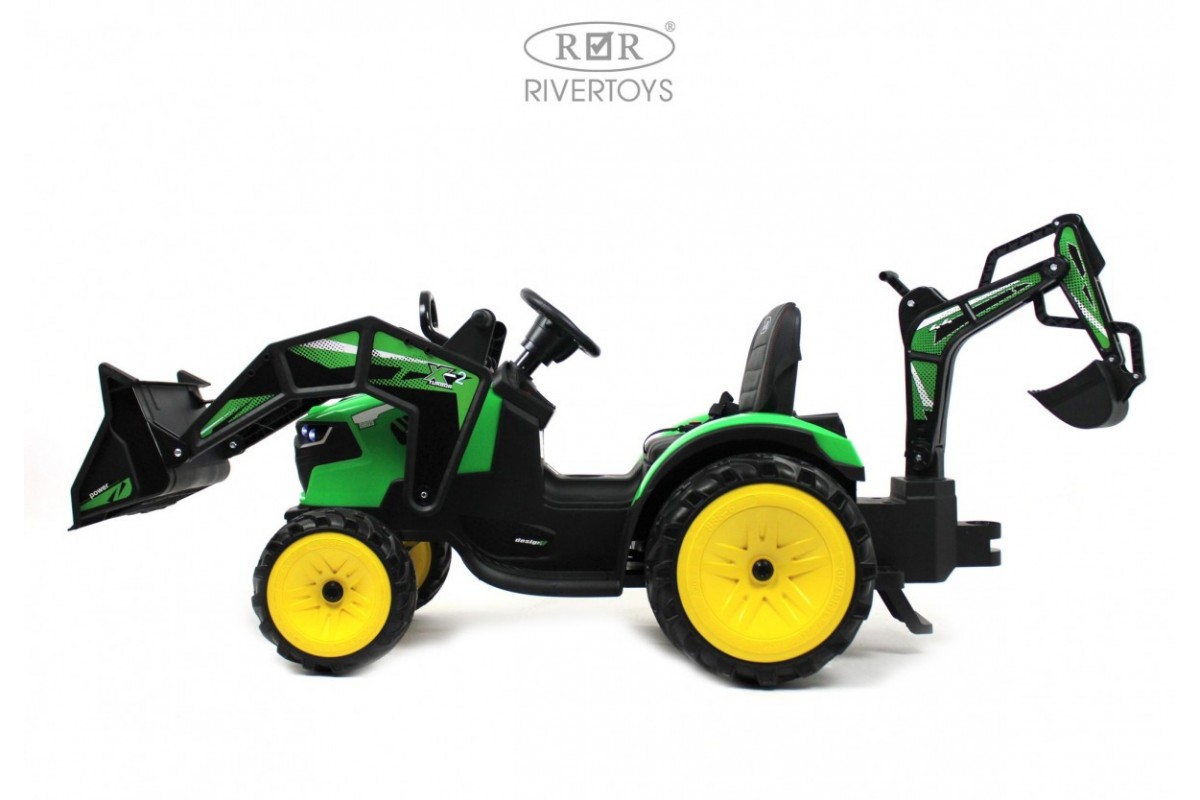 Оснащён ковшом-коробом спереди (4 положения) и поворотным ковшом-лопатой сзади (4 положения), а так же съемным поворотным прицепом.