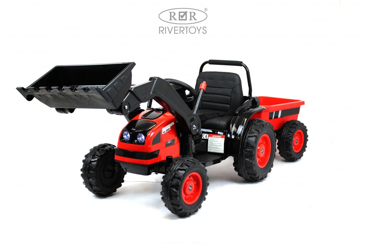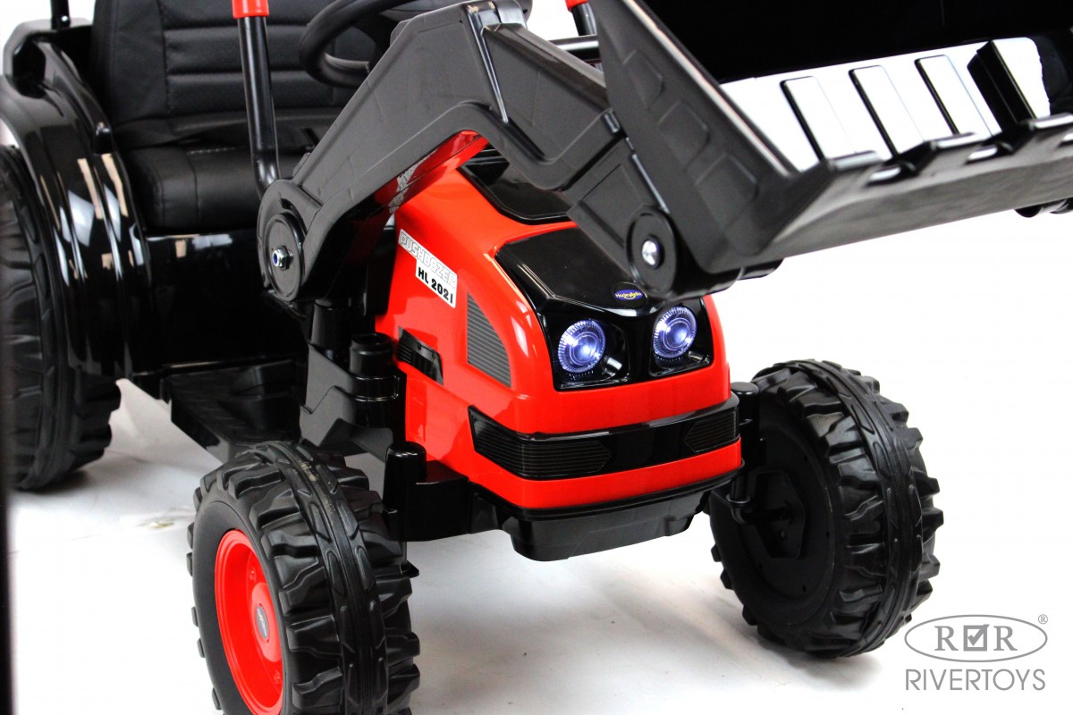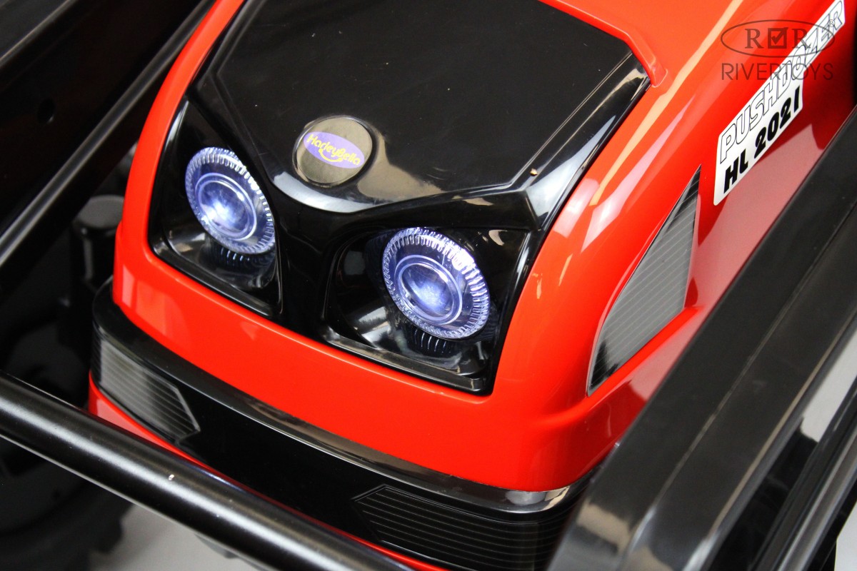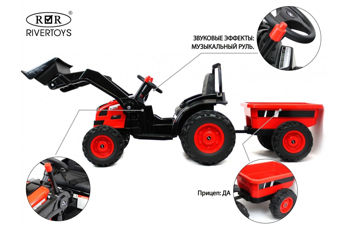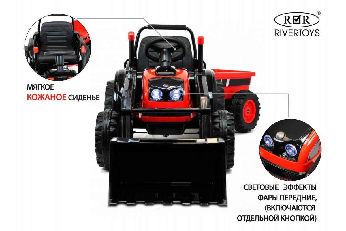 Электромобиль RiverToys HL395 представляет собой Трактор-погрузчик с прицепом. Трактор оснащен резиновыми колесами с крупным протектором и передним ковшом-коробом с механическим подъемом. Передние фары имеют подсветку, включаемую отдельной кнопкой. Сиденье обтянуто эко-кожей.