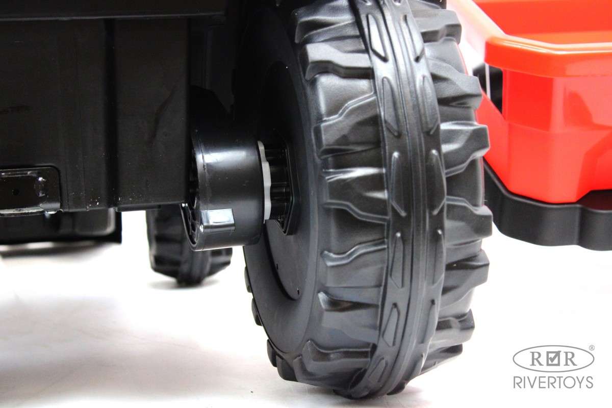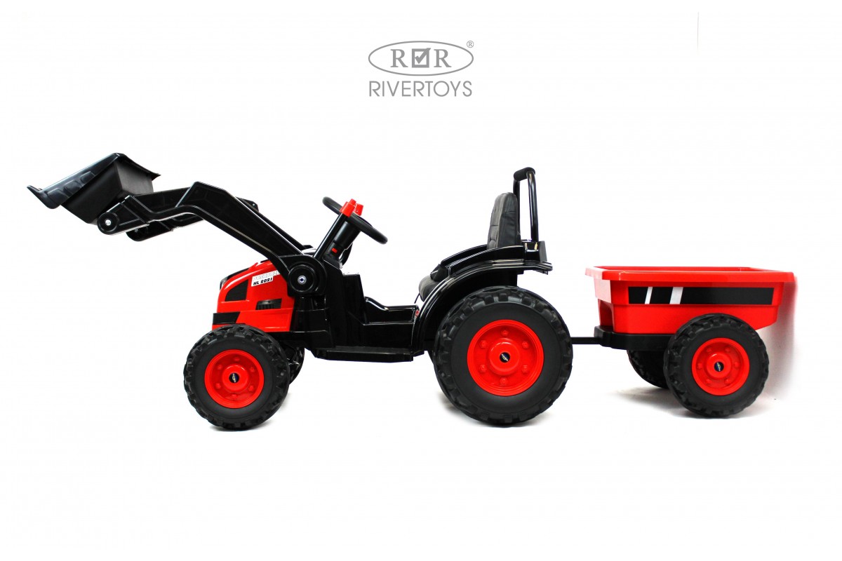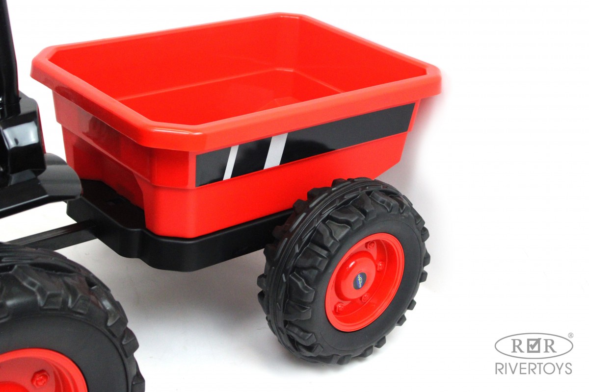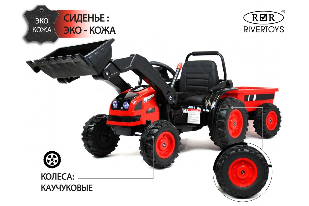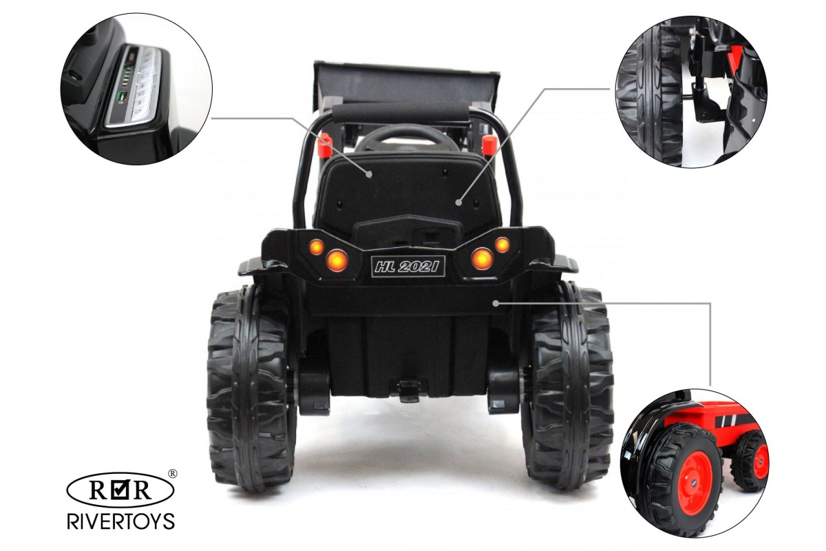 Электромобиль RiverToys HL395 представляет собой Трактор-погрузчик с прицепом. Трактор оснащен резиновыми колесами с крупным протектором и передним ковшом-коробом с механическим подъемом. Передние фары имеют подсветку, включаемую отдельной кнопкой. Сиденье обтянуто эко-кожей.