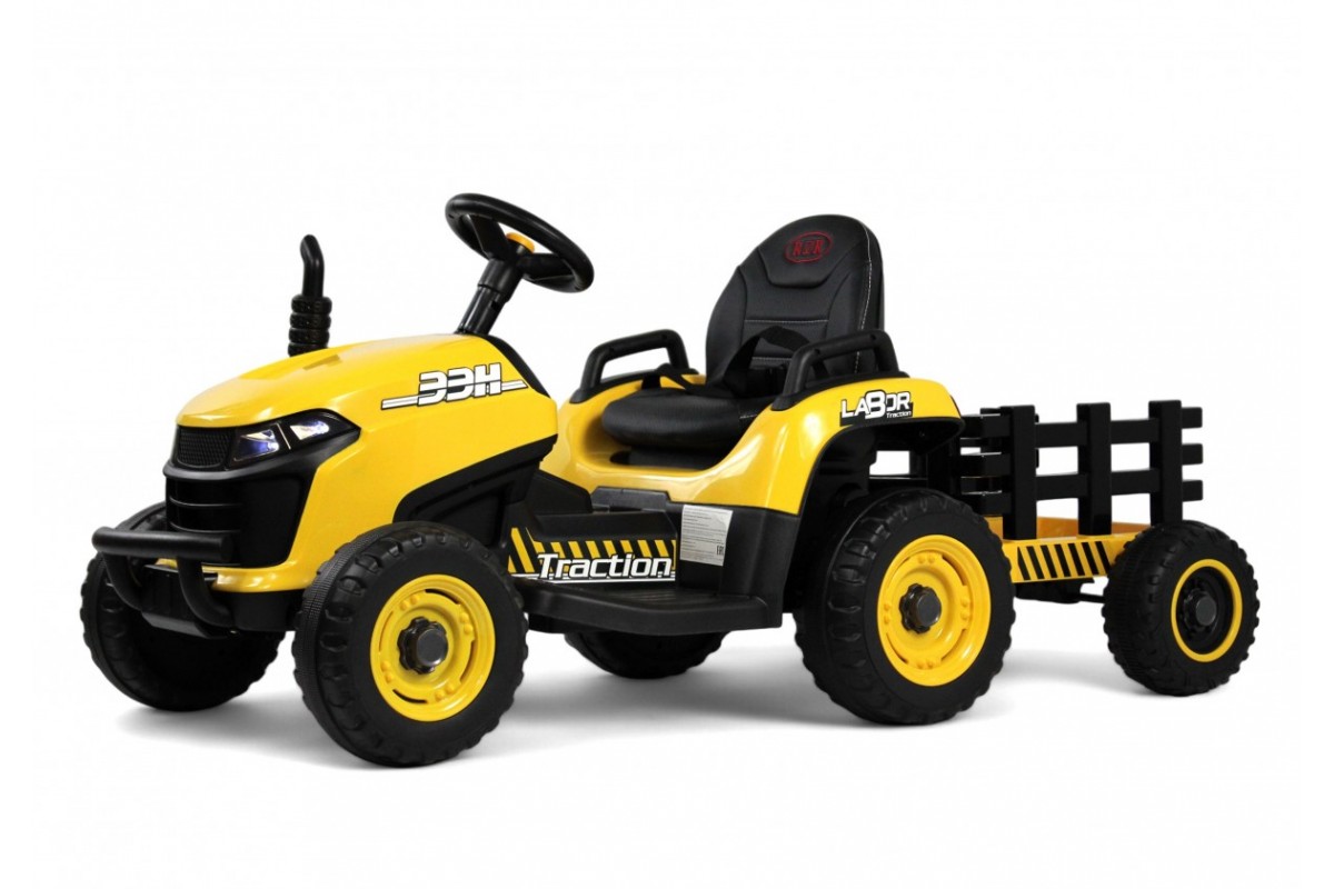 Короб трактора оснащен механическим подъемом, что добавляет удобства при использовании. Сидение выполнено из эко-кожи, а ремень безопасности - полосной. Скорость движения вперед/стоп/назад может варьироваться от 2 до 6 км/ч, что позволяет выбрать оптимальный режим для разных условий игры.