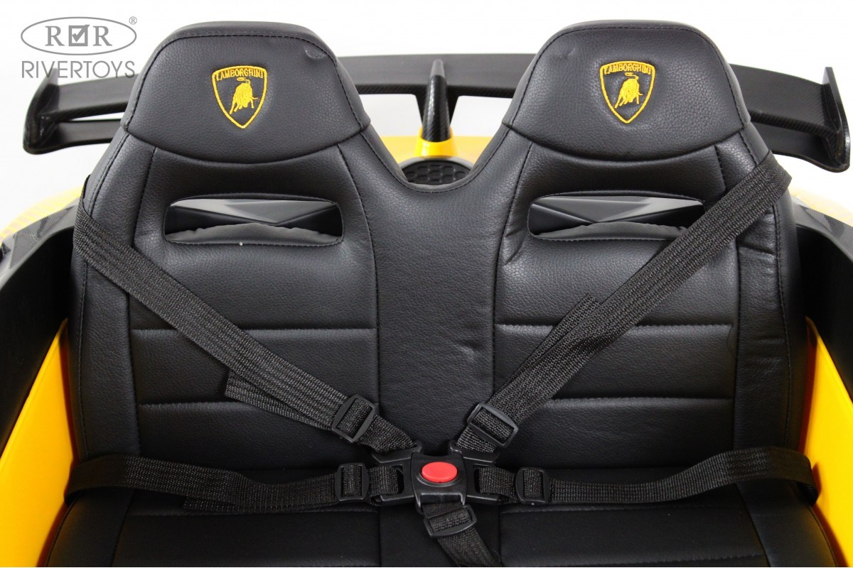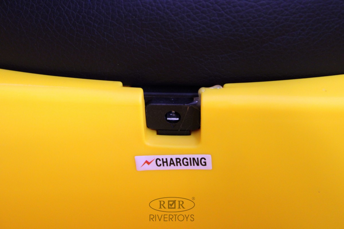 Сидение из эко-кожи рассчитано на двух человек и оснащено 5-точечным ремнем безопасности. Включение и выключение электромобиля осуществляется с помощью кнопки, а двери открываются вверх на доводчиках.