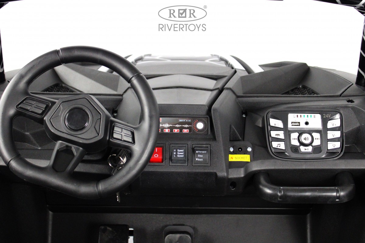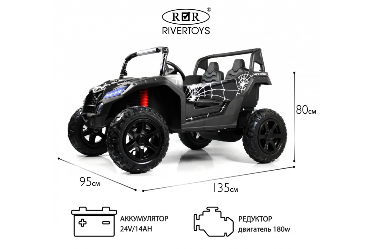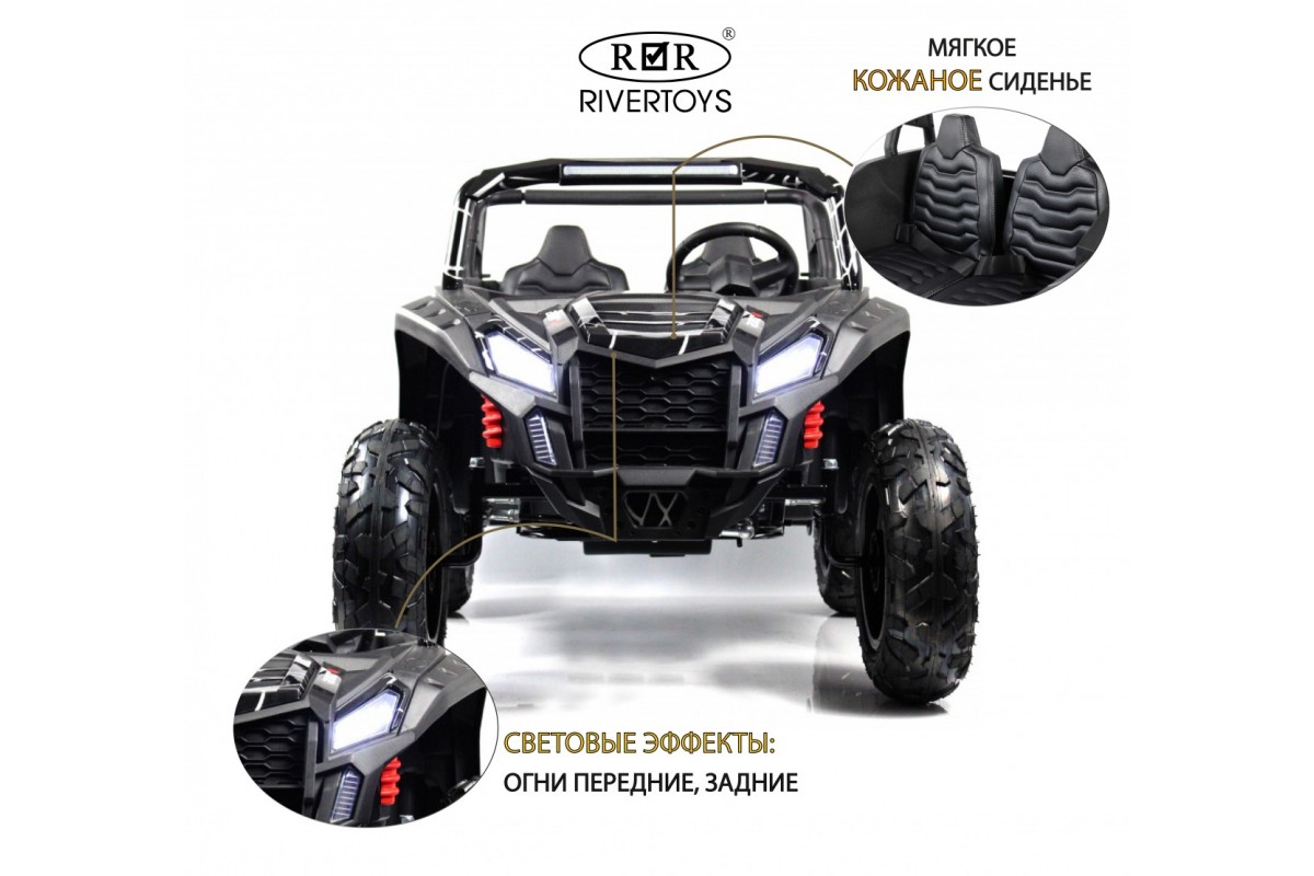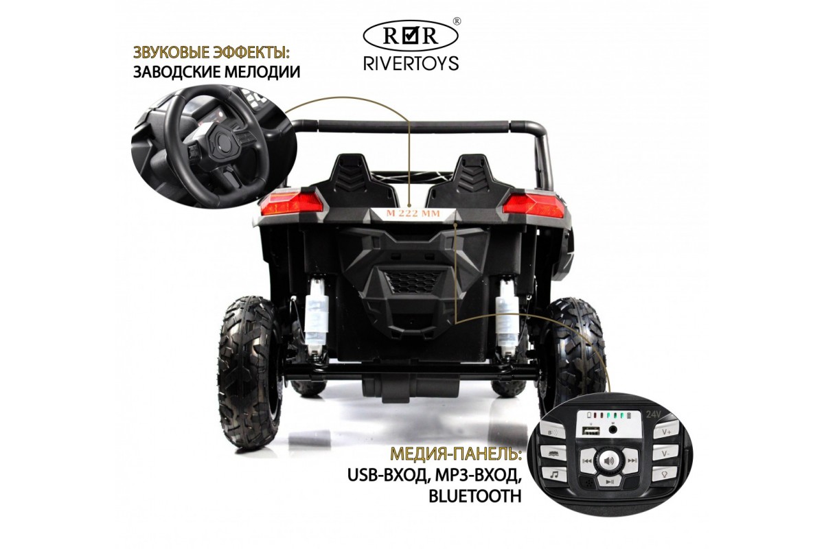 Электромобиль RiverToys Buggy M222MM позволяет одновременно катать двоих пассажиров в возрасте от 5 до 12 лет. Прочная конструкция выдерживает нагрузку до 100 кг. Машинка максимально точно скопирована с внедорожника Buggy Spyder.