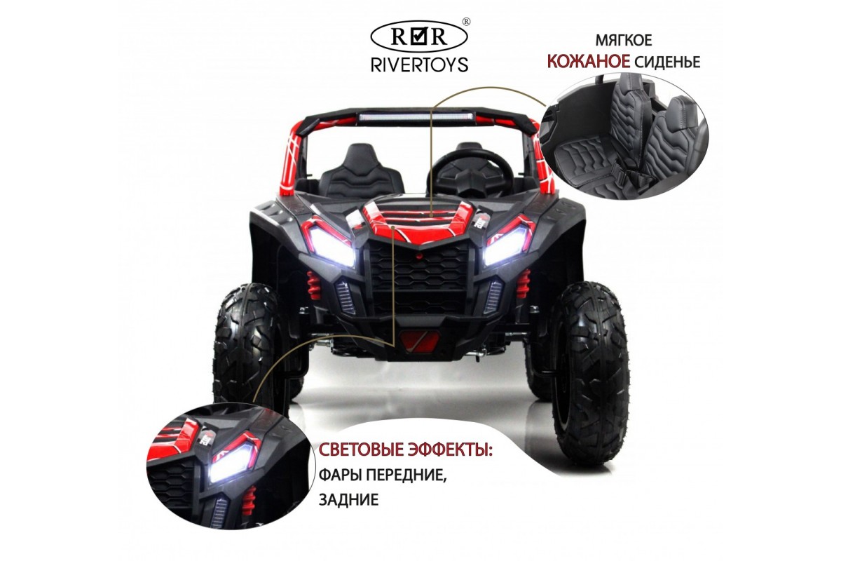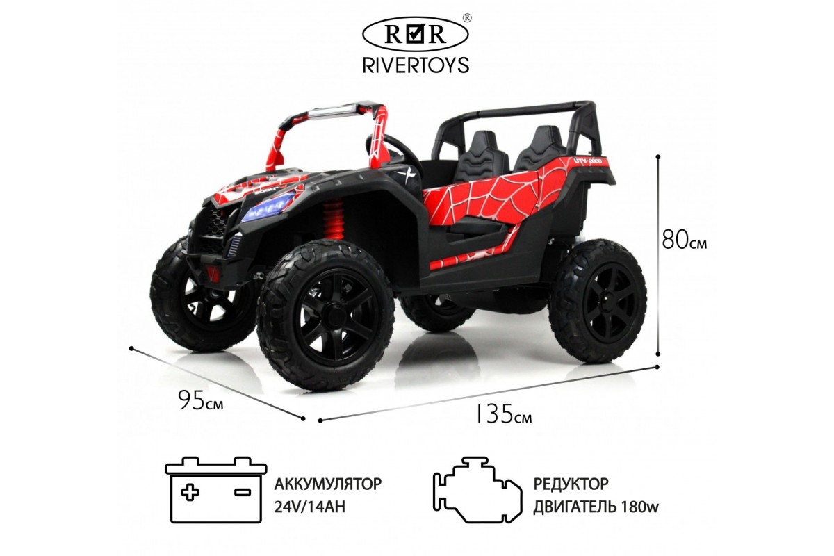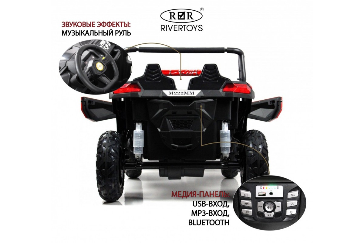 Электромобиль RiverToys Buggy M222MM позволяет одновременно катать двоих пассажиров в возрасте от 5 до 12 лет. Прочная конструкция выдерживает нагрузку до 100 кг. Машинка максимально точно скопирована с внедорожника Buggy Spyder.