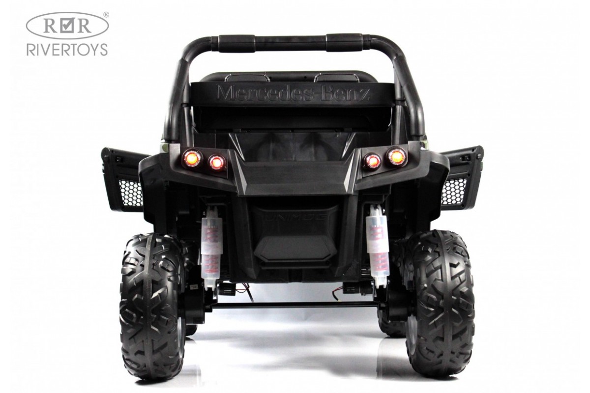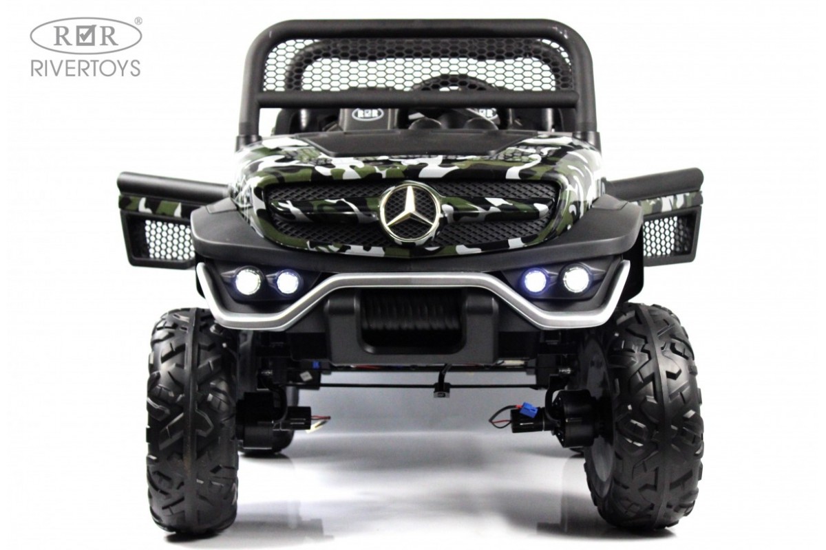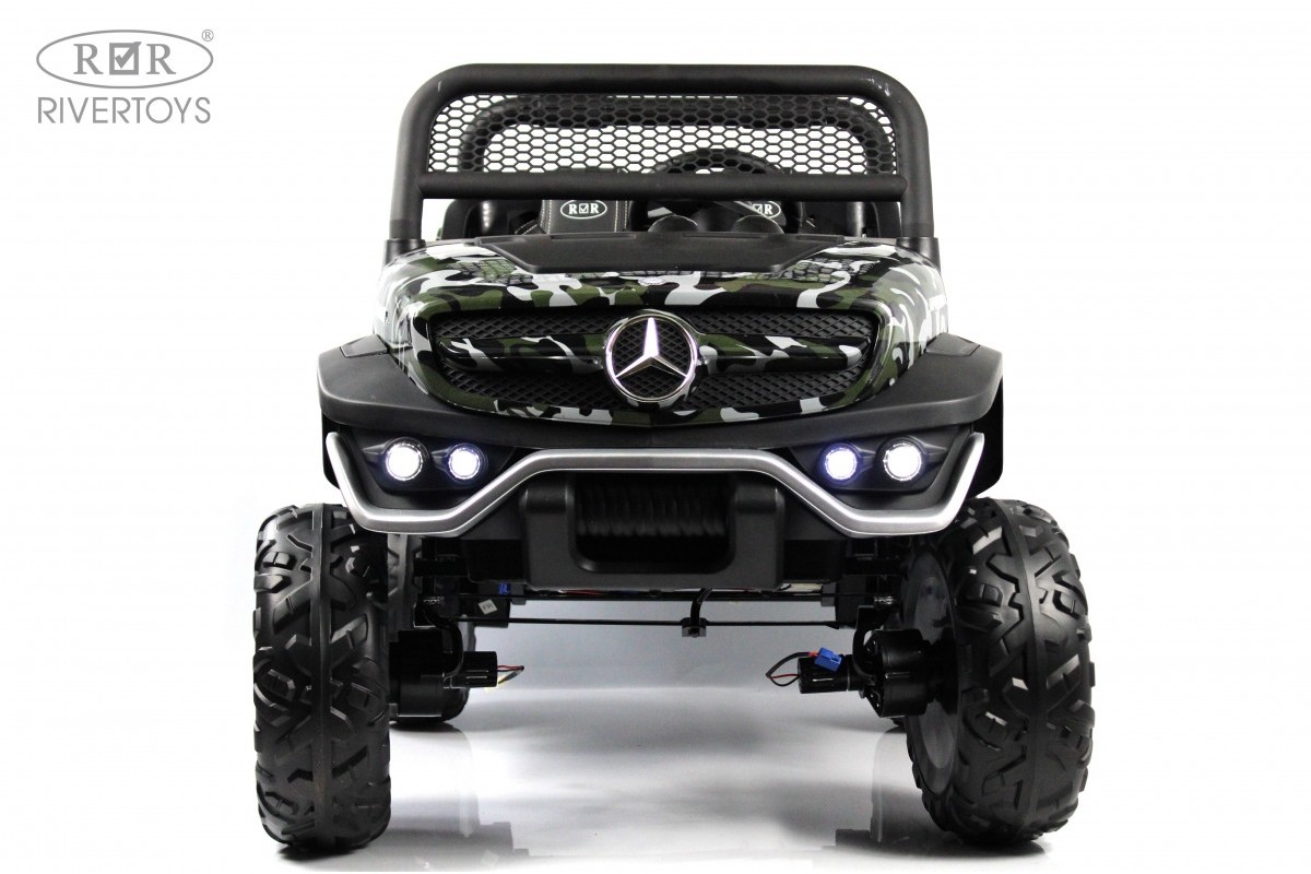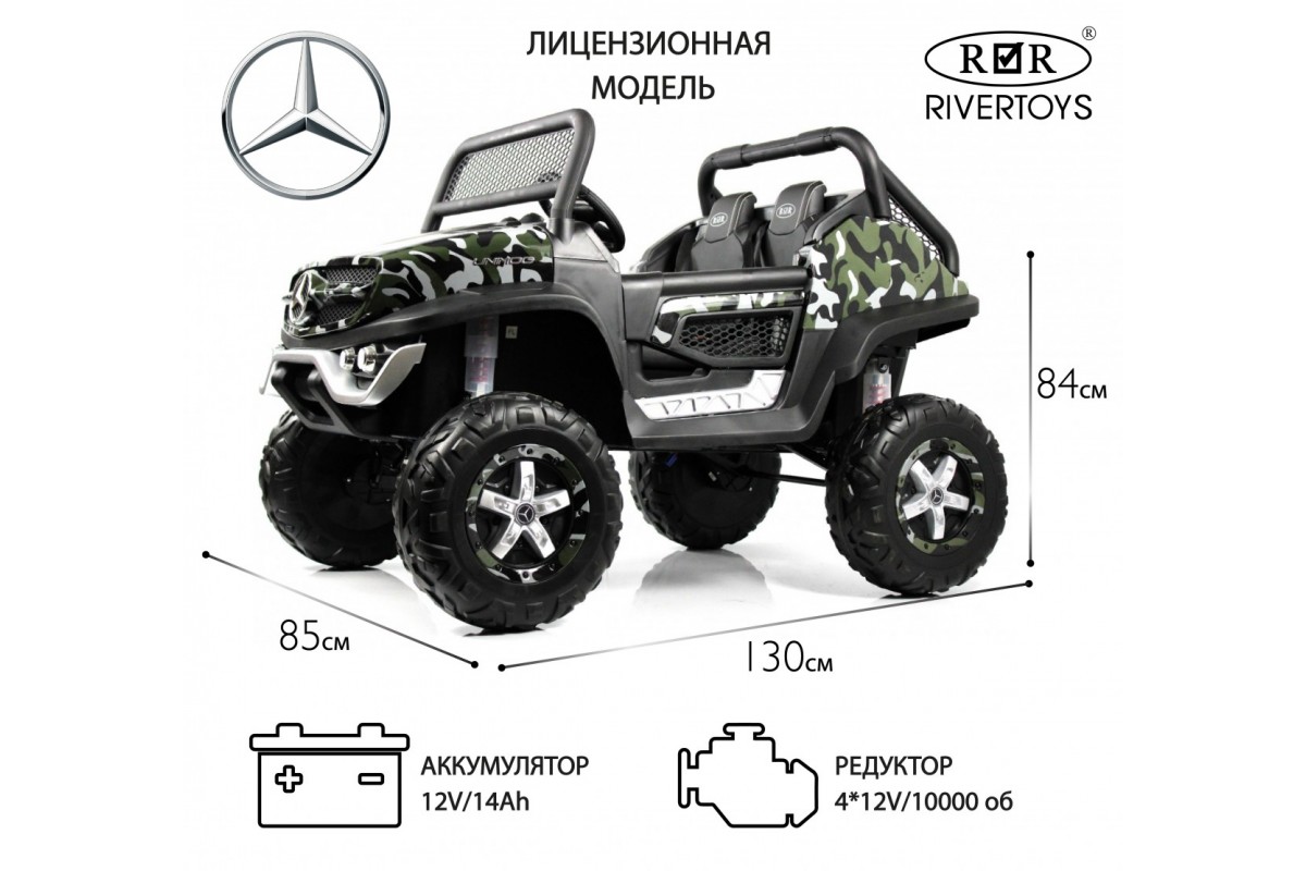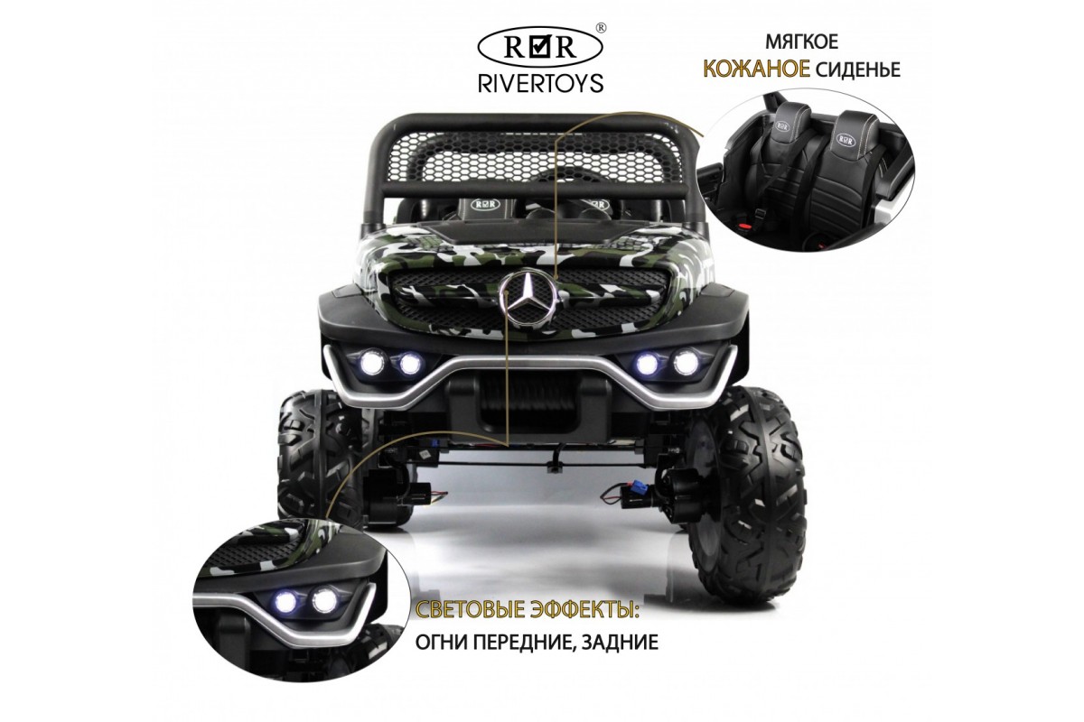 RiverToys Unimog Concep P555BP 4WD (ЛИЦЕНЗИОННАЯ МОДЕЛЬ) – большой электромобиль, представленный в виде внедорожника Mercedes-Benz. Он оснащен вместительным отсеком для игрушек и вещей. В салоне установлено мягкое кожаное сидение, рассчитанное на 2 посадочных места.