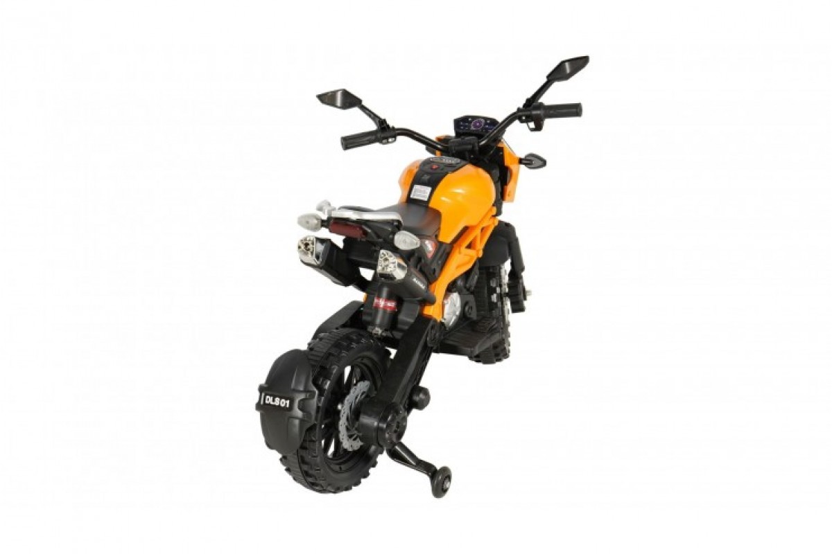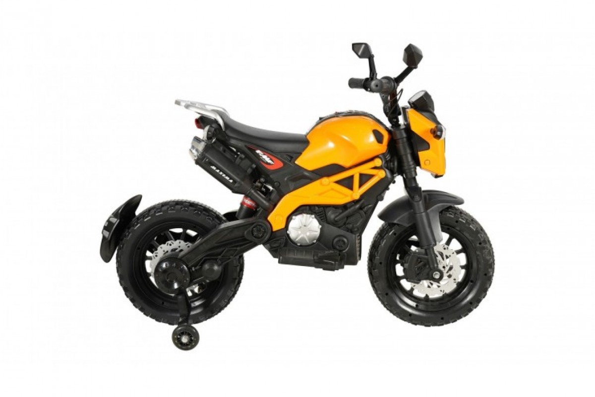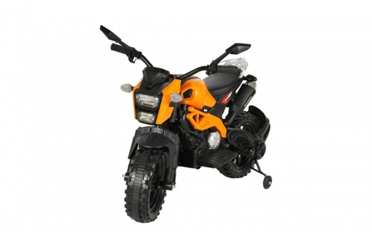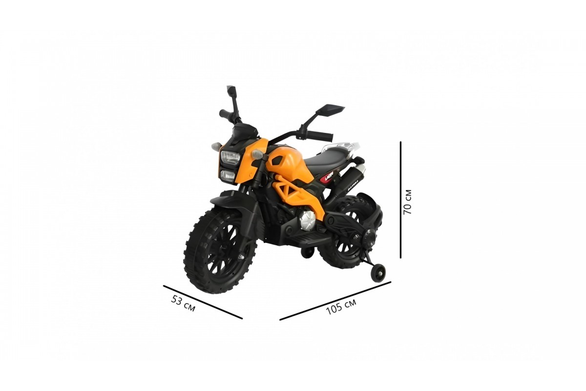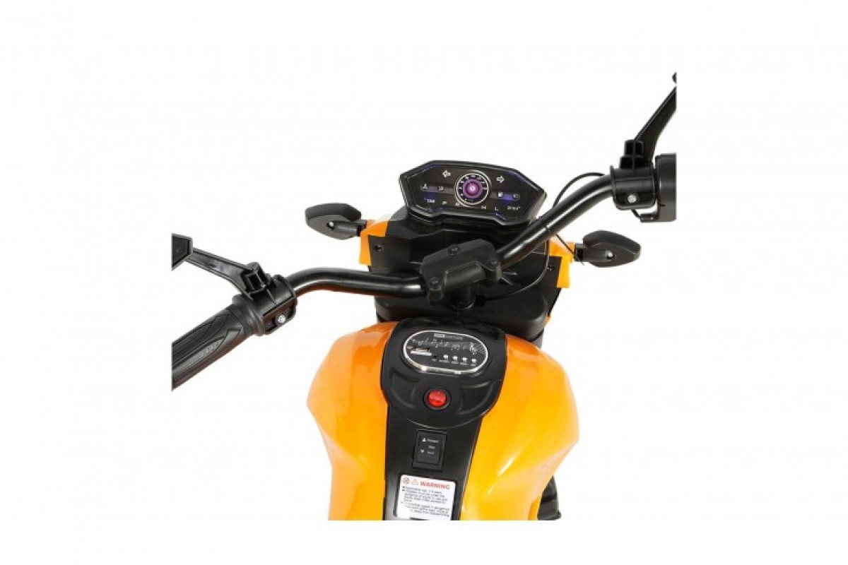 Мотоцикл представляет собой уменьшенную копию настоящего мотоцикла. Обтекаемая форма обеспечивает лучшую аэродинамику и эффектный внешний вид. Разместиться с комфортом за рулем мотоцикла позволит наличие удобного сиденья. Для ног имеются специальные подставки с легко моющимся покрытием. Они расположены по бокам. Поворотная ручка газа, обеспечивает пропорциональный набор скорости мотоцикла. Панель приборов мотоцикла имеет декоративную подсветкой. Светодиодные фары позволят ребенку кататься на мотоцикле в темное время суток.