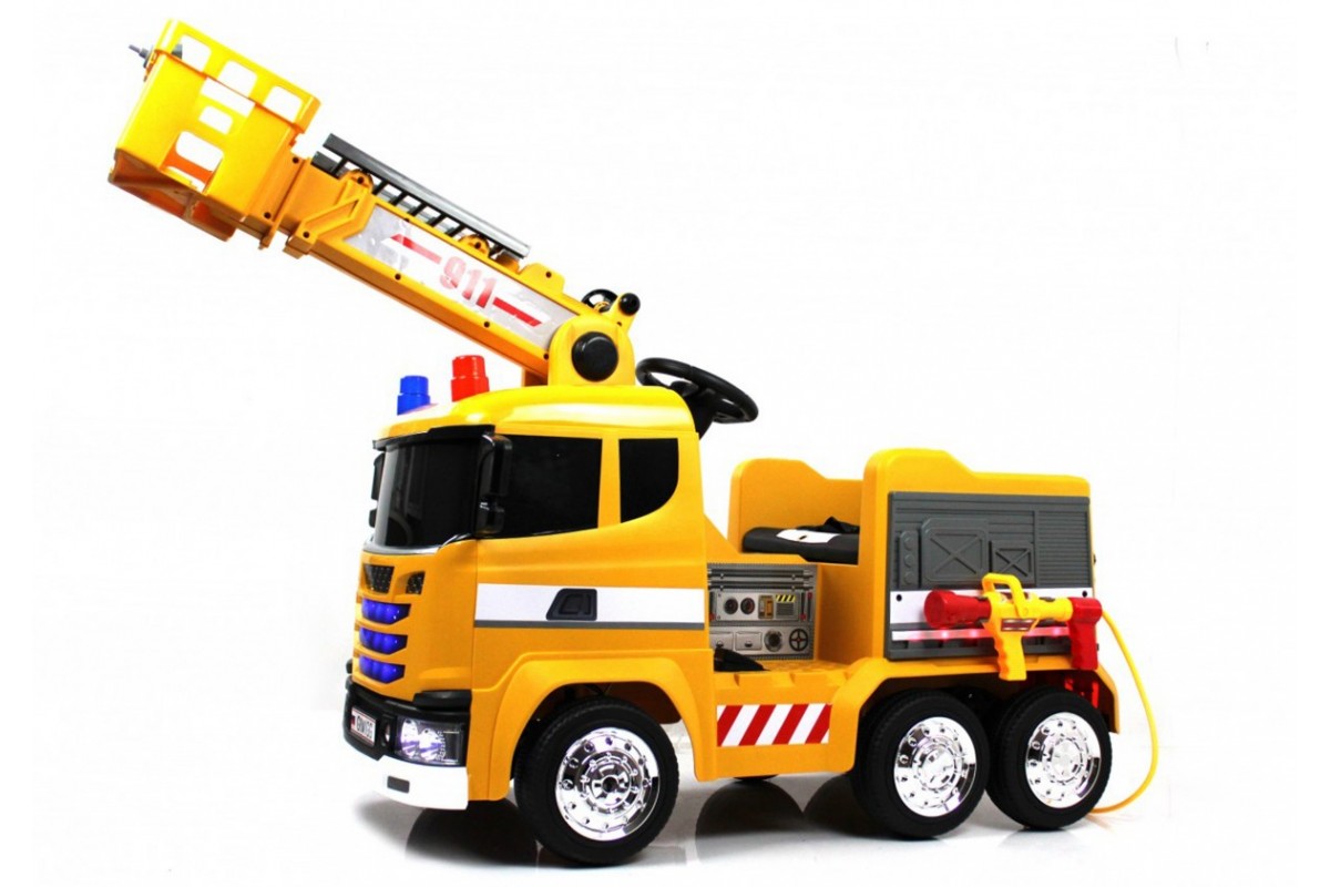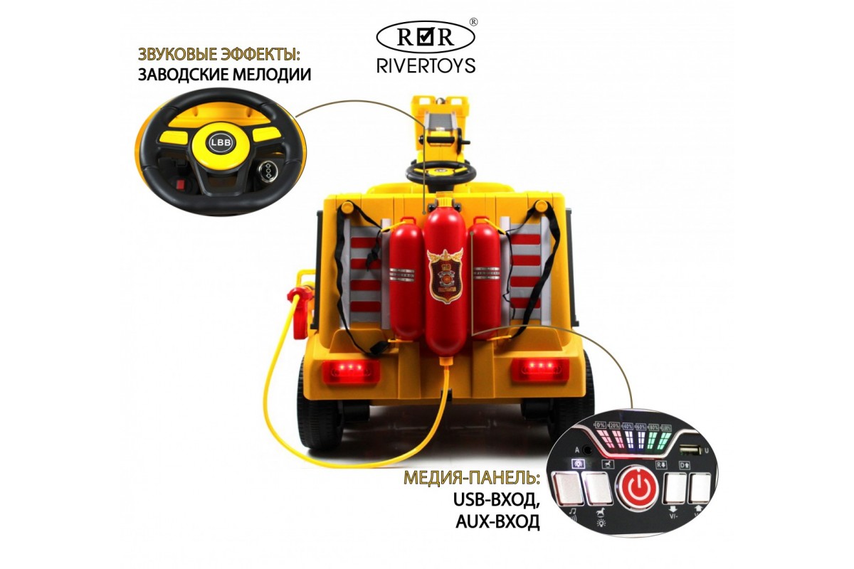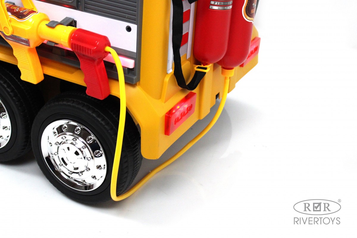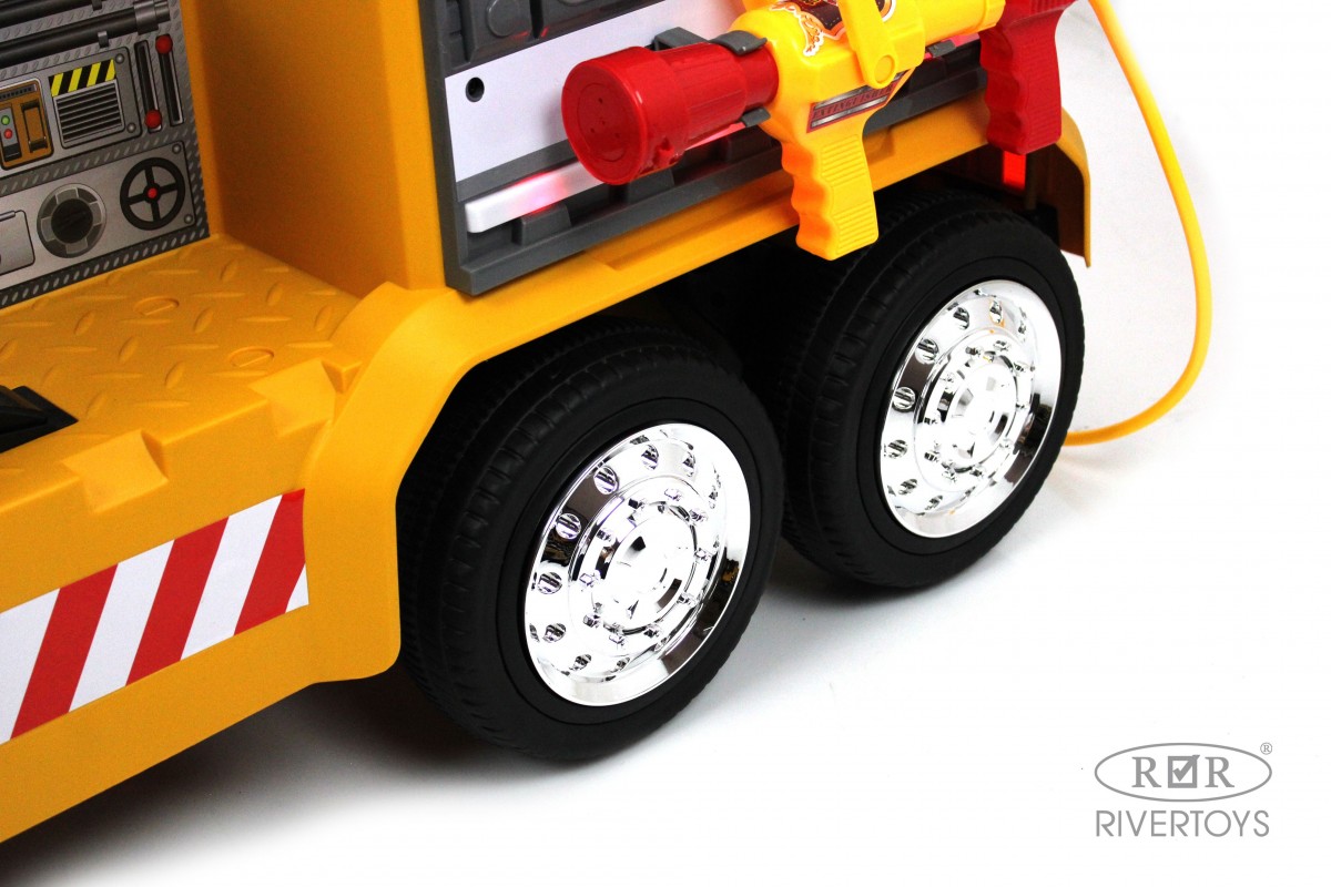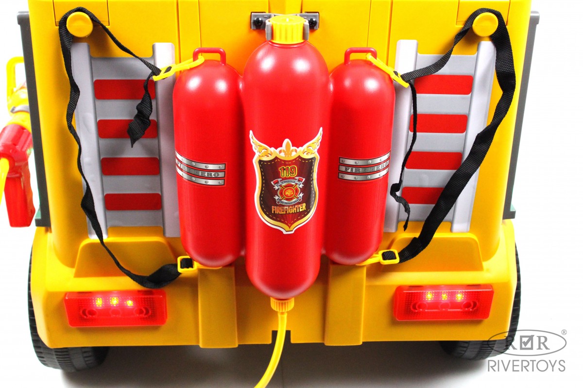 Движение: педаль газа, электронные игровые элементы пожарной техники- водомет на подъемнике, задний насосный огнетушитель.