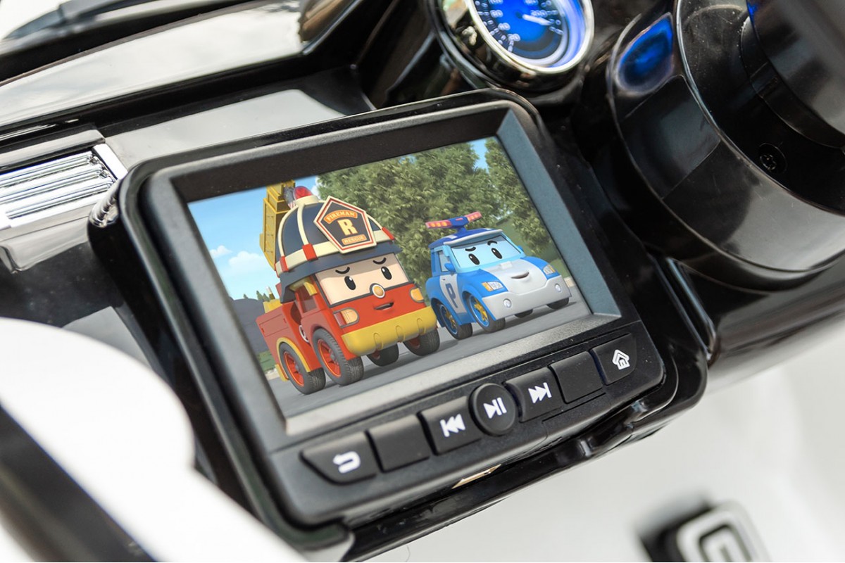 - Электромобиль изготовлен на металлическом каркасе и оснащен ударопрочным корпусом из пластика.