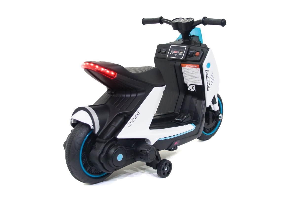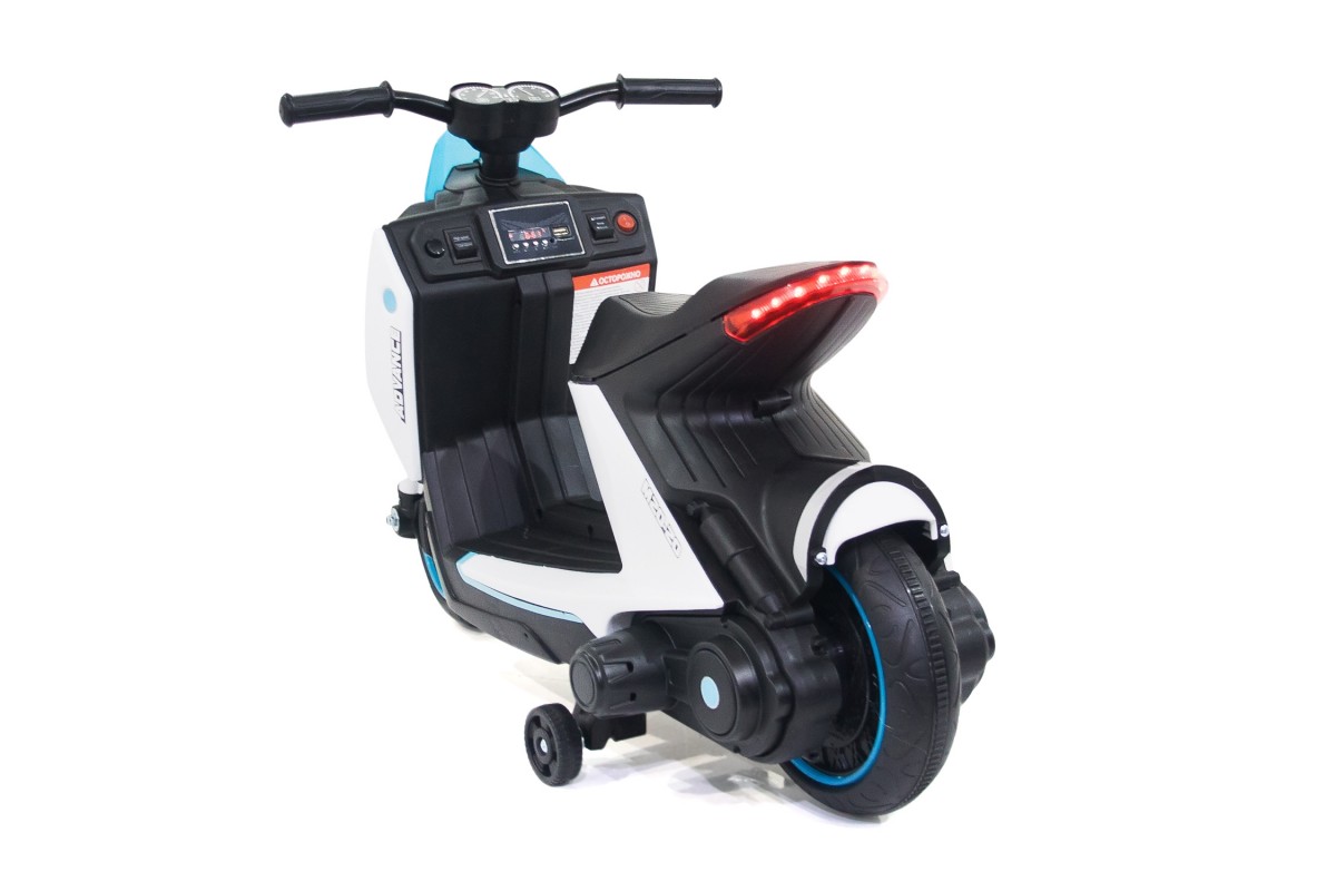 При нажатии кнопки пуска воспроизводится звук работающего мотора. На панели расположена кнопка звукового сигнала, реле переключения направления движения, а также реле выбора скорости движения скутера. Колеса отлично держат равновесие и сцепление на любой дороге. На торпеде также расположена магнитола, к которой можно подключать любые носители с музыкой, USB флеш карты или SD карты, слушать радио или же просто слушать различные уже предустановленные мелодии.