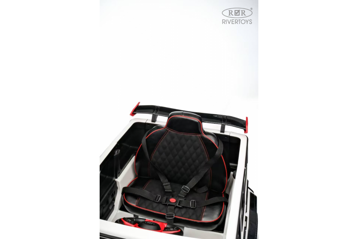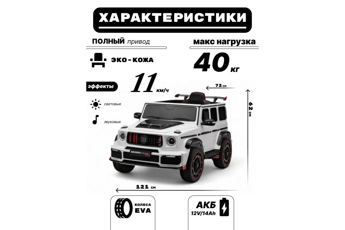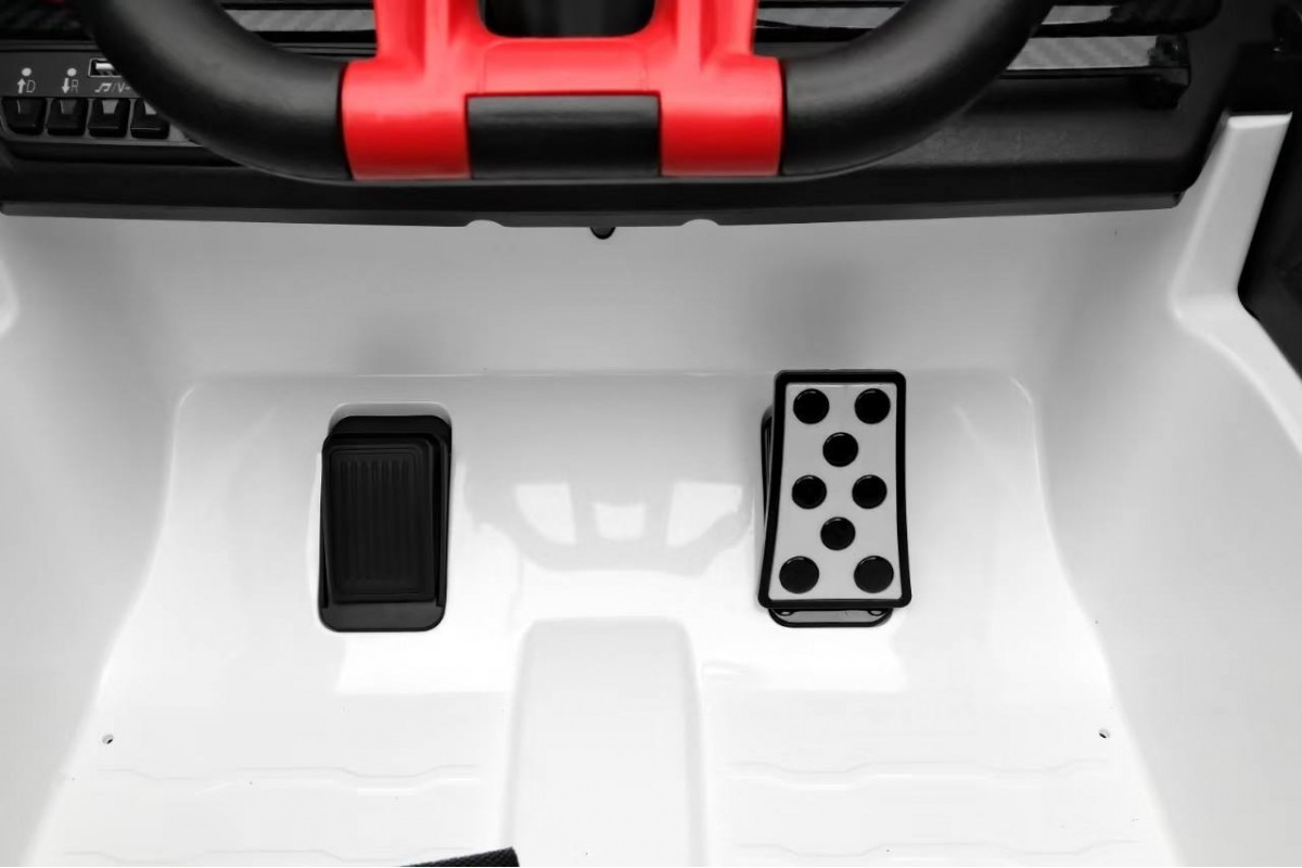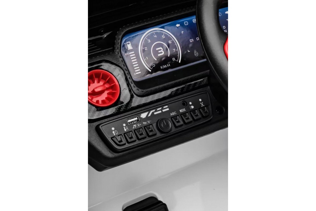 Особенности модели: переключение 2WD/4WD (Отдельная кнопка на медиа-панели. При переключении 2WD, передние колеса движутся свободным ходом), управление с телефона с отдельного приложения (скачать можно по QR коду), карбоновые вставки, педаль тормоза, карбоновый спойлер, подсветка приборной панели, открывается капот, индикатор напряжения аккумулятора , регулируемое, широкое сиденье под рост ребенка ,принцип чемодана, открываются двери