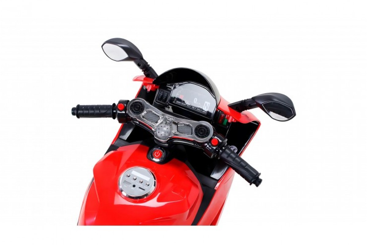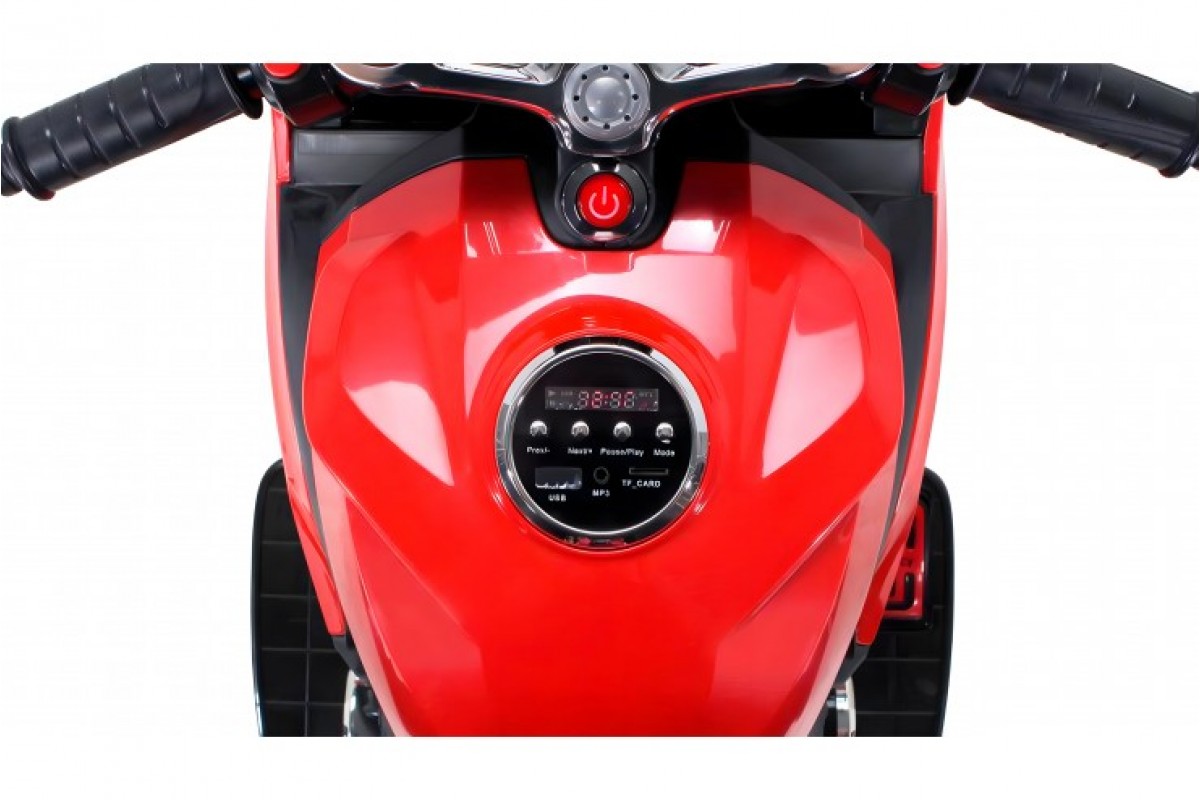 Запоминающийся внешний вид мотоцикла дополнен отличным функционалом: два мотора по 18 Ватт, резиновые колеса для отличного сцепления с любым дорожным покрытием, каучуковые дополнительные боковые колесики для хорошей устойчивости, эргономичное сиденье из экокожи, амортизатор для комфортного катания, боковые зеркала и задние стопы из мягкого пластика, магнитола для прослушивания любимой музыки.