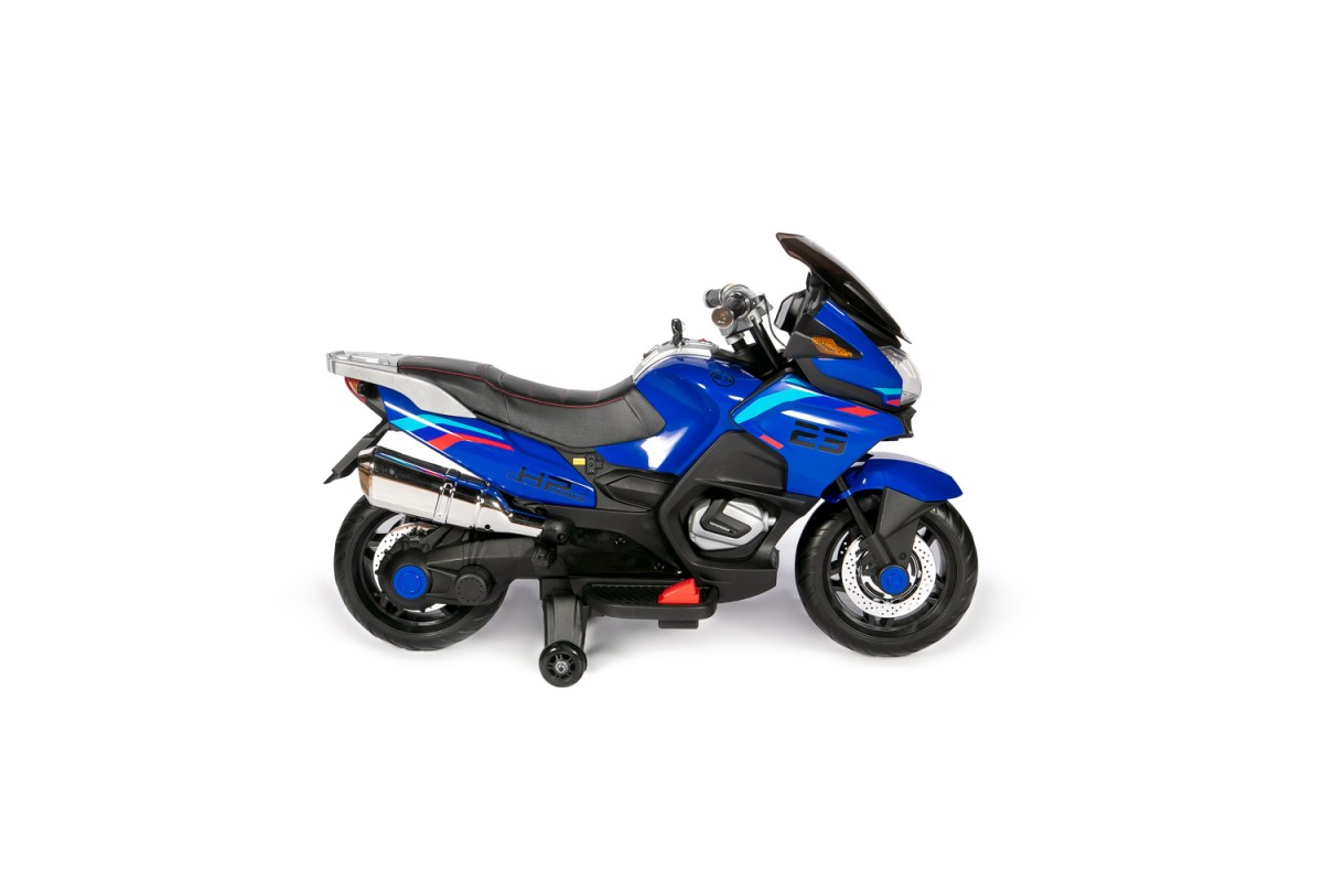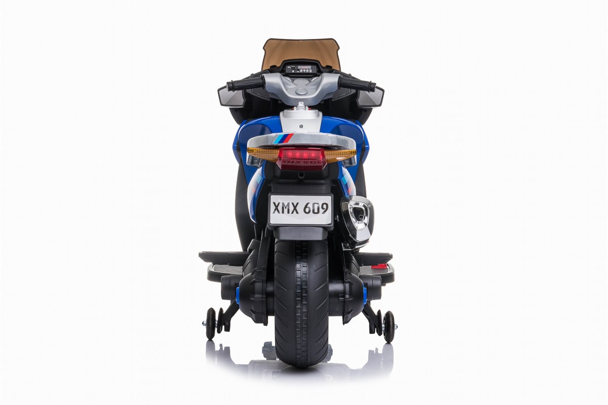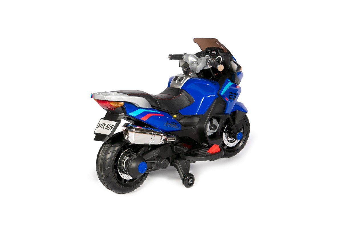 Детский электромотоцикл XMX (синий, EVA, с ручкой газа, 12V) - XMX609-BLUE - это новый двухмоторный мотоцикл, копия BMW R1200 RT. На EVA колесах, кожаным сидением, неоновой подсветкой. Для младших детей предусмотрены запасные боковые колеса для устойчивости, которые легко снимаются.