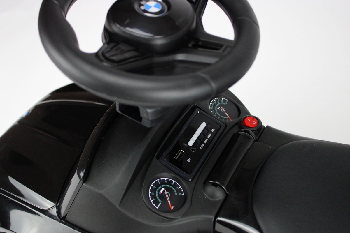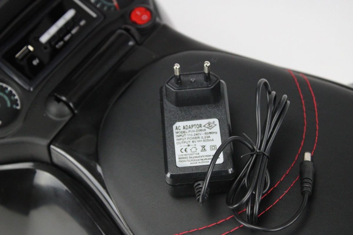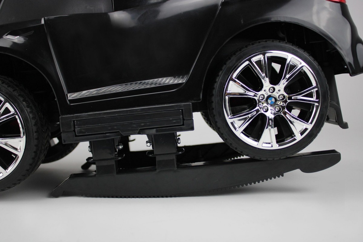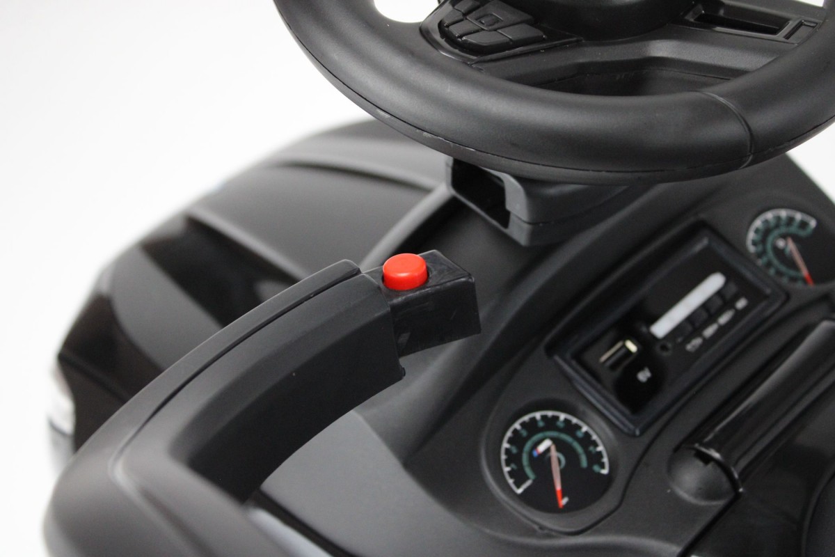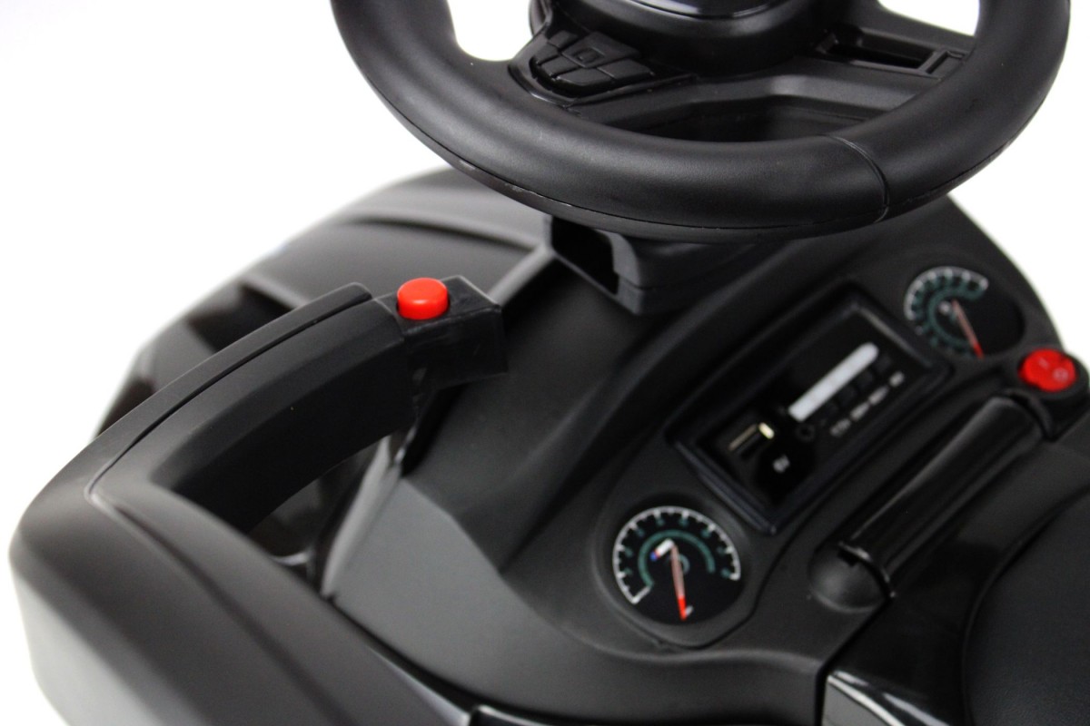 В данной модели предусмотрены выдвигаемые подножки и боковые ограничители, которые не дадут малышу выпасть во время езды. Сидение здесь мягкое из эко-кожи, а также имеется музыкальный руль и световые эффекты. Под рулем расположена приборная панель с разъемами для подключения внешних накопителей (USB, SD, mp3), что позволяет кататься под любимые песни.