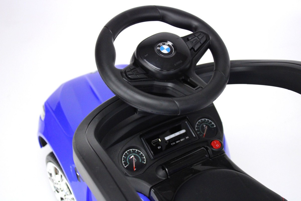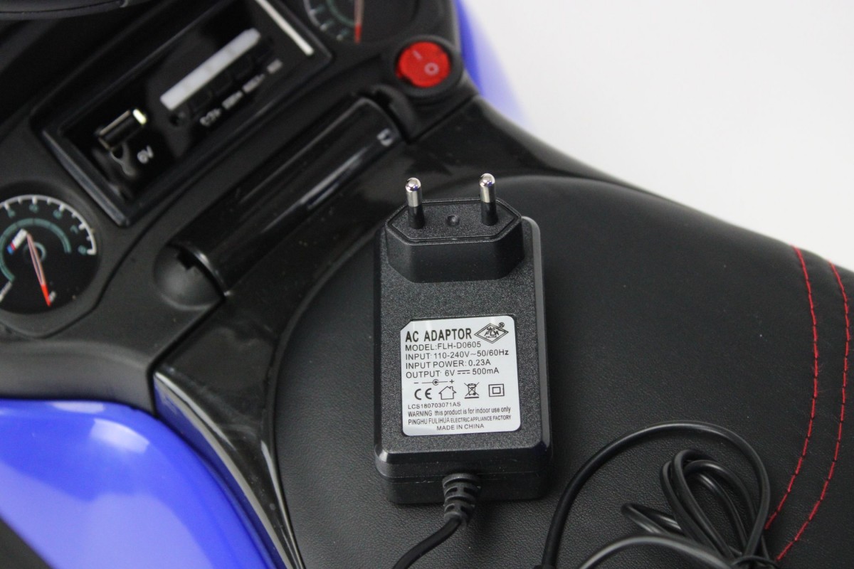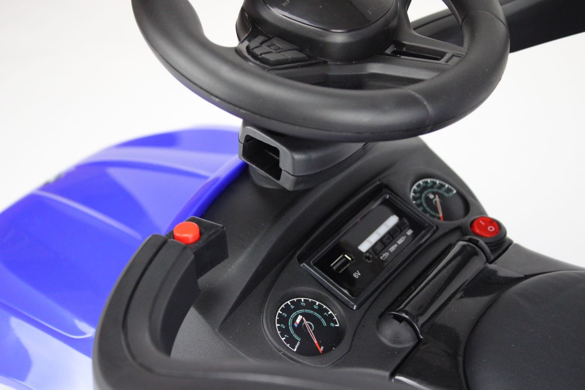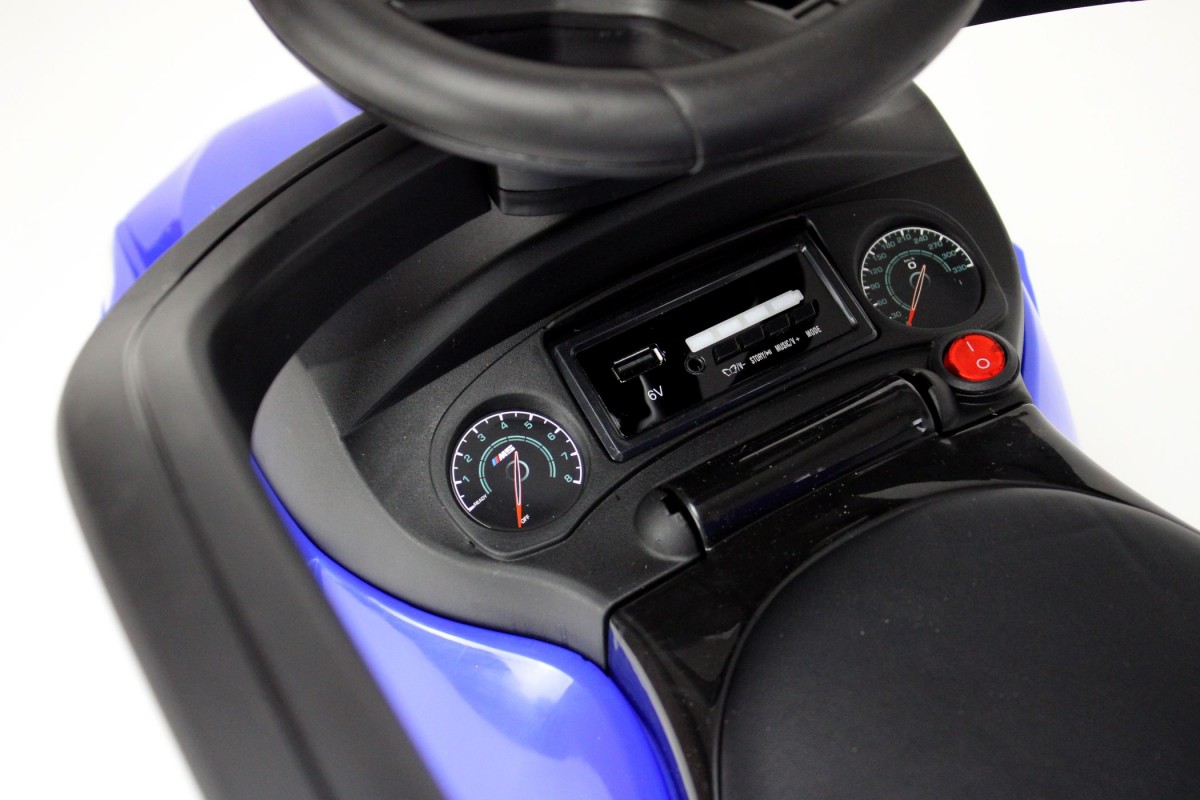 В данной модели предусмотрены выдвигаемые подножки и боковые ограничители, которые не дадут малышу выпасть во время езды. Сидение здесь мягкое из эко-кожи, а также имеется музыкальный руль и световые эффекты. Под рулем расположена приборная панель с разъемами для подключения внешних накопителей (USB, SD, mp3), что позволяет кататься под любимые песни.