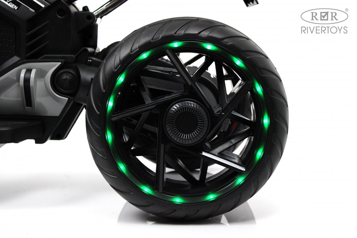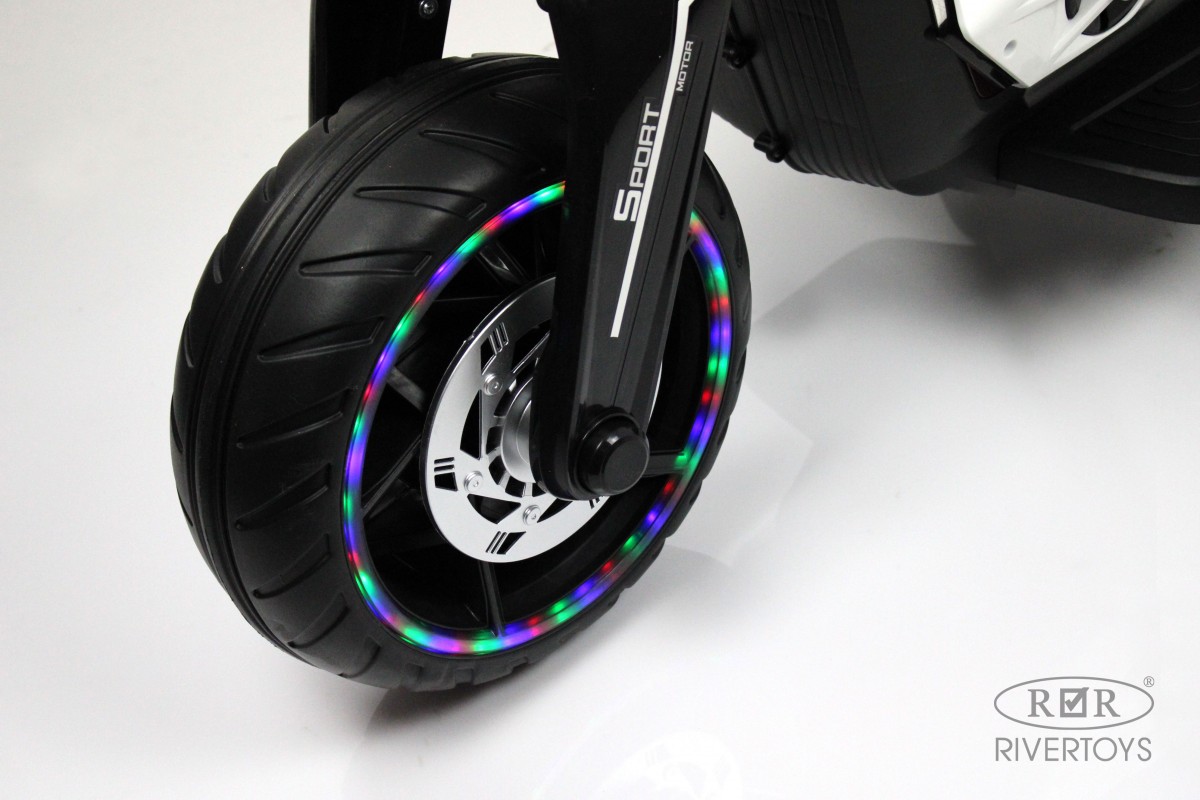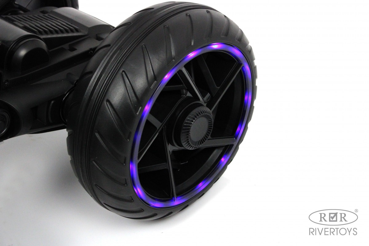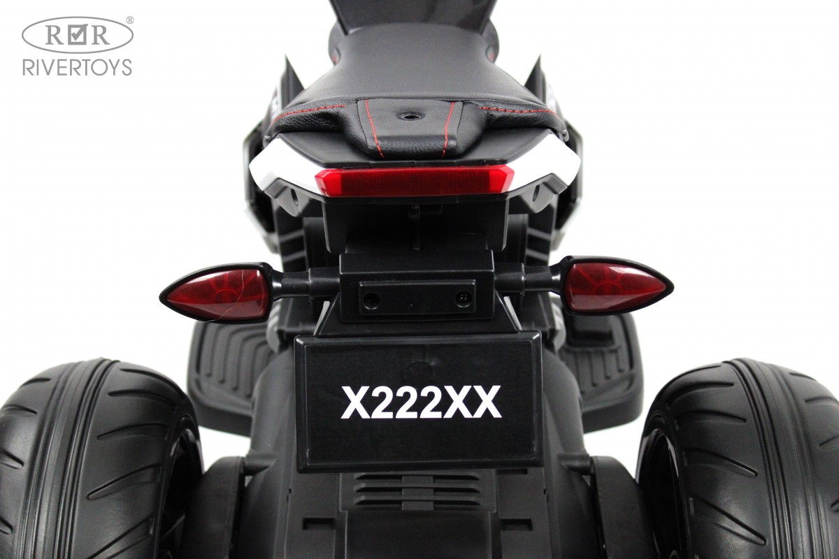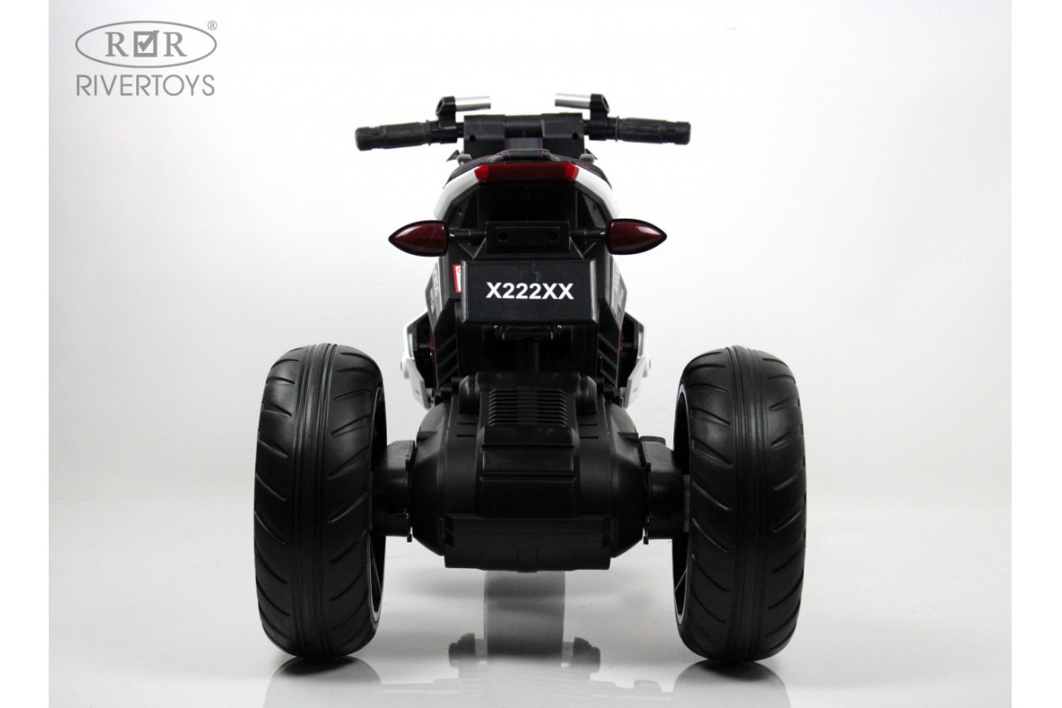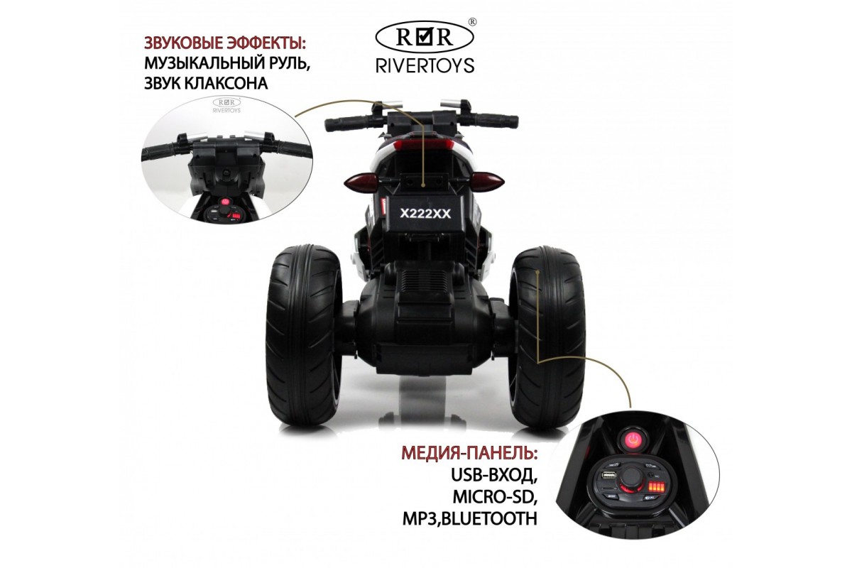 RiverToys X222XX – детский электротрицикл с устойчивой конструкцией, которую обеспечивают 3 колеса. Они выполнены из каучука и имеют светодиодную подсветку. предусмотрены приставные колеса, которые будут полезны для начинающих гонщиков, а потом их можно будет снять. Передние фары светодиодные.