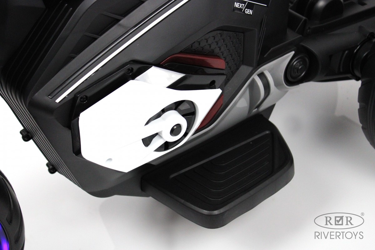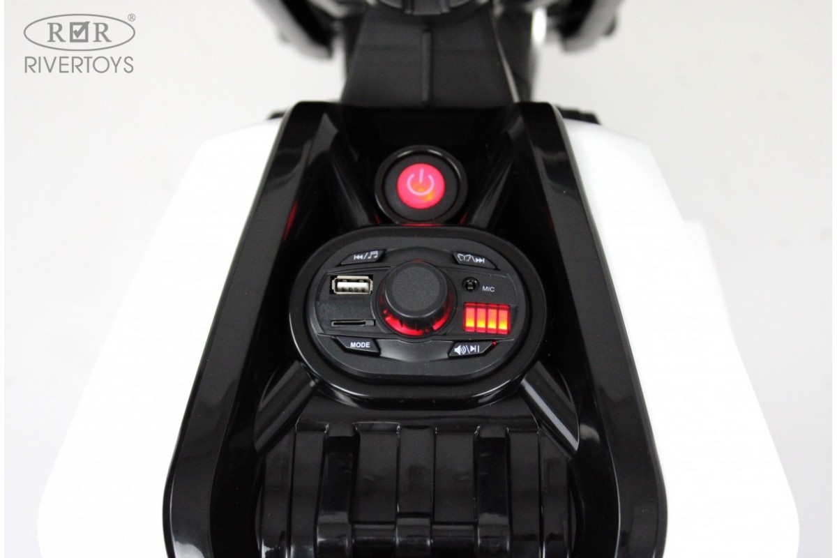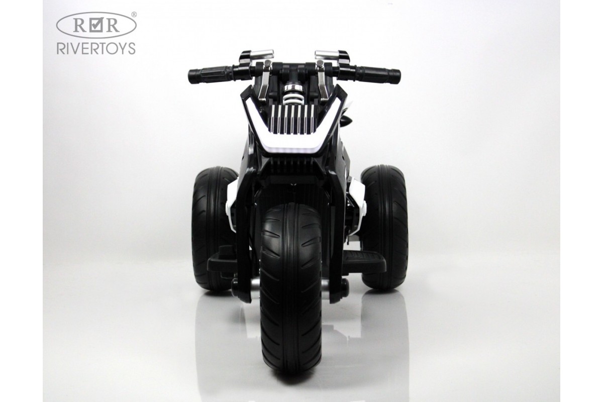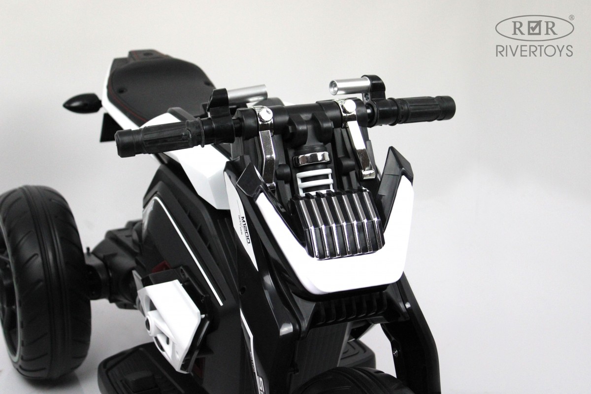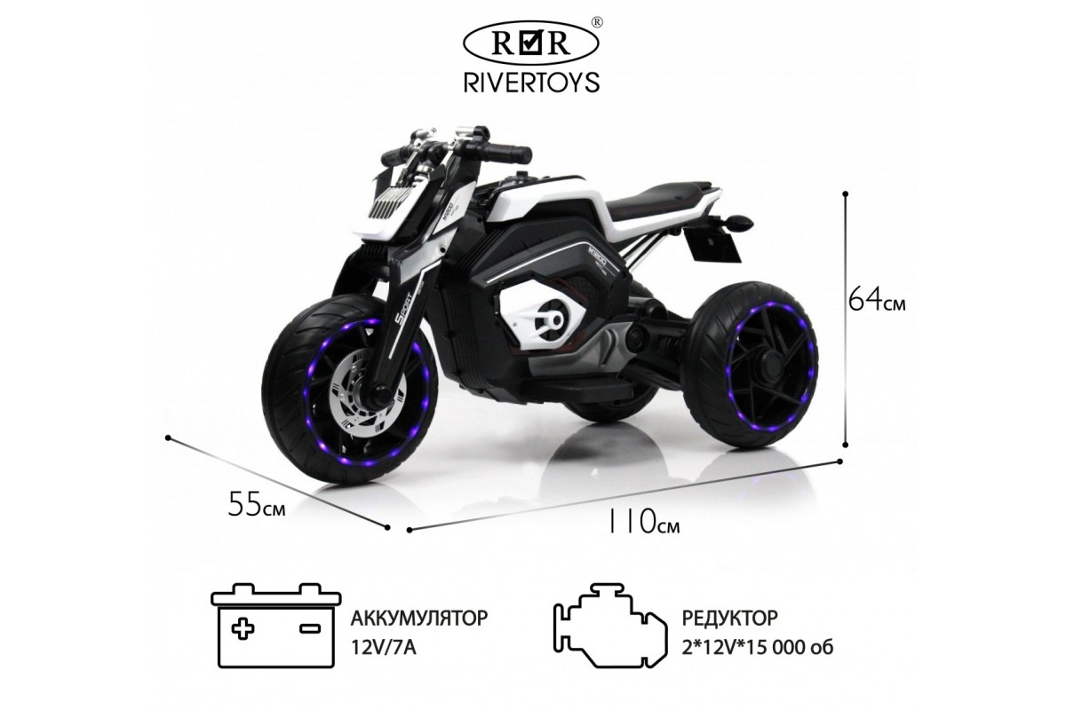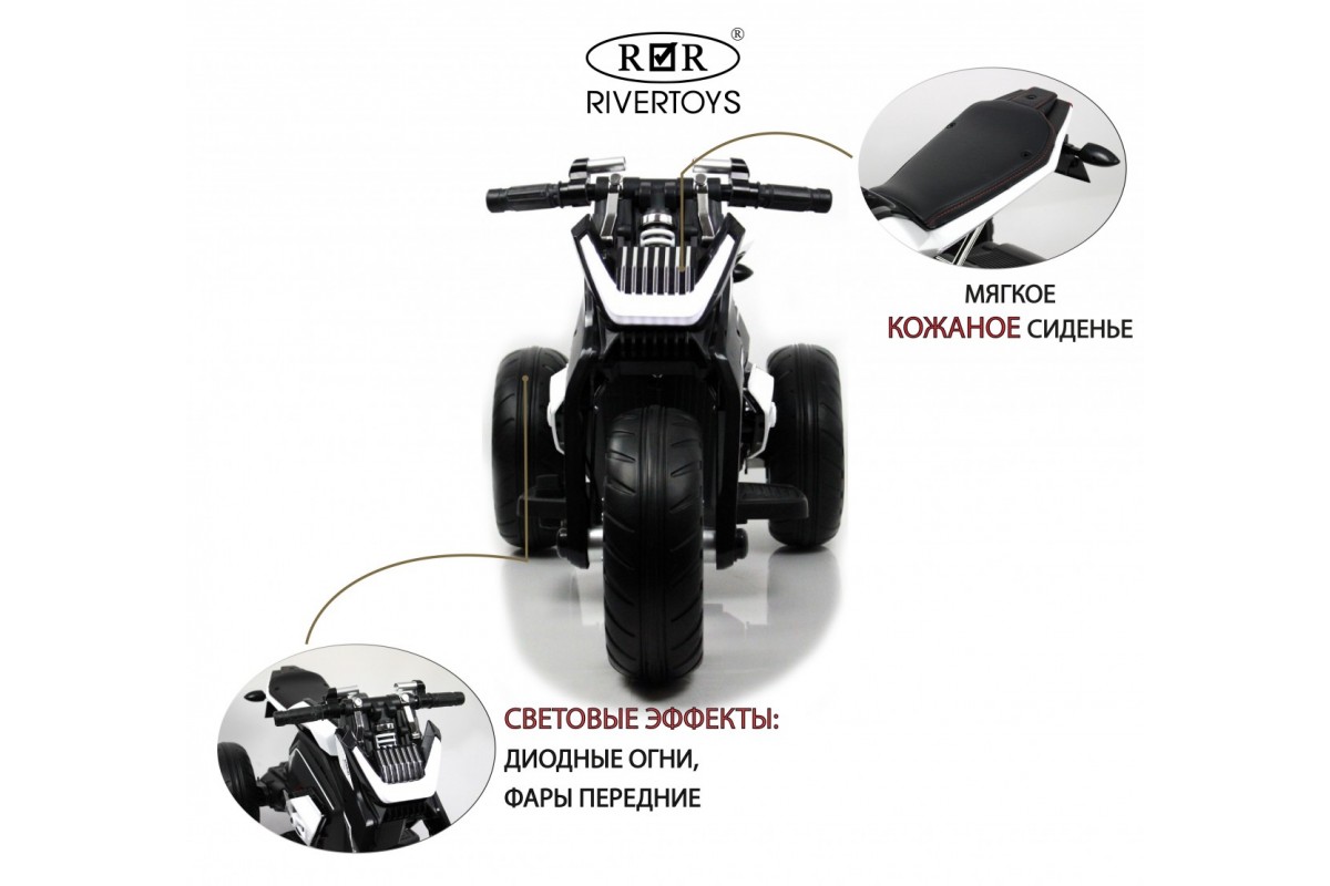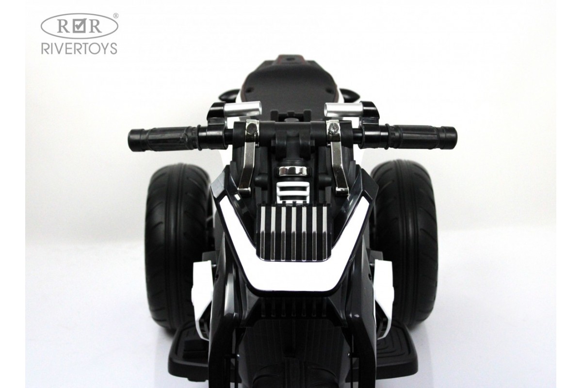 RiverToys X222XX – детский электротрицикл с устойчивой конструкцией, которую обеспечивают 3 колеса. Они выполнены из каучука и имеют светодиодную подсветку. предусмотрены приставные колеса, которые будут полезны для начинающих гонщиков, а потом их можно будет снять. Передние фары светодиодные.