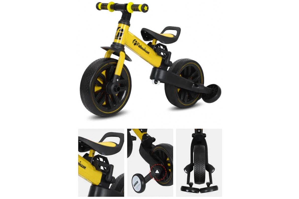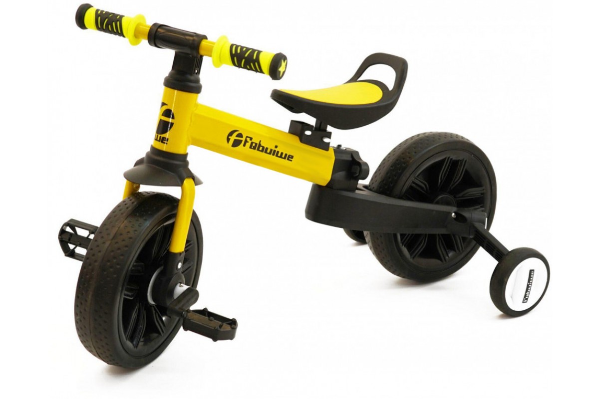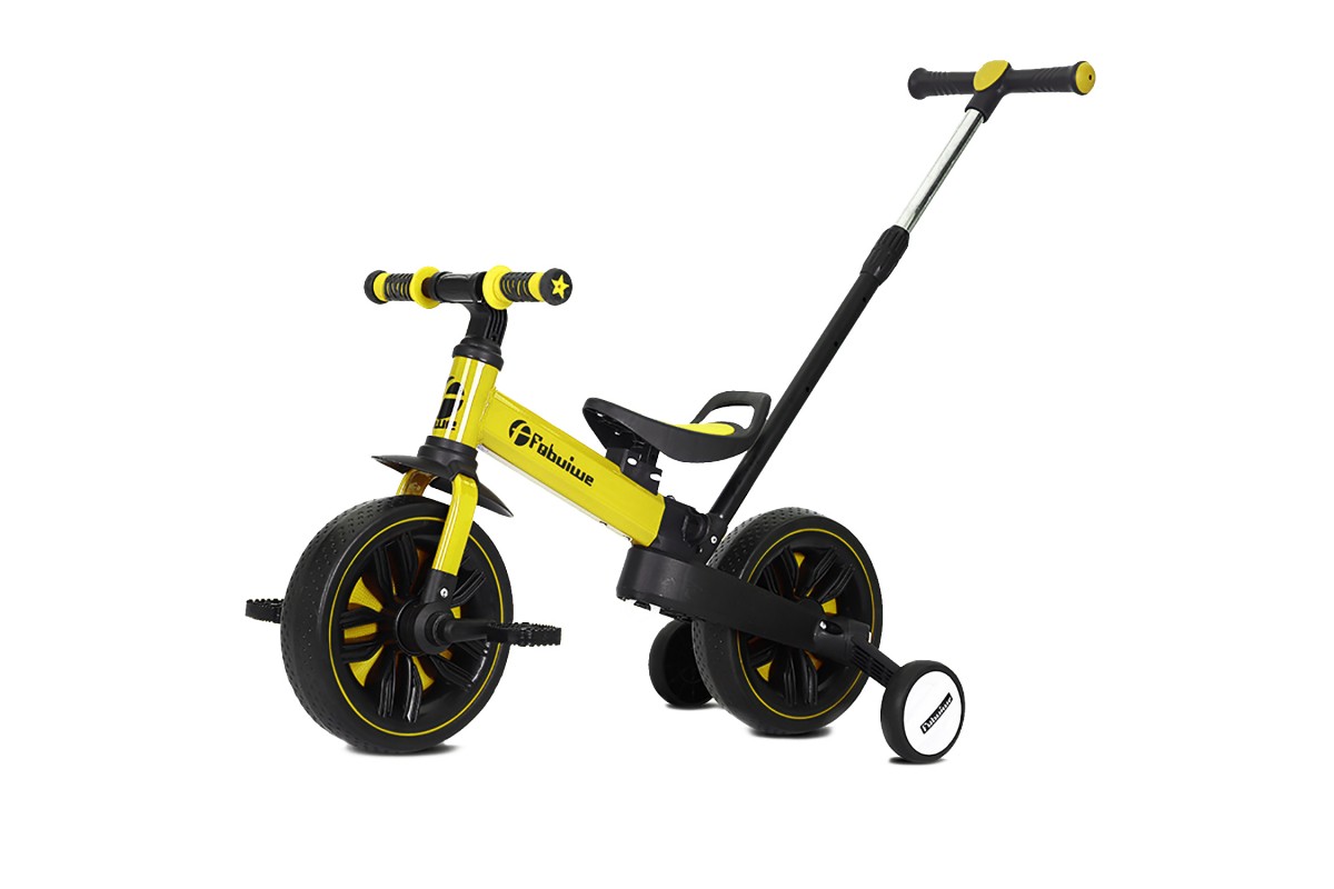 Детский велосипед-беговел 4 в 1 Fobuiwe 110 с родительской ручкой - FB-110-PLUS-YELLOW - это трехколесный велосипед-беговел с родительской ручкой, который оснащен съемными педалями и подвесными задними вспомогательными колесами, поэтому его можно использовать, как беговел, а также, как обычный трехколесный велосипед с педалями. Благодаря родительской ручке взрослые поначалу могут помогать еще слабым ножкам привести в движение данную модель, но потом она помогает контролировать передвижение на опасных участках.