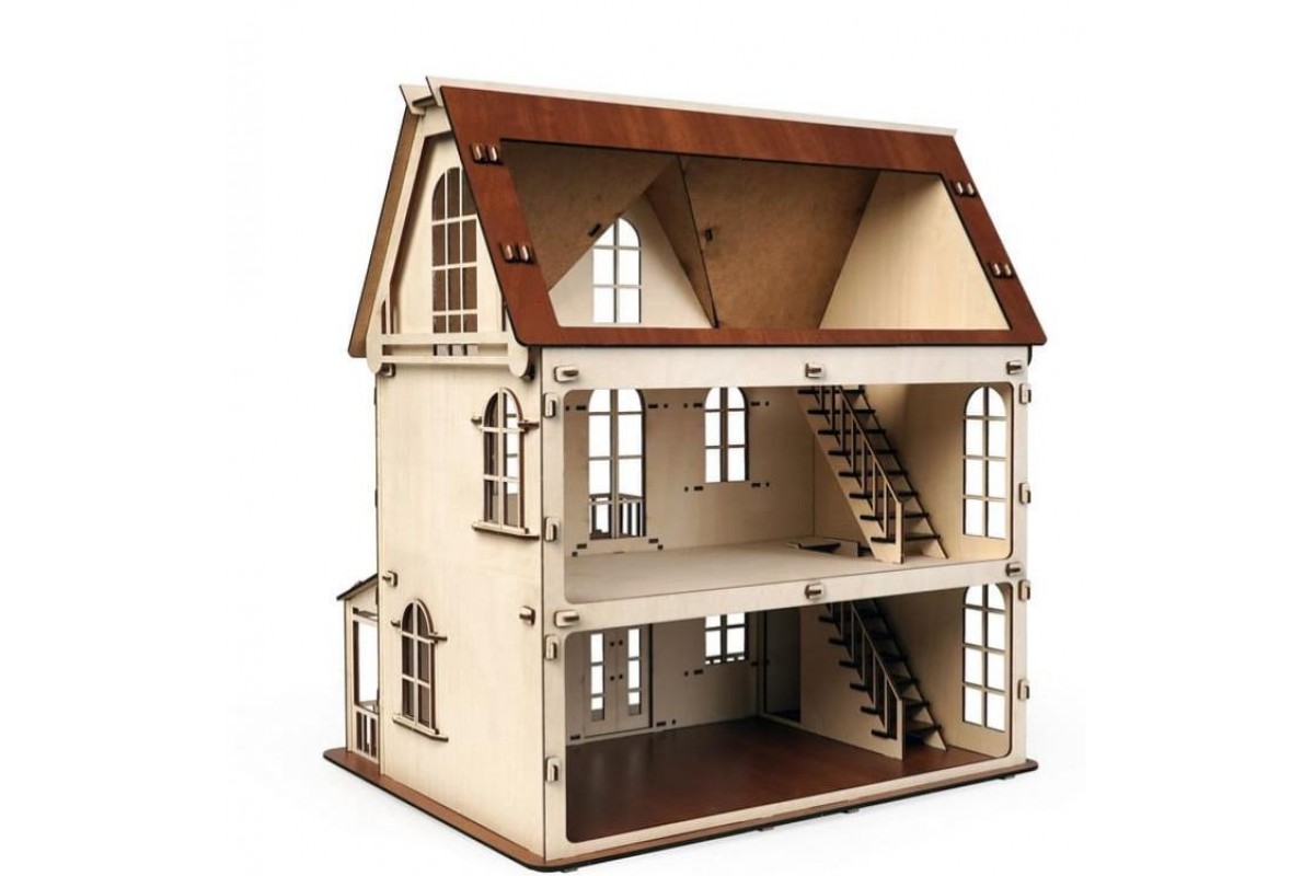 Домик выполнен из дерева (фанеры) и имеет бежевый цвет, что делает его уютным и приятным на вид.