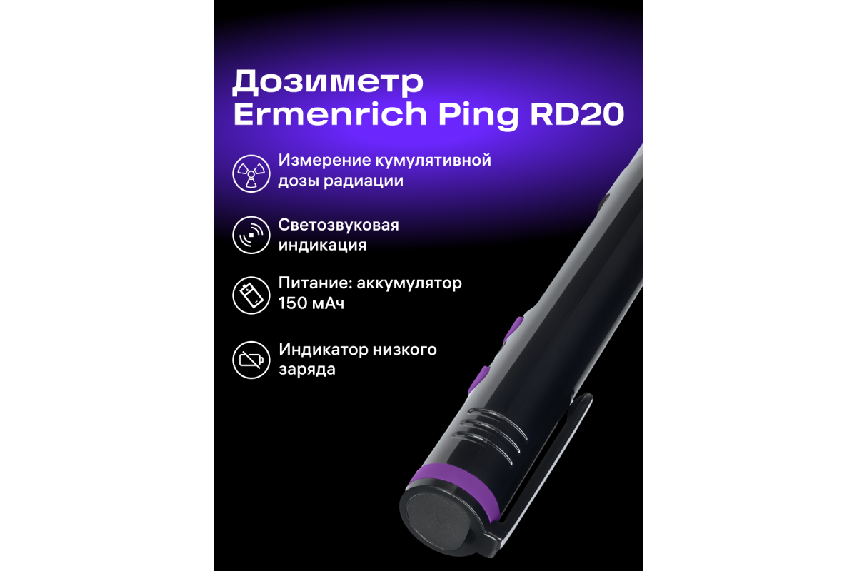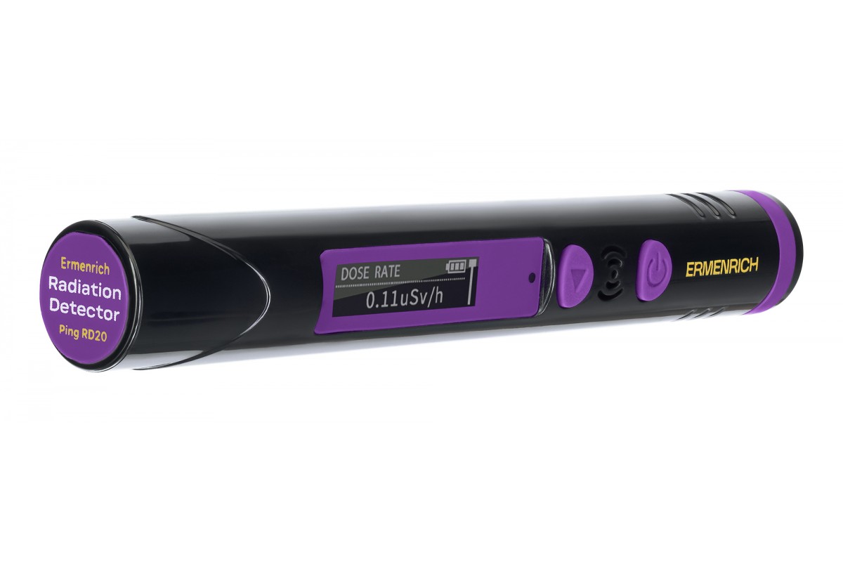 Дозиметр Ermenrich Ping RD20 совсем небольшого размера, но по функциональности не уступает обычным моделям. Он измеряет радиационный фон и помогает определить уровень гамма-, бета- и рентгеновского излучения в воде, продуктах питания, почве и различных объектах. В качестве датчика используется счетчик Гейгера-Мюллера. Диапазон измерения – от 0,05 мкЗв до 50 мЗв. Если допустимый уровень радиации будет превышен, дозиметр подаст сигнал звуком или светом.