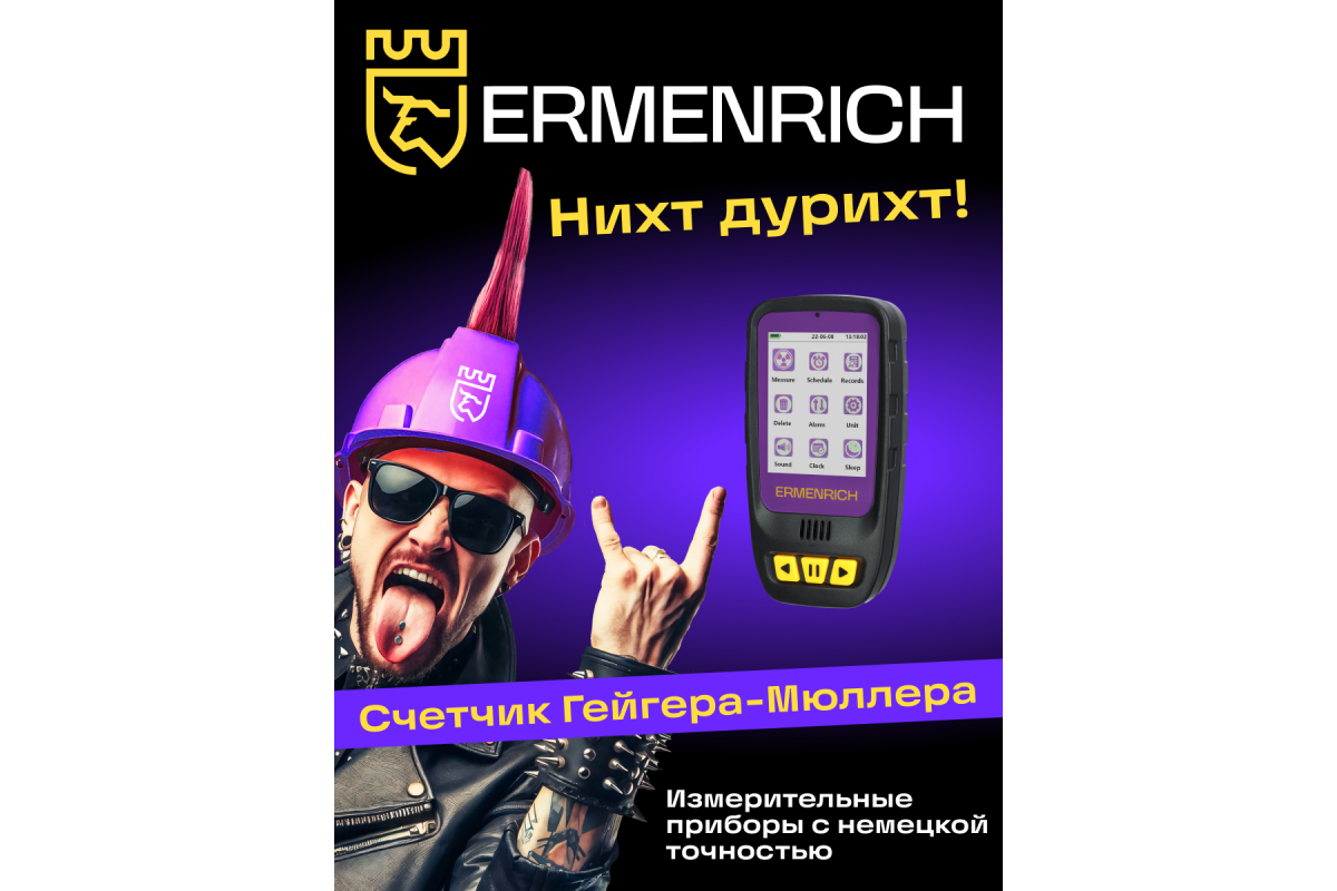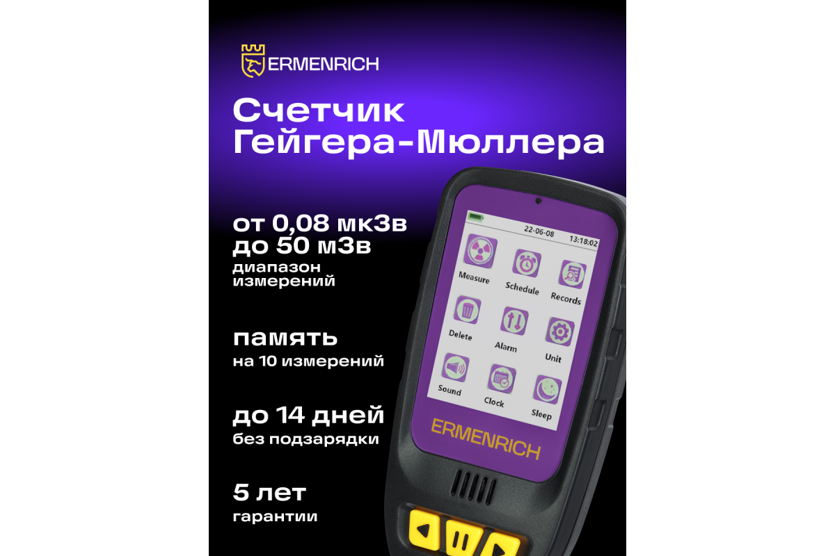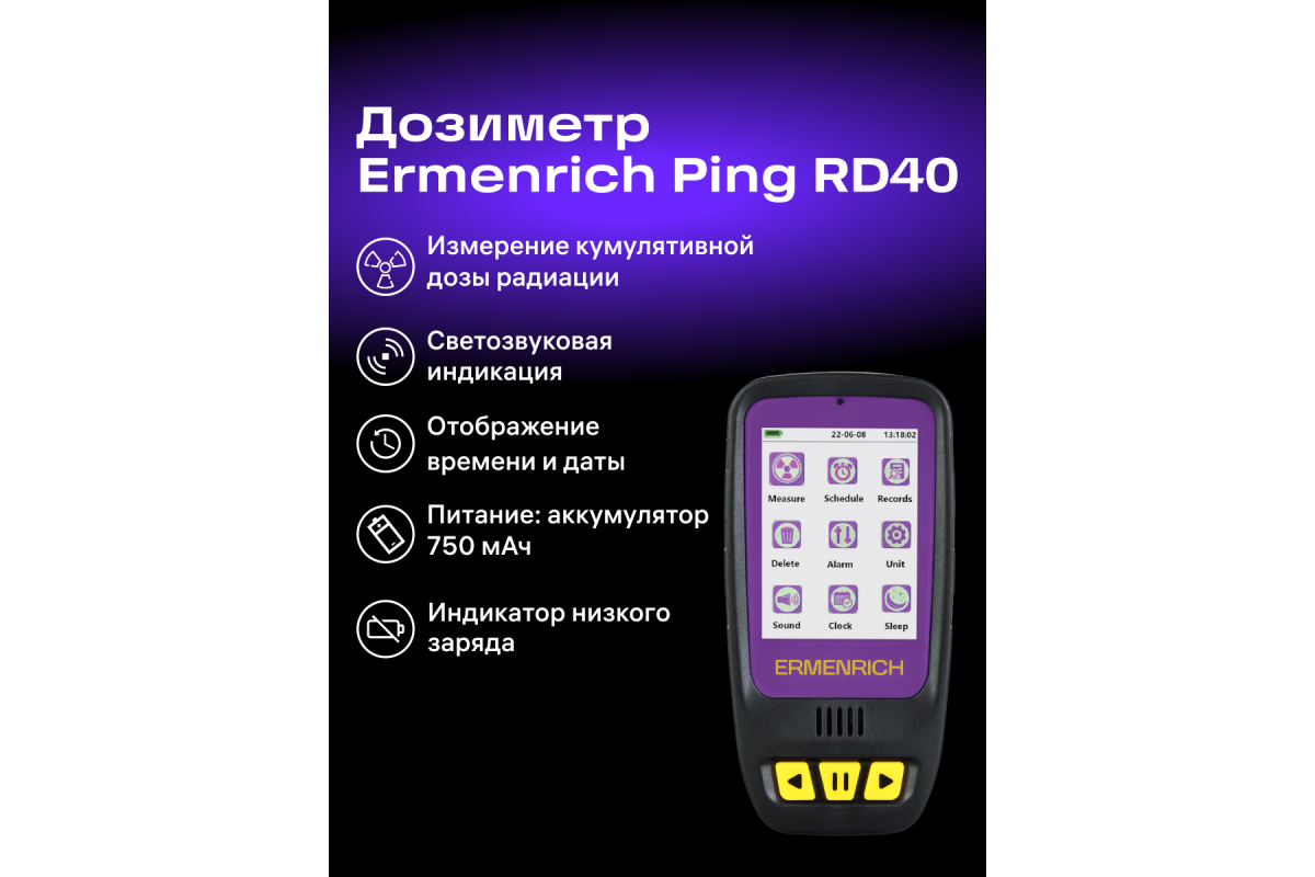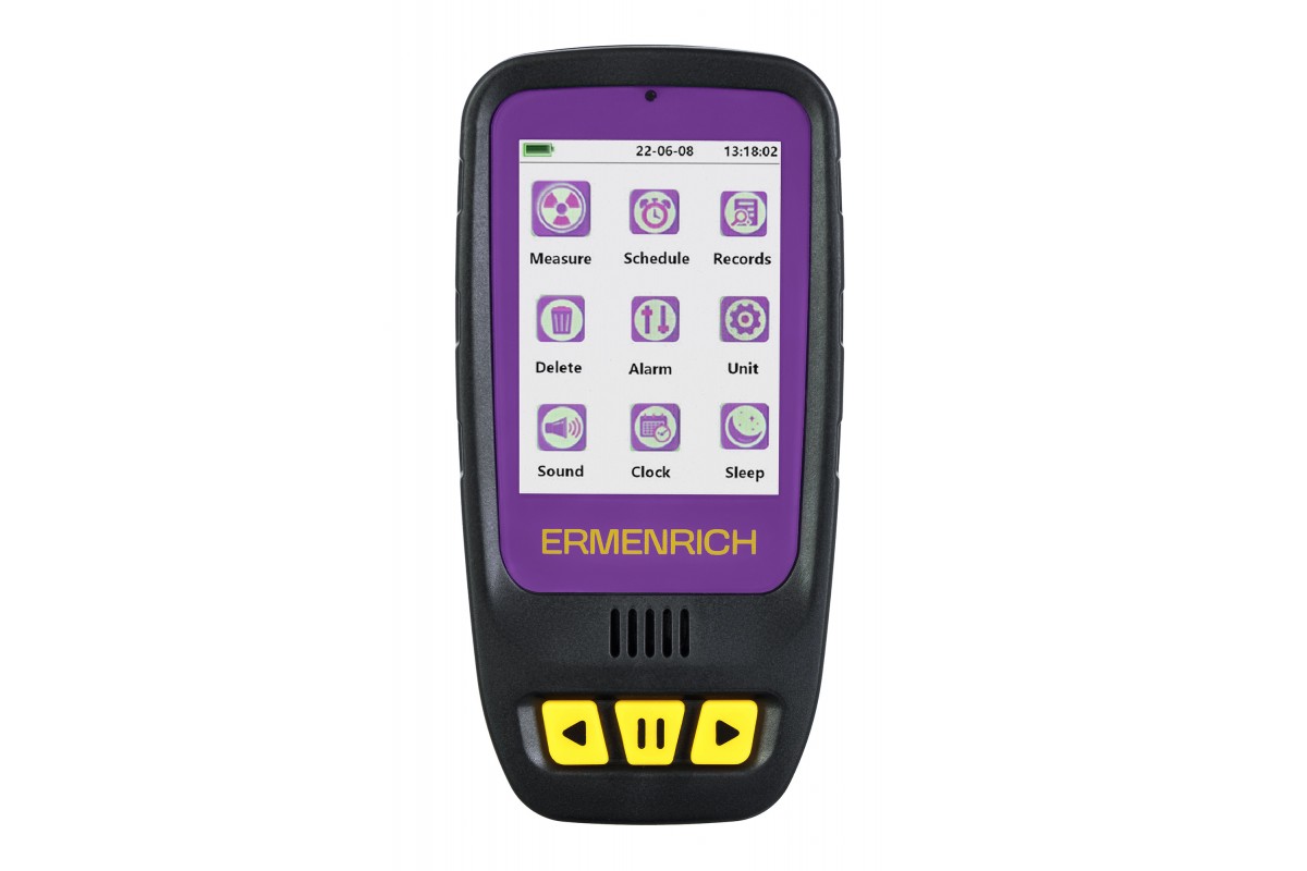 Дозиметр Ermenrich Ping RD40 измеряет гамма-, бета- и рентгеновское излучение в окружающей среде – воздухе, воде, продуктах питания, предметах обихода. Счетчик Гейгера-Мюллера считывает уровень излучения в диапазоне от 0,08 мкЗв до 50 мЗв меньше, чем за 10 секунд, а в случае опасно повышенной дозы – подает звуковой или световой сигнал.