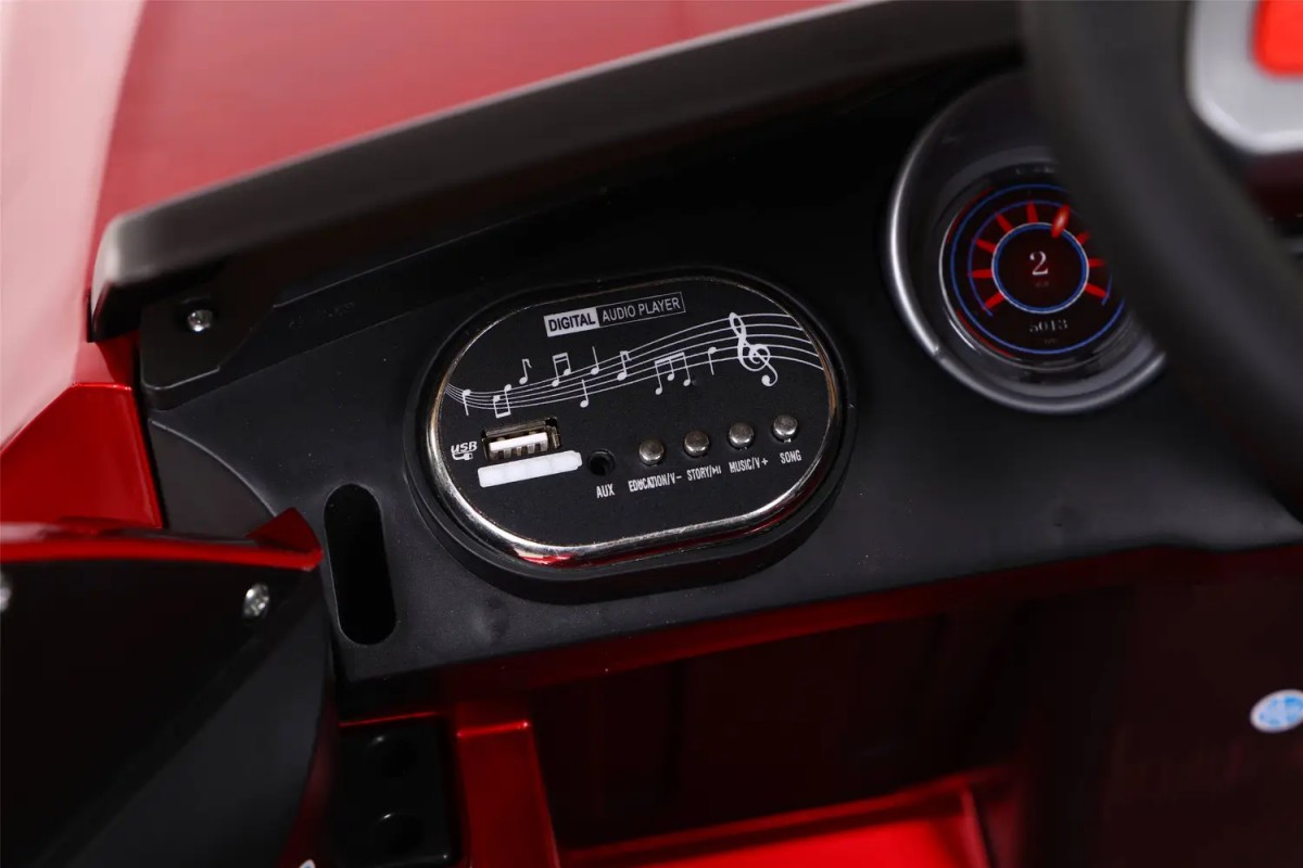 - Фары включаются, приборная панель подсвечивается, музыкальный руль и возможность прослушивания музыки со съемных носителей не дадут малышу заскучать в пути.