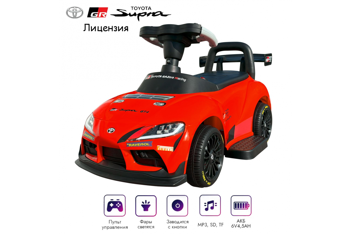 Электромобиль каталка Toyota GR SUPRA GT4 (6V, EVA, пульт) - SMT-519-RED - это каталка-электрокар, который создан по мотивам настоящего спорткара Toyota GR Supra GT4. Максимальная нагрузка - 20 кг!