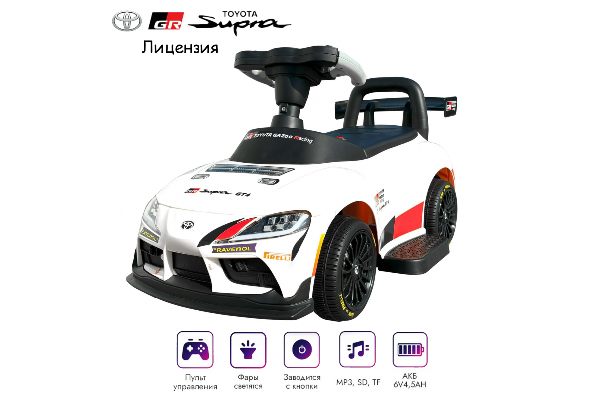 Электромобиль каталка Toyota GR SUPRA GT4 (6V, EVA, пульт) - SMT-519-WHITE - это каталка-электрокар, который создан по мотивам настоящего спорткара Toyota GR Supra GT4. Максимальная нагрузка - 20 кг!