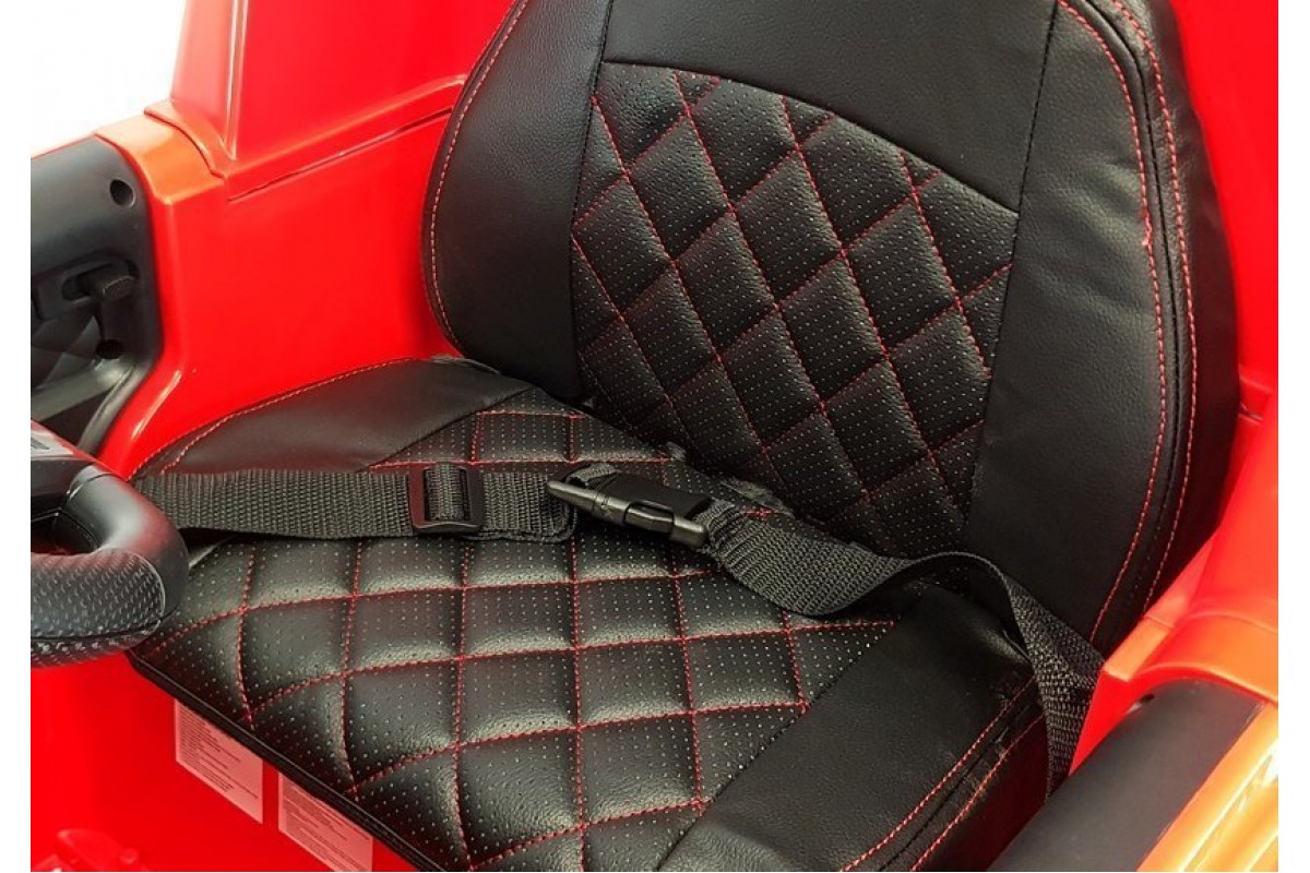 Дверцы автомобиля оборудованы окнами и замками, легко открываются и закрываются, поэтому ребенок может садиться и выходить из салона самостоятельно. Высокие борта и прочный ремень безопасности предохраняют маленького водителя от выпадения из машины и других травм. Водительское кресло из эко-кожи имеет эргономичную форму. Сиденье и спинка образуют единое целое, что гарантирует анатомически правильное положение тела ребенка и избавляет от дискомфорта даже во время длительной поездки.